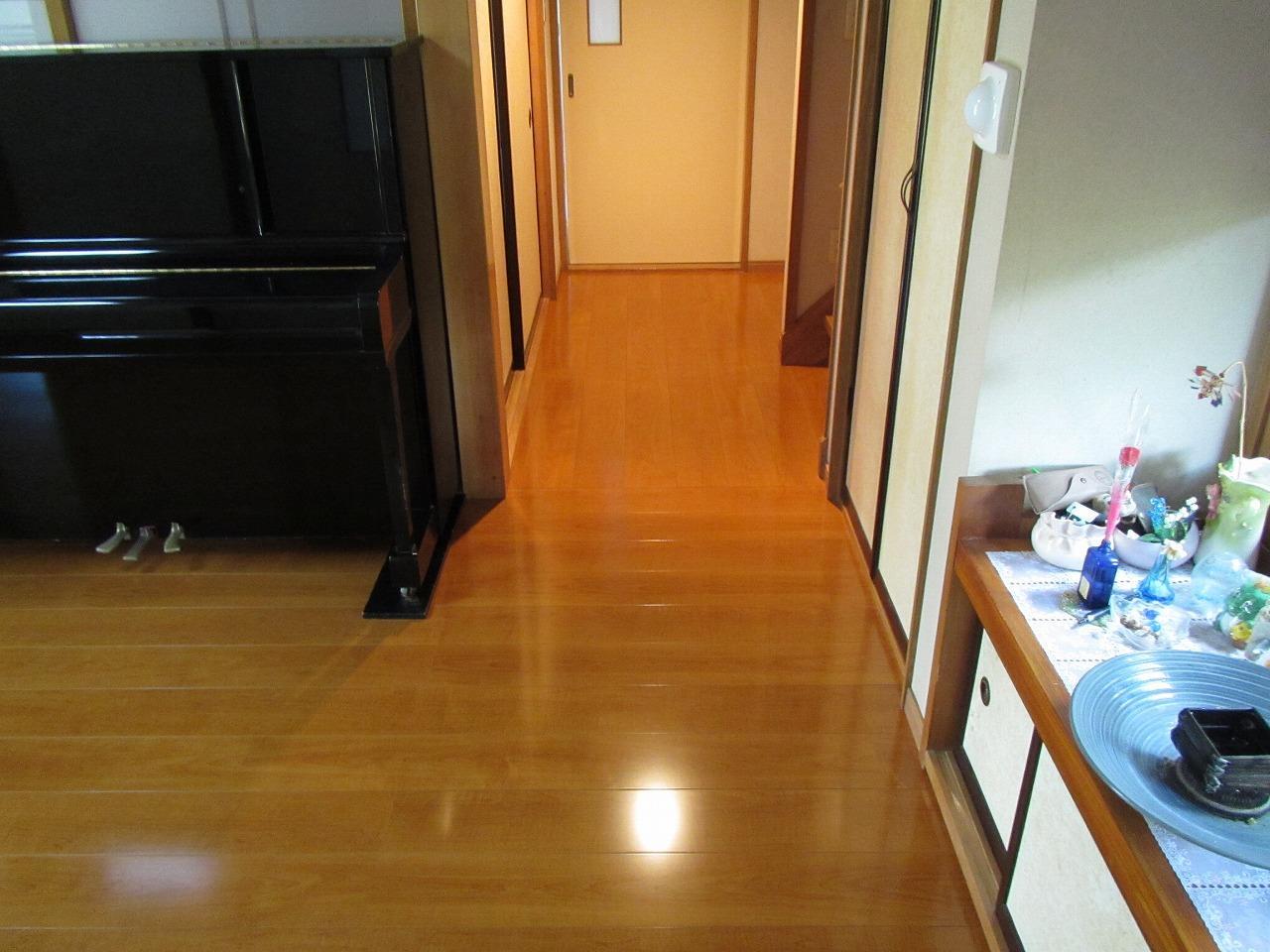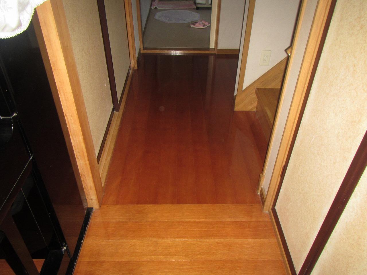お客様から廊下の床がフワフワするところがあるから見て欲しいとご相談をいただきました。純和風の風合いを損ねることのないよう床材の選定には気を配りました。お客様のイメージにも合って光沢のある高級感たっぷりの物を選びました。また猫ちゃんも居るそうなので傷にも強いコーティングが施されています。実際の仕上がりもばっちり和風に合っていると思います。