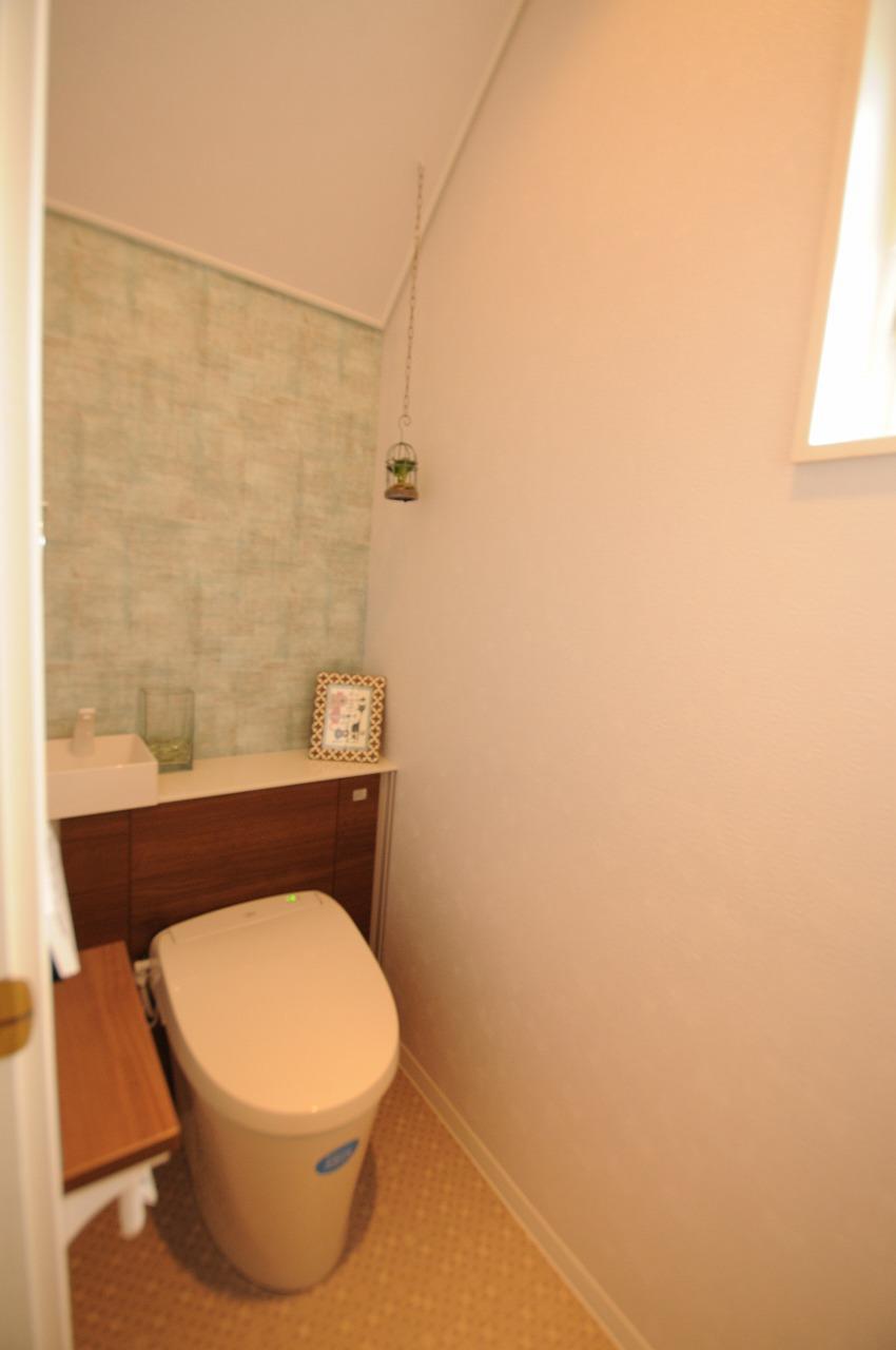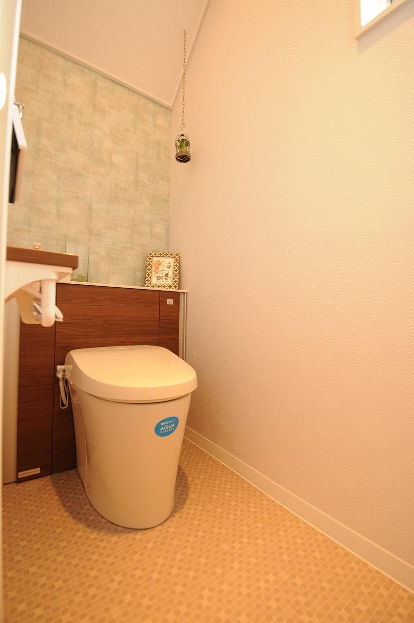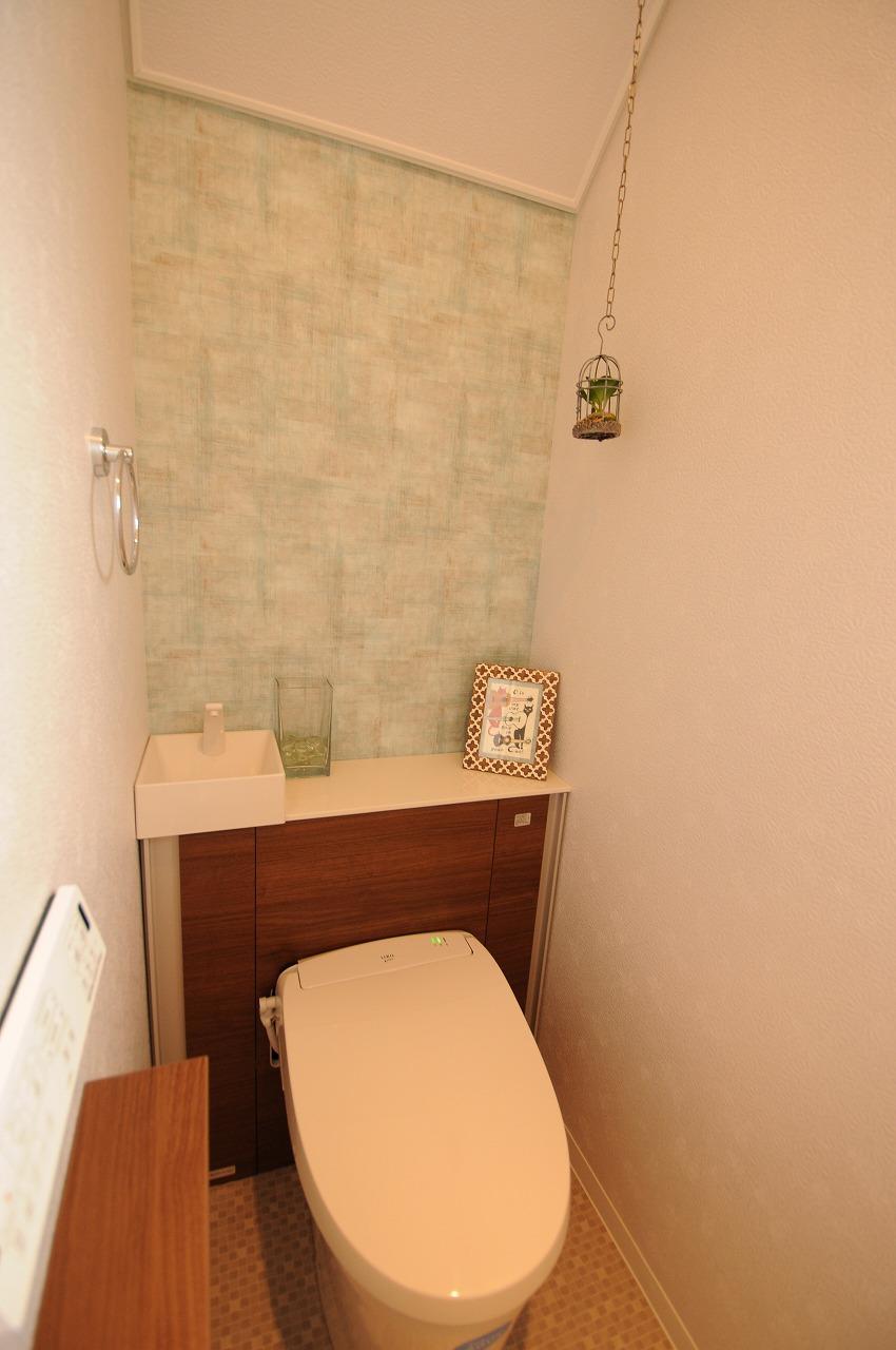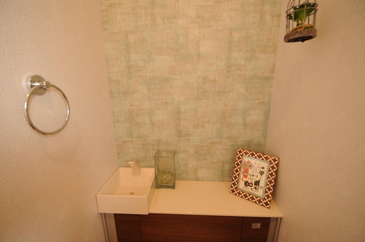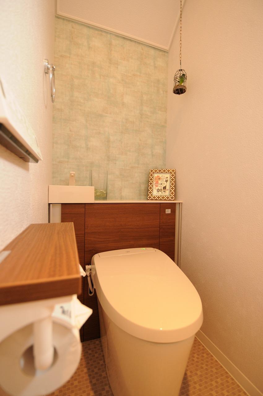 「大人可愛い」をテーマにして奥様とのやり取りを進めてきました。アクセントクロスにも悩みましたが、奥様が決めてくださいました。もちろん機能性も大切なポイントでもあり、「アクアセラミック」の便座には大変気に入っていただけました。