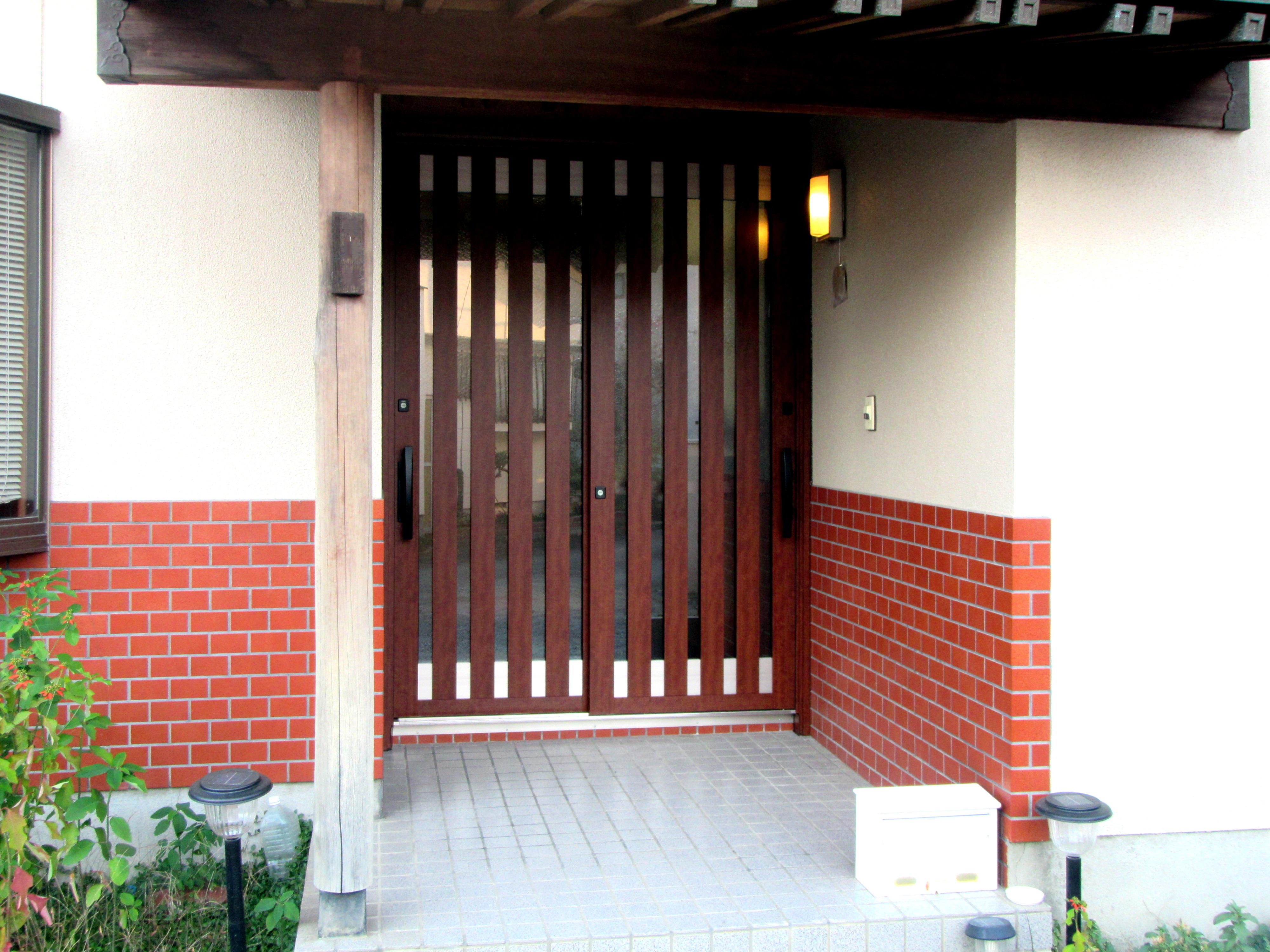 赤みある木目調(ポートマホガニー)の引違い戸で玄関の雰囲気がとても明るくなりました!ランマ部分までの大きな戸で重厚感ある立派な「家の顔」にリニューアルできました!