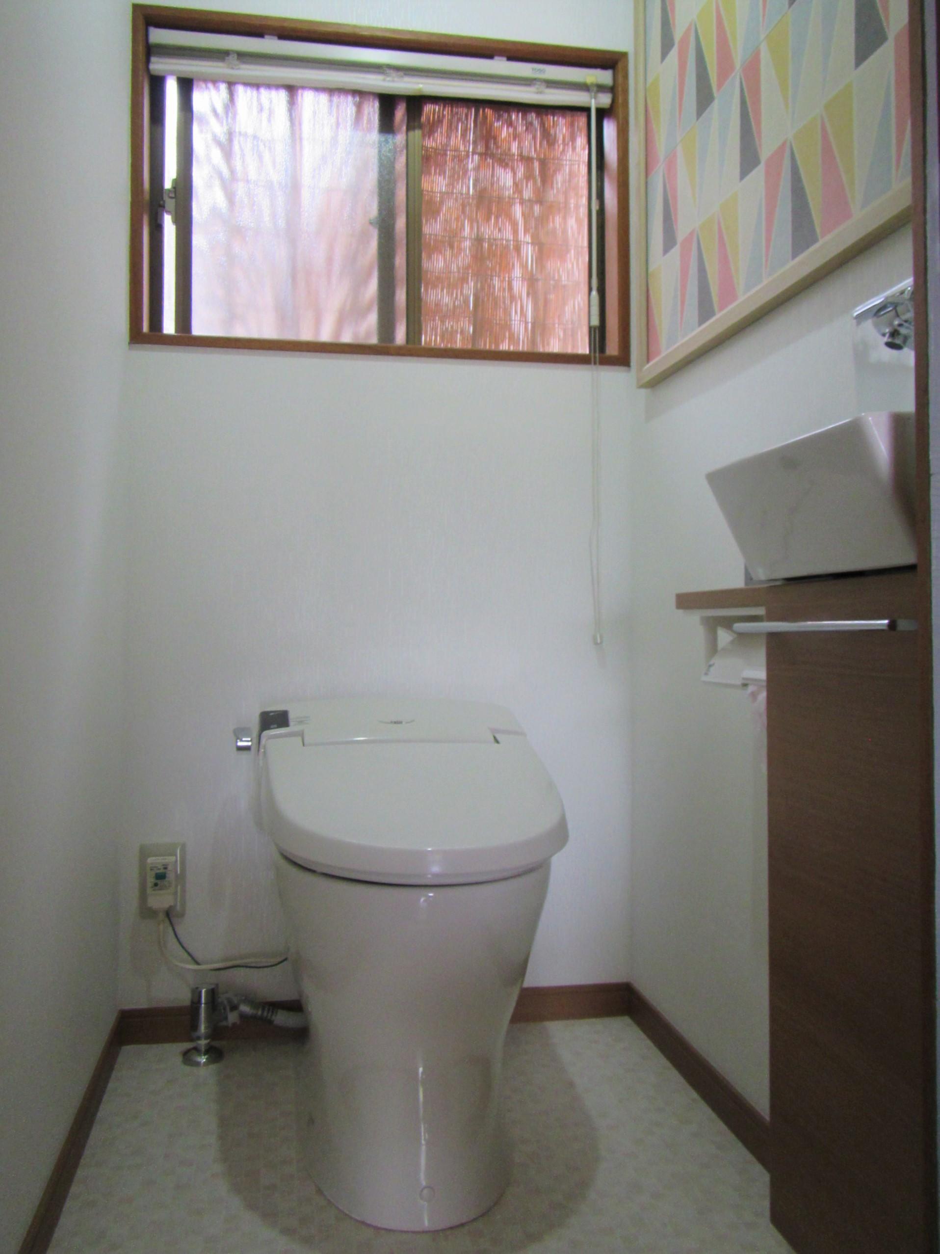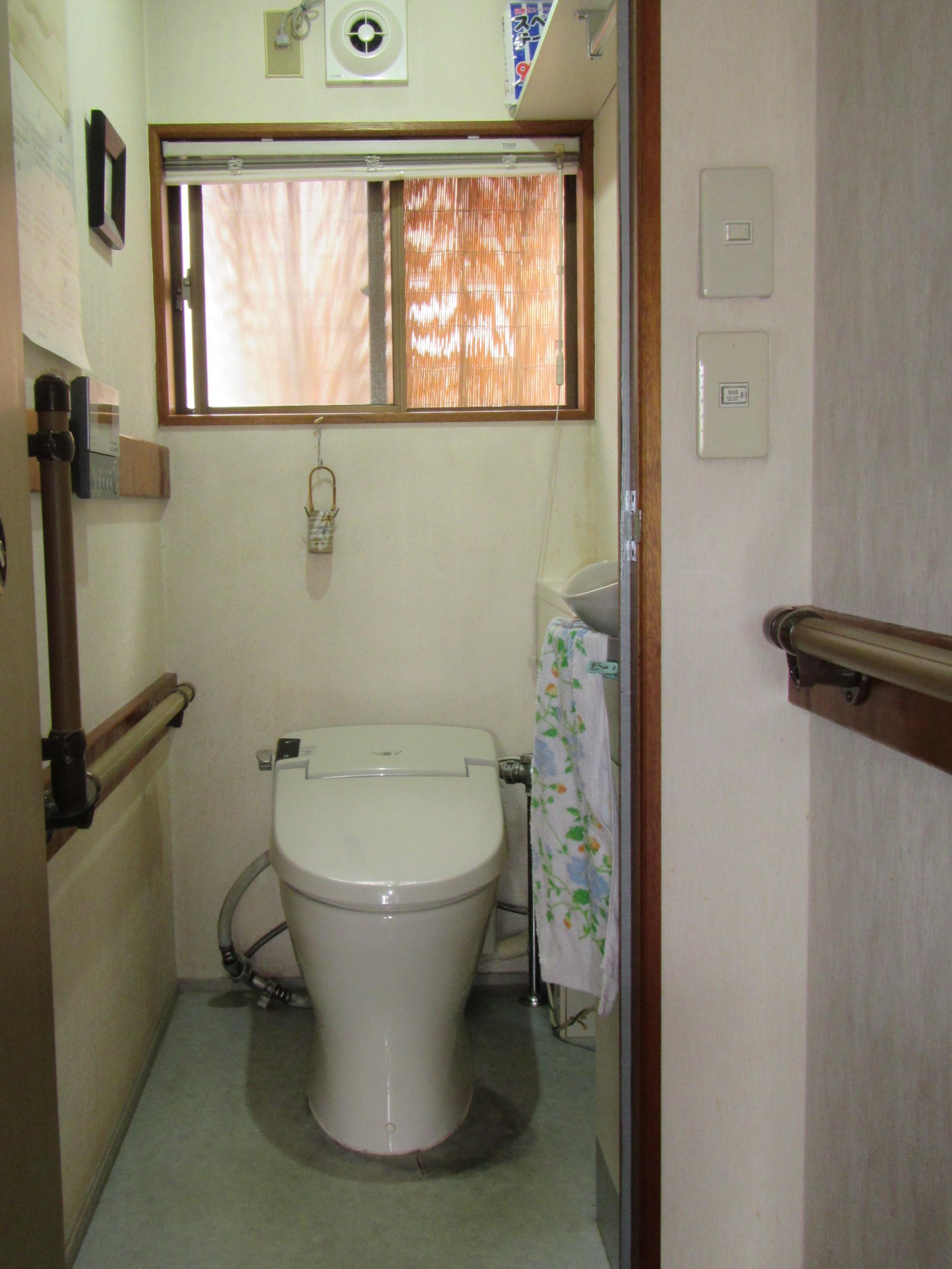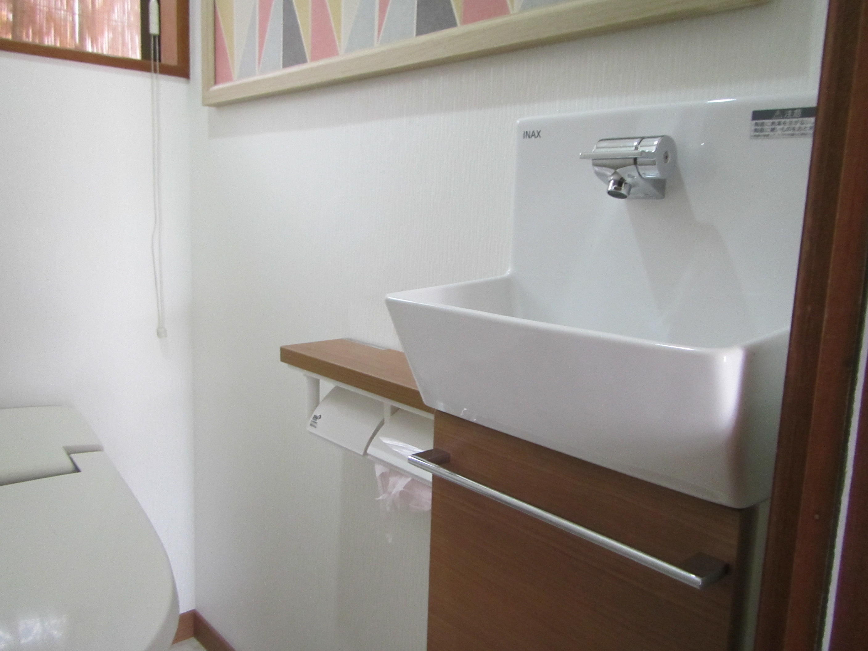 既存のトイレはそのまま使うということで、床板の貼替と内装、手洗いを交換しました。使っていない手すりは撤去し、壁カウンタータイプの給排水も撤去してスッキリしました。