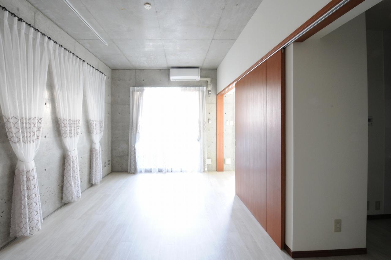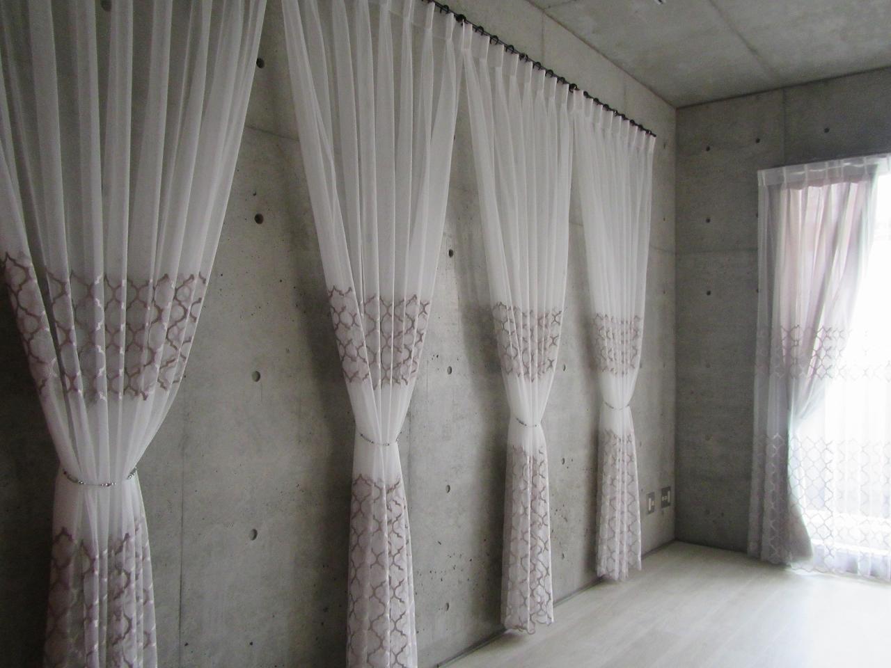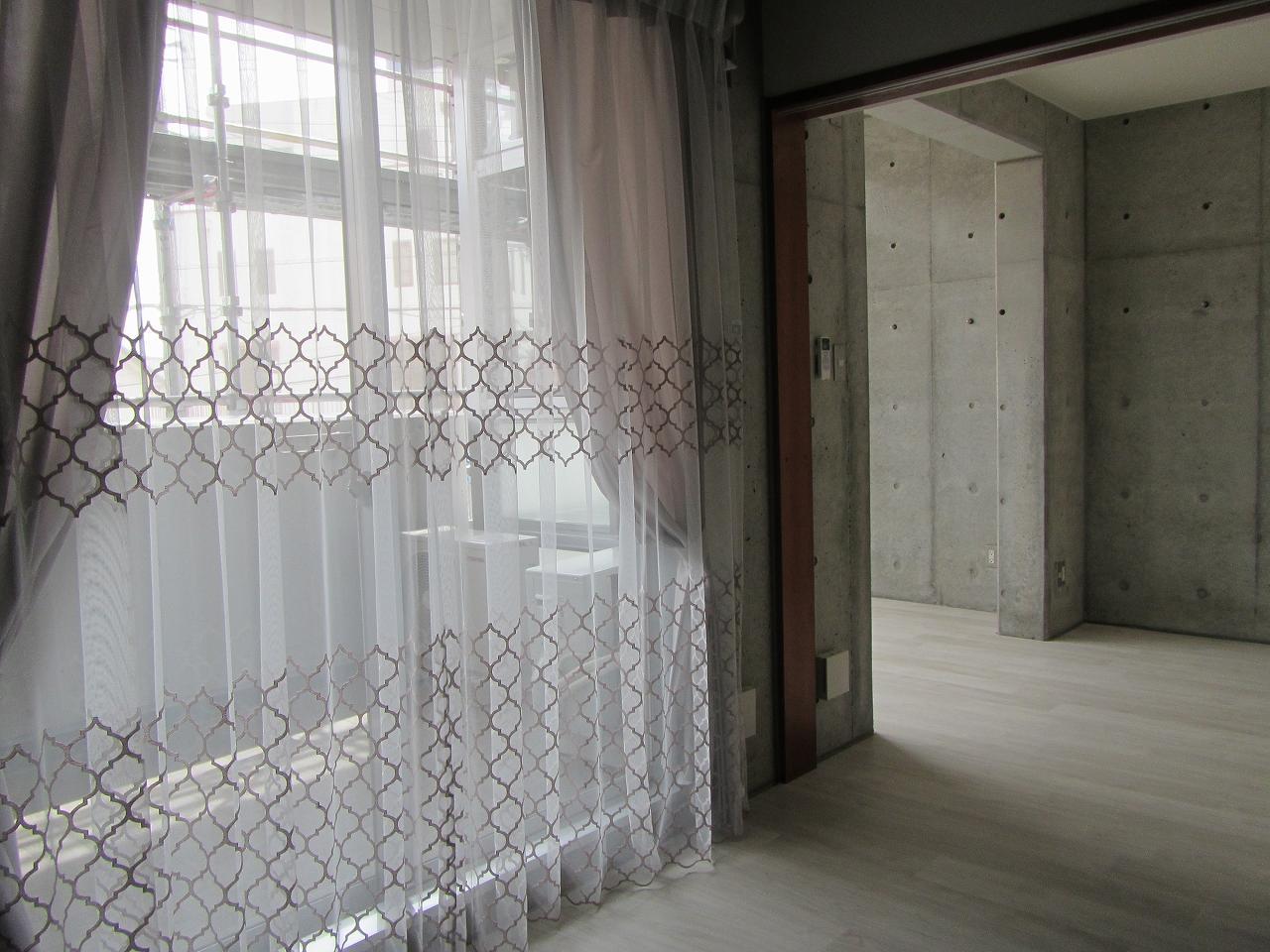 甲府市の内部装飾リフォームが完成しました! コンクリートの打ち放しで無機質だった空間をエレガントにカーテンで装飾。 床もアッシュ系のフローリング柄にリニューアル!