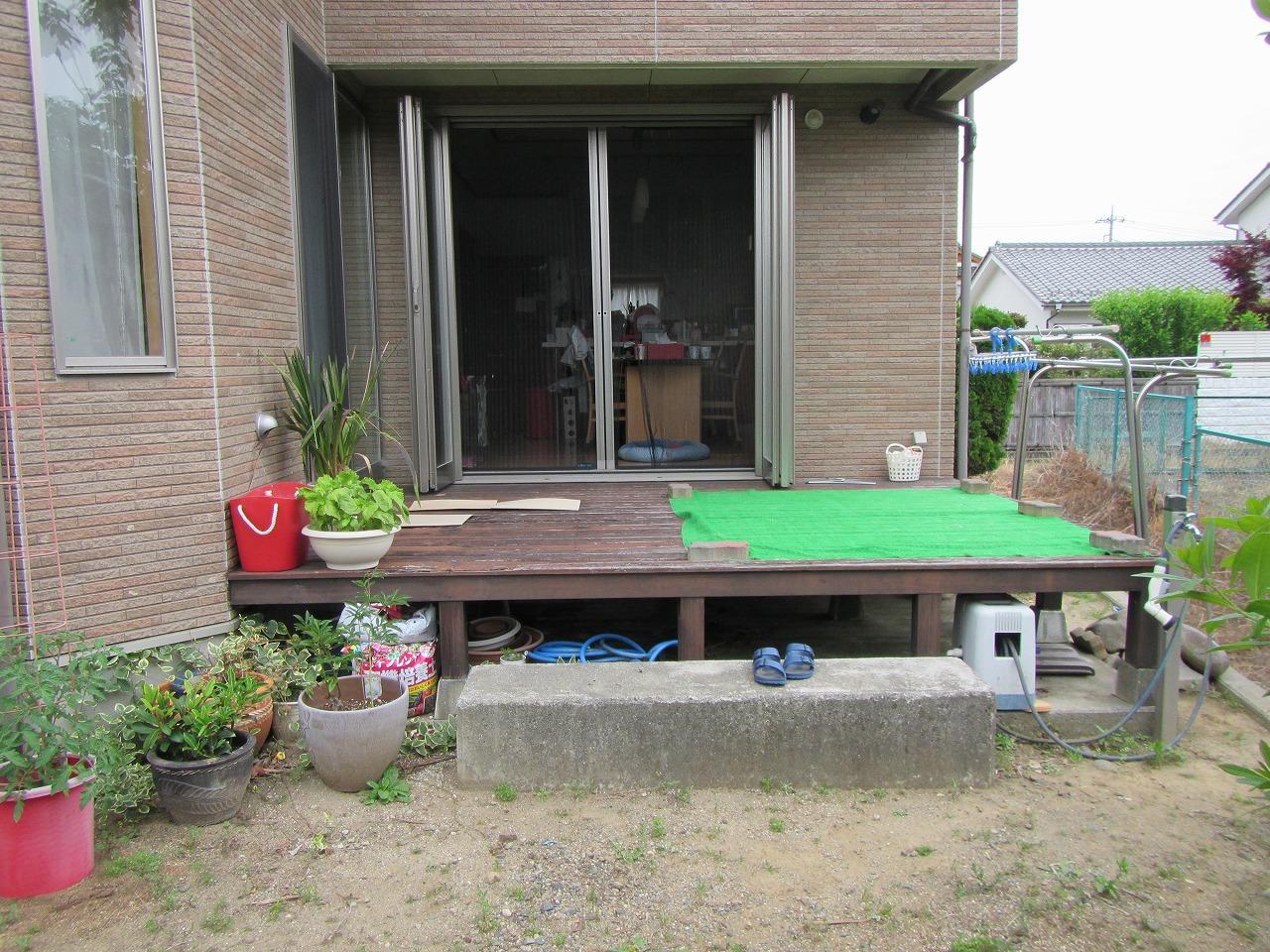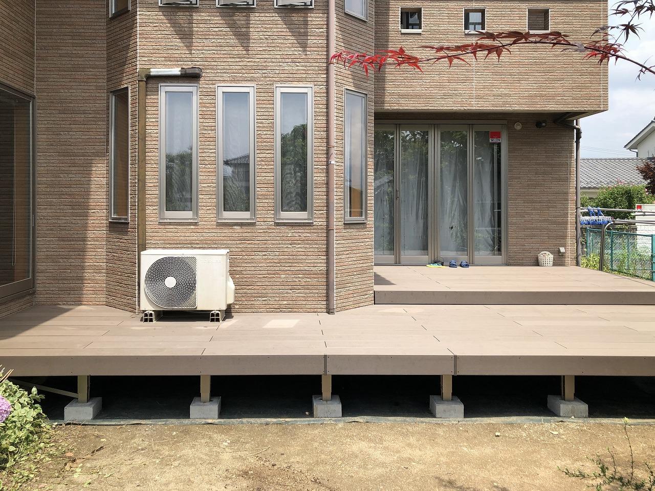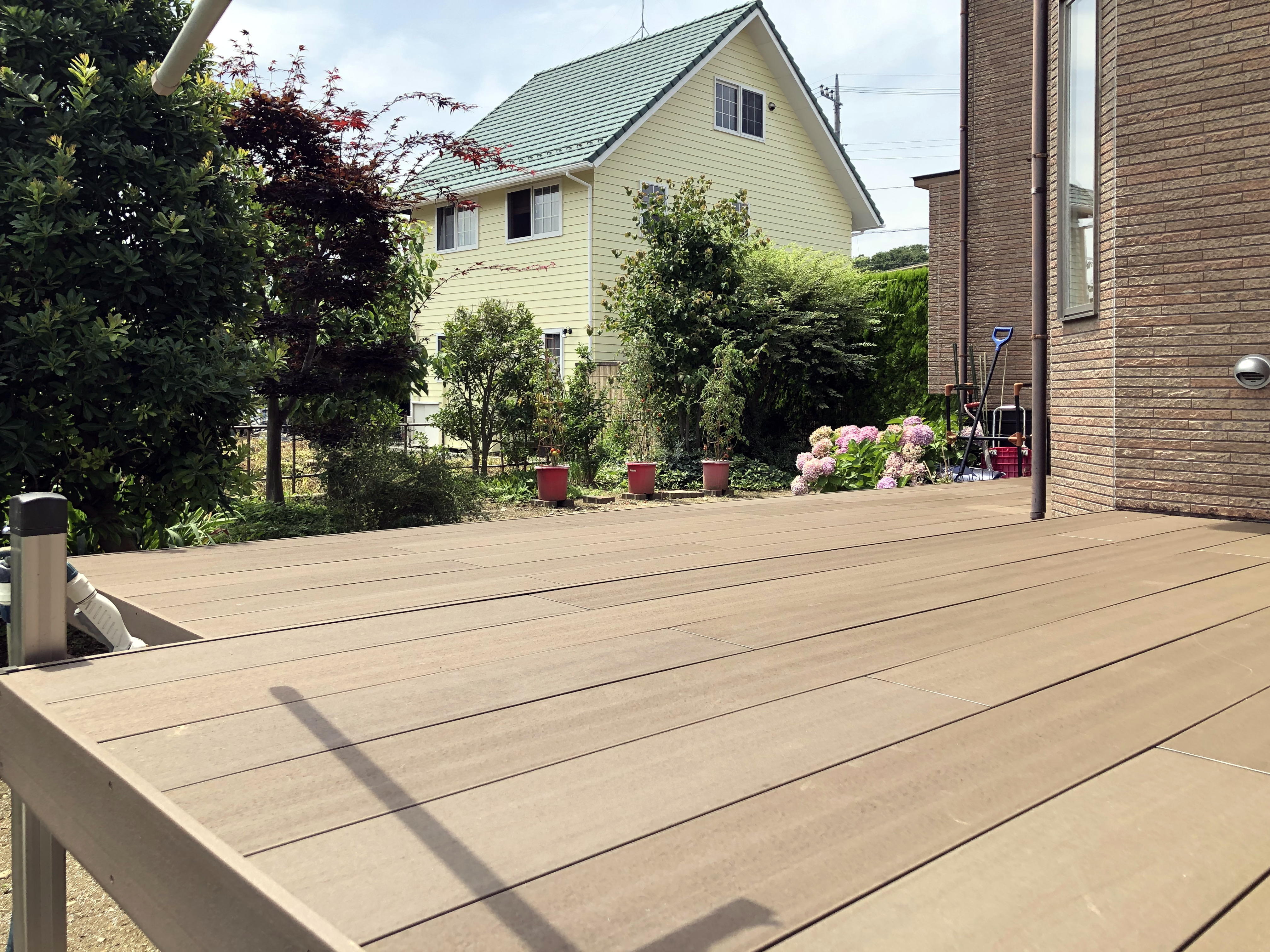 天然木のウッドデッキが経年劣化により危険な状態になったのがきっかけ。メンテナンスフリーのウッドデッキにリニューアルしひろびろ拡張!お部屋とお部屋をつなぎ回廊としても利用できる便利動線となりました!