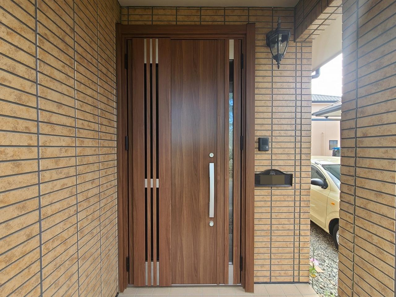 弊社の『住まいメイト』という定期的にOB客様のお宅を訪問させていただいているスタッフが、玄関ドアのアルミの汚れや剥げ、鍵の掛かりにくさを相談されたのをきっかけに玄関ドアの交換をさせていただく事になりました。 1日で工事が完了する『1DAYリフォーム』の定番『カバー工法 リシェント』を採用していただきました。 明るい木目で、お宅のサイディングの色とのコーディネートもばっちりですね!
