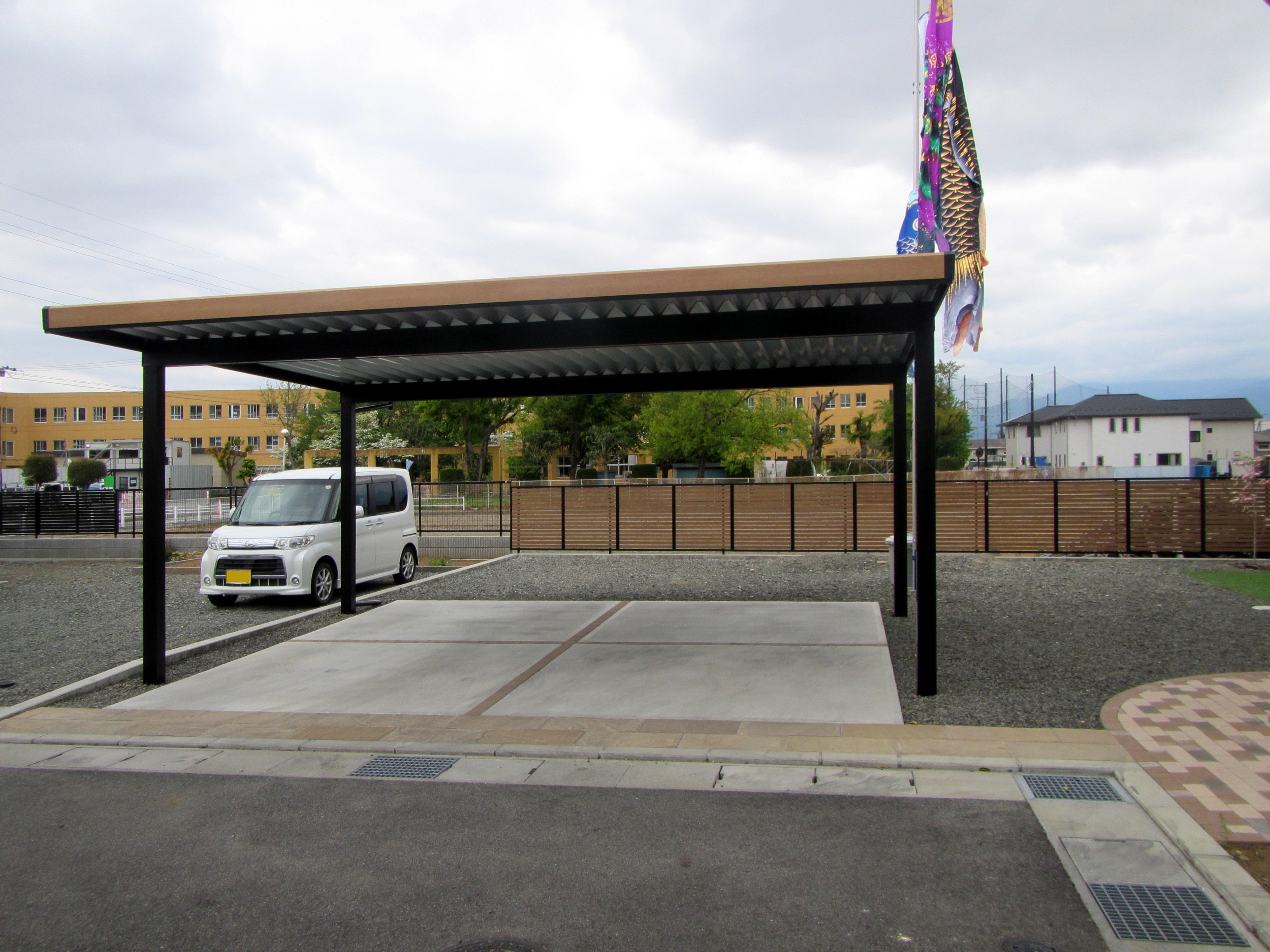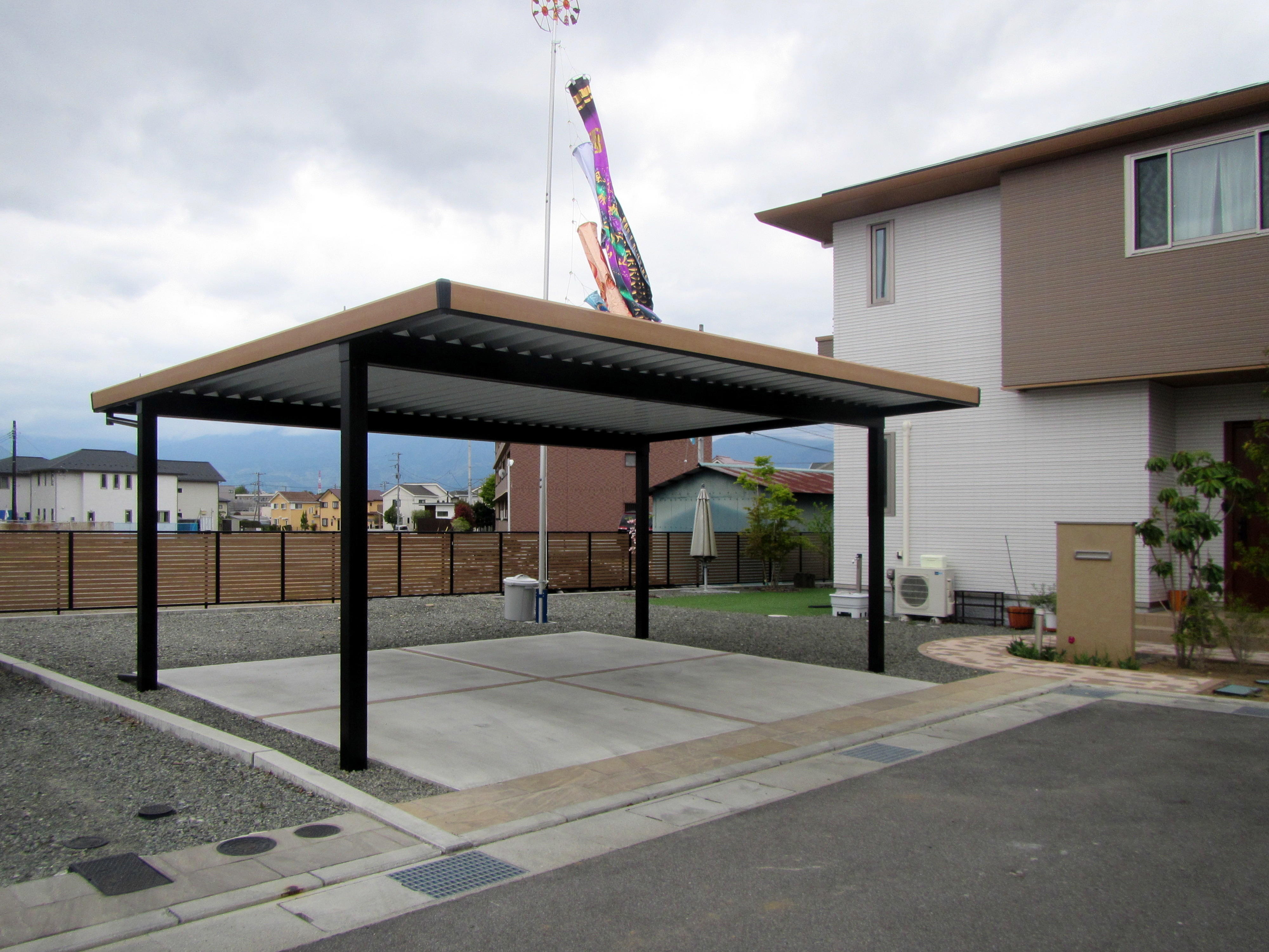 甲斐市の外構工事が完成しました! お住まいの雰囲気に合わせてカーポートとフェンスを木目柄でコーディネート。 工事中、駐車にご配慮いただきありがとうございました。おかげでスムーズに工事進行出来ました。