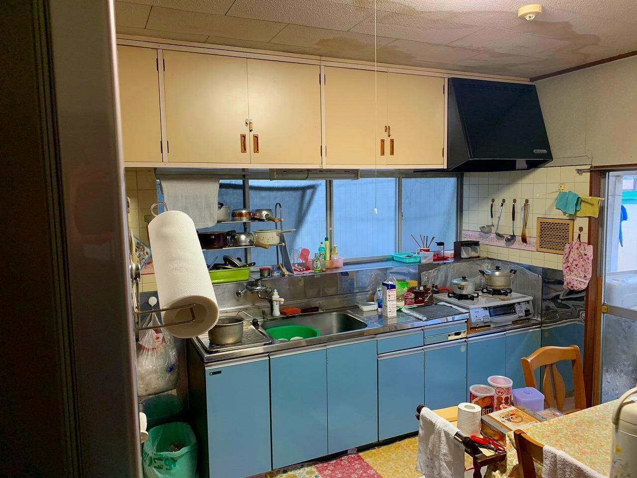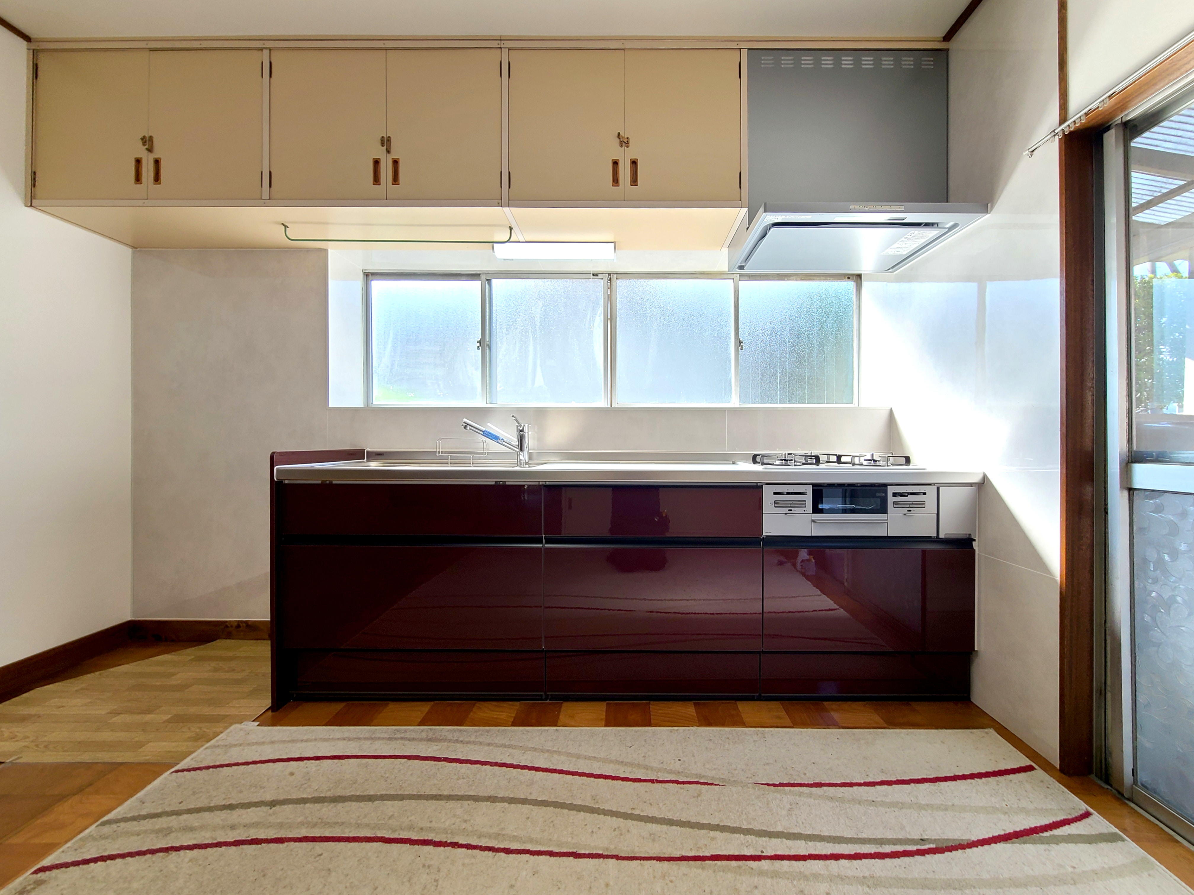 華やかさと気品あるカッパーレッドのシステムキッチンの上部には 面倒だったお手入れを技術の力でカンタンにしたLIXIL[よごれんフード]を設置しました。 吊戸棚はお客様のご要望により再利用。 壁や天井はビニールクロスで仕上げてお部屋全体が明るくなりました。