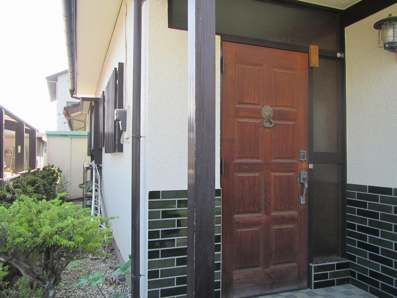 変則形の玄関でしたが袖ガラスと欄間ガラスはそのままでドアのみ取替。 既存部分との調和もとれてキレイな玄関ドアにリニューアル!
