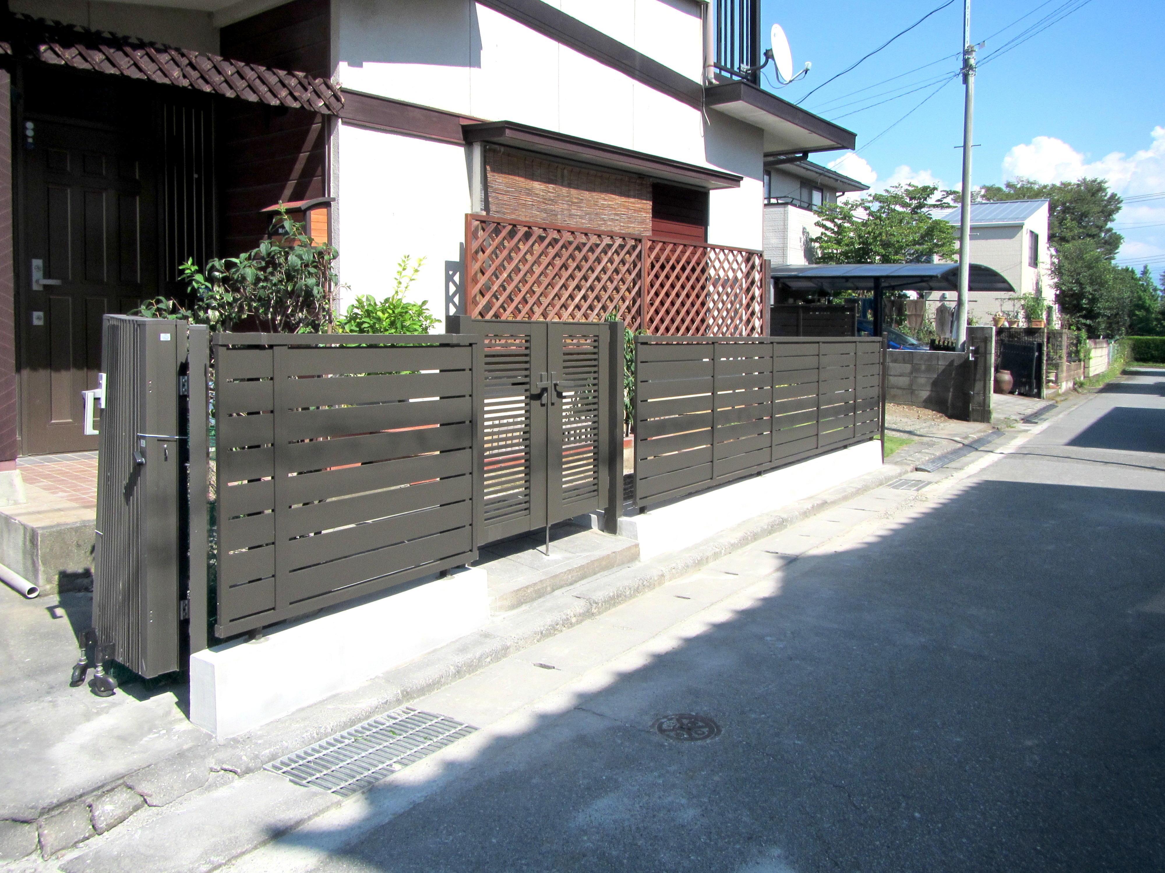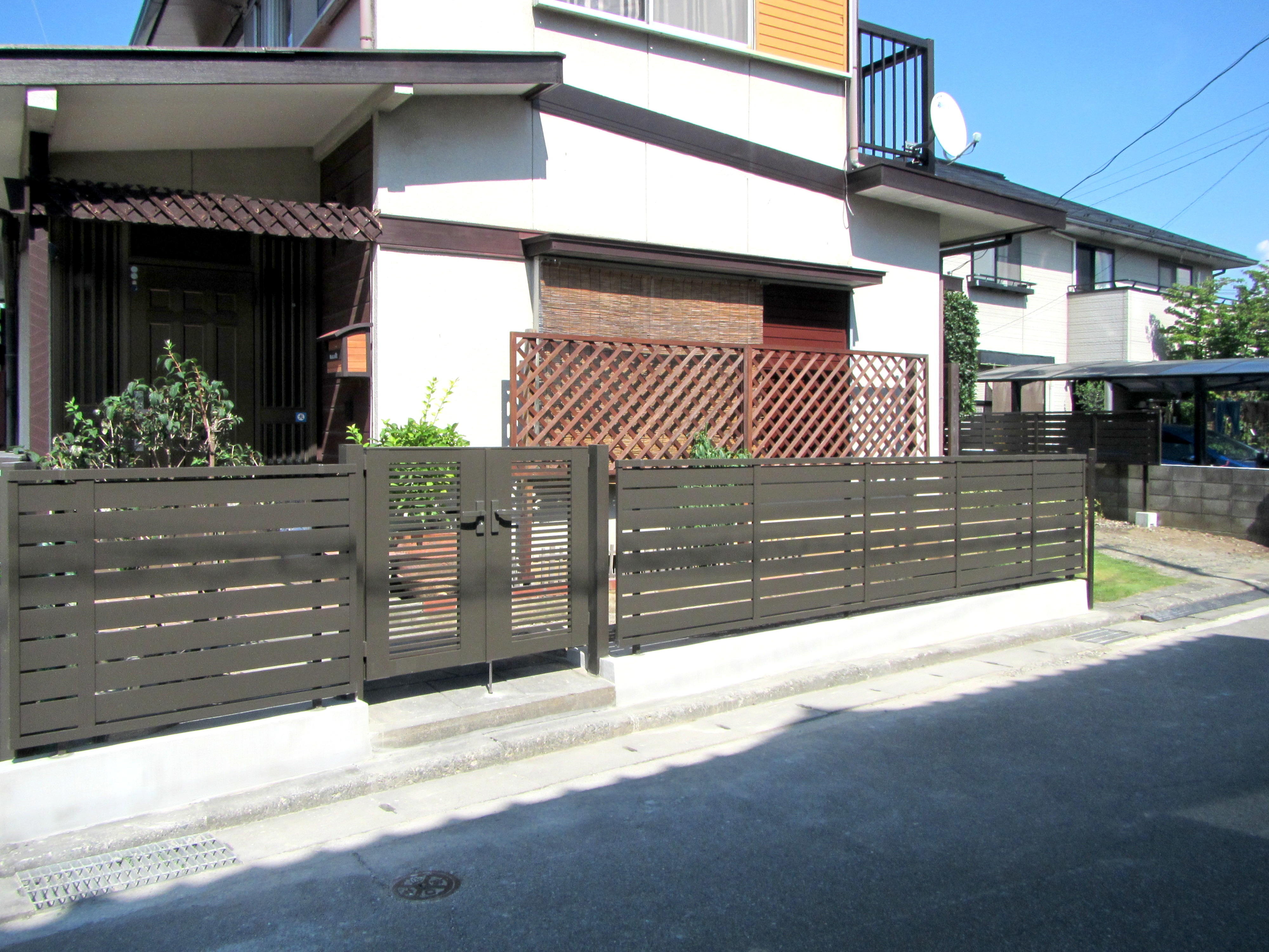 高く積まれたブロック塀が経年劣化により倒れて危険かもしれない。 そのおもいからルーバーフェンスを設置しました。 門扉も一新してスッキリ、雰囲気のよいファサードになりました。