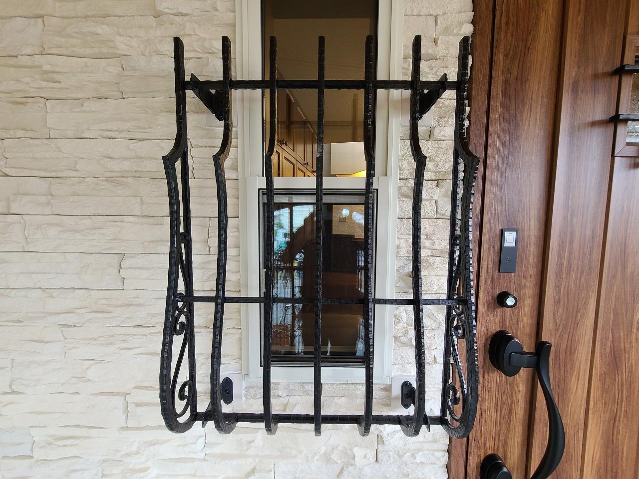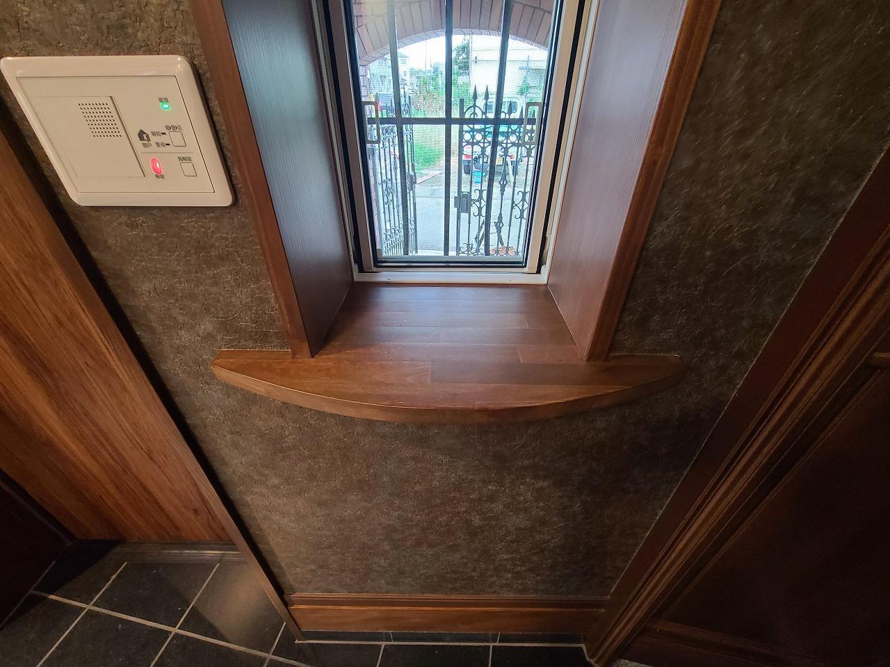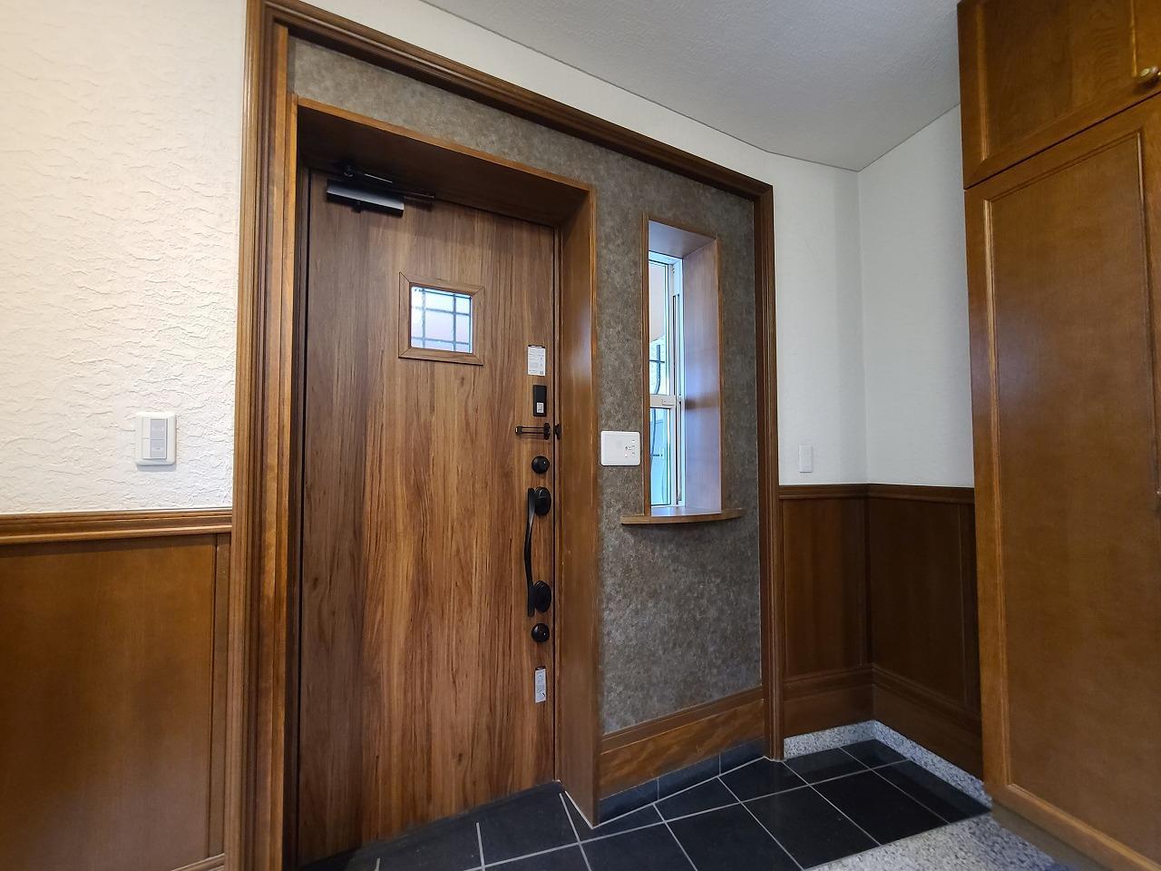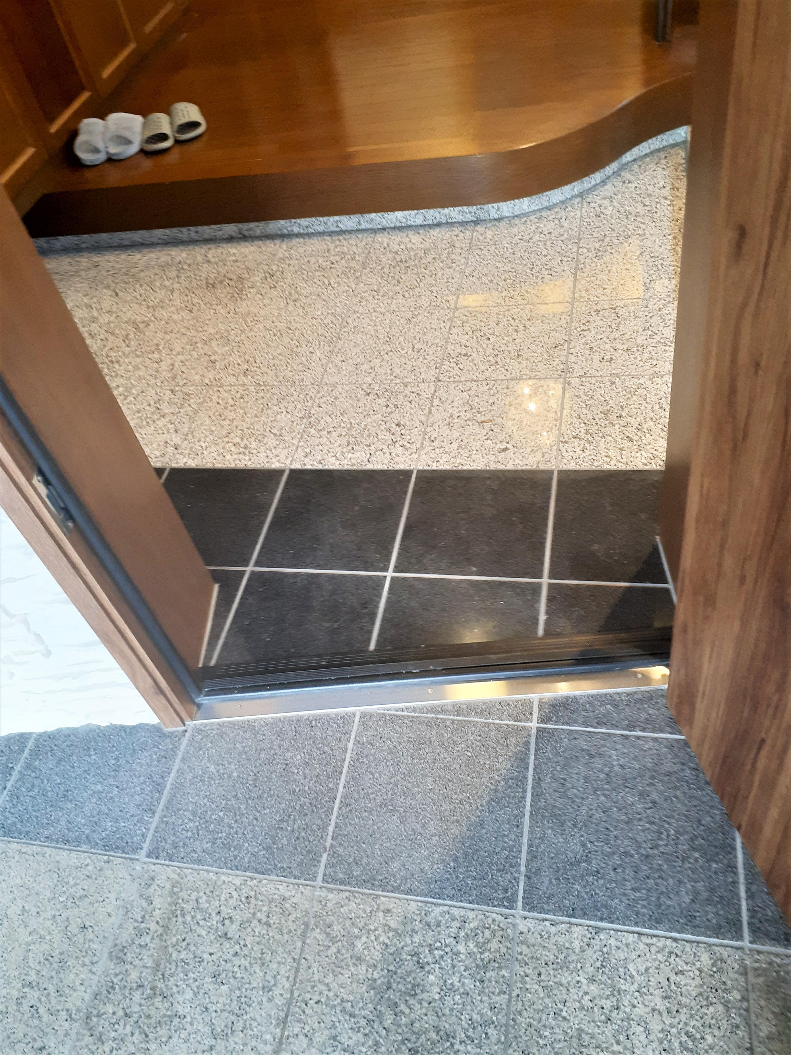 全面タイル張りのお住まい。既存の自動ドアを撤去し、玄関ドアに加え窓、アイアンの格子の設置。更には壁二面を石張りしヨーロピアンリゾート感溢れるイメージアップのリフォームになりました。施主様のセレクトも素敵で、愛猫のためを思った温かい思いも伝わります。