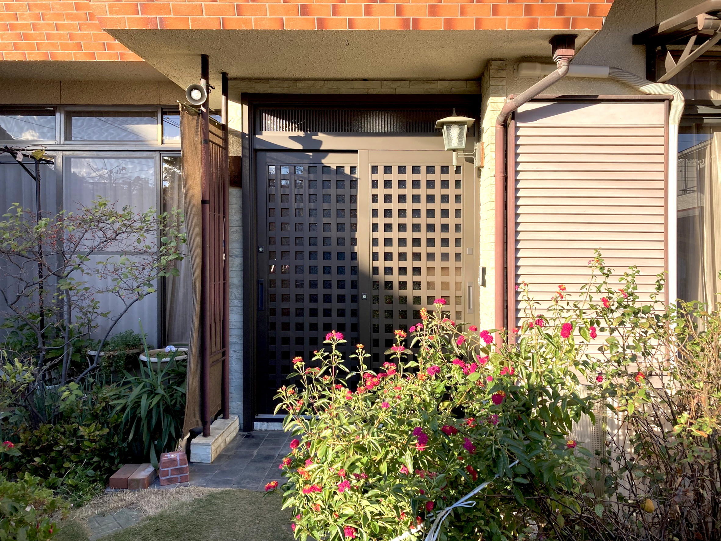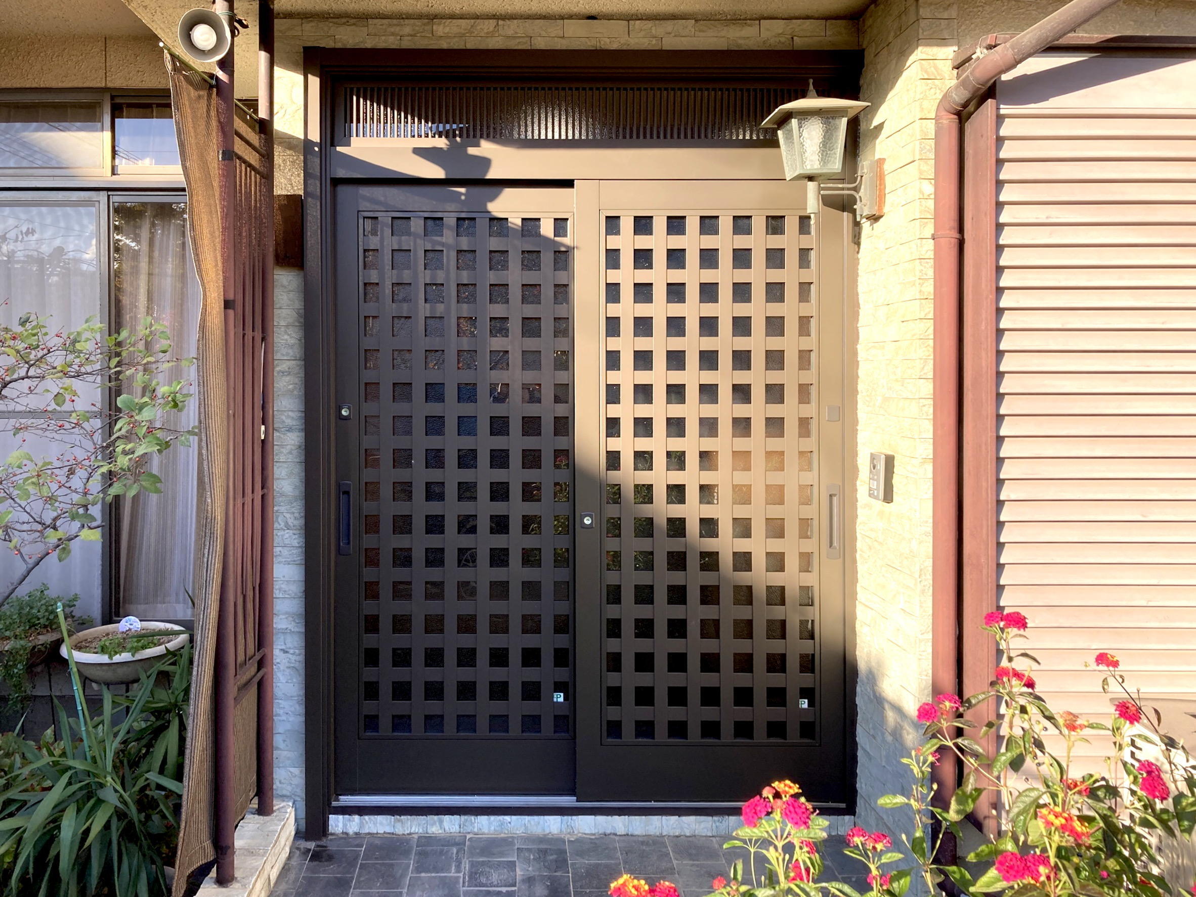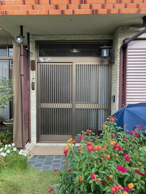 玄関引戸勝手口ドアのリフォームのご相談をいただきました。 ご自宅に合う色合いと格子を生かした引戸、防犯にも考慮された採風勝手口 短時間施工できれいに仕上がりました。
