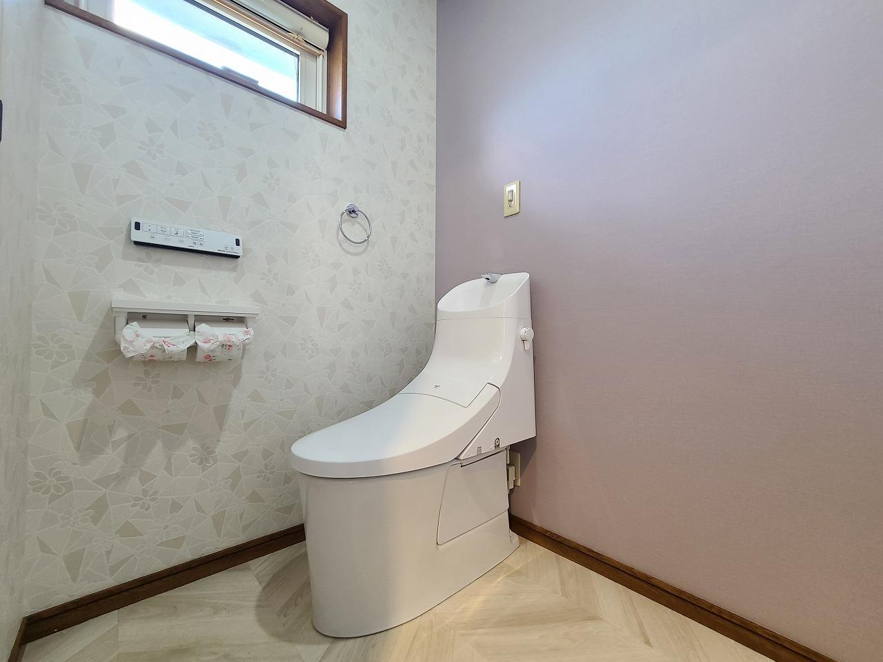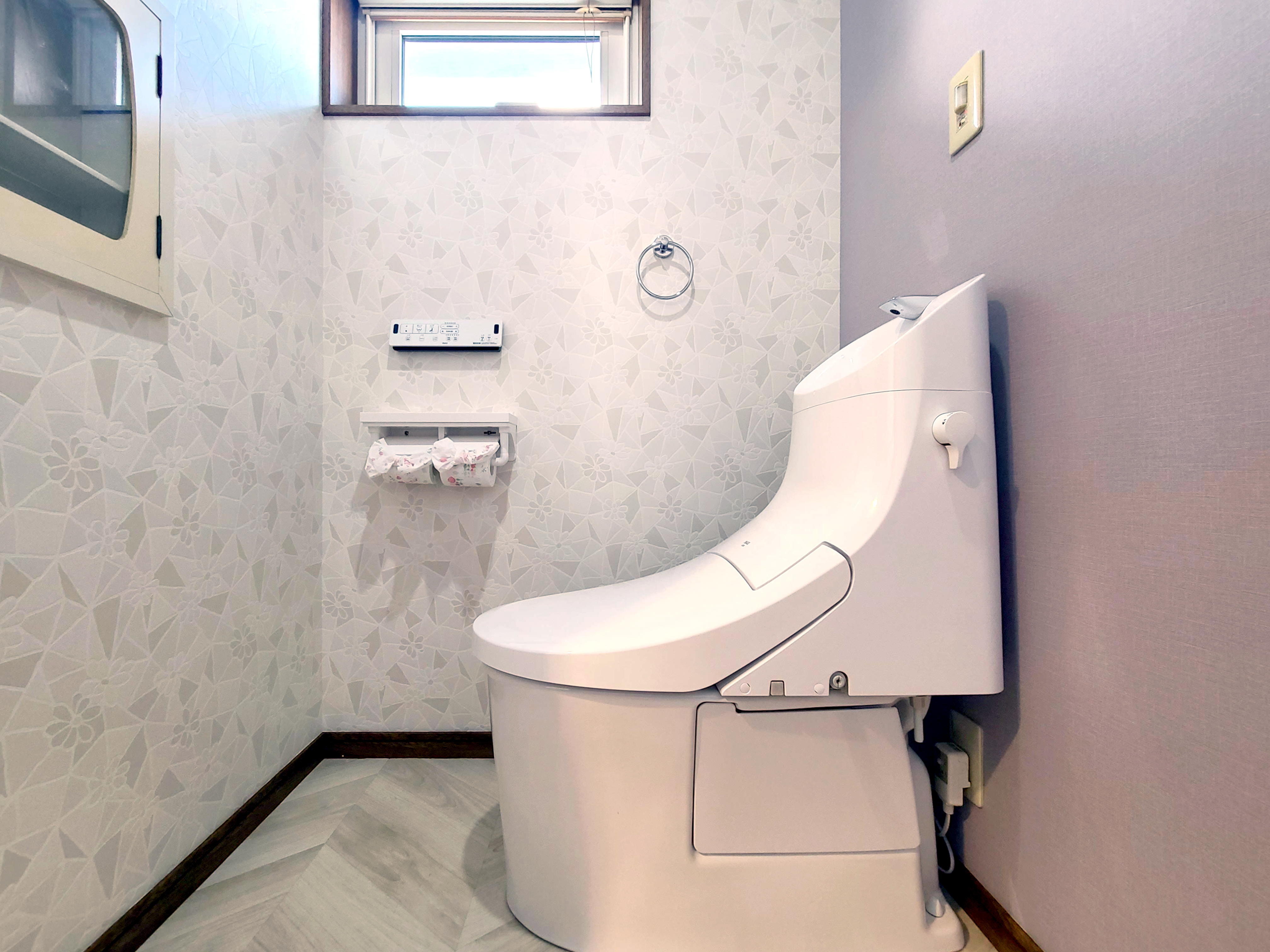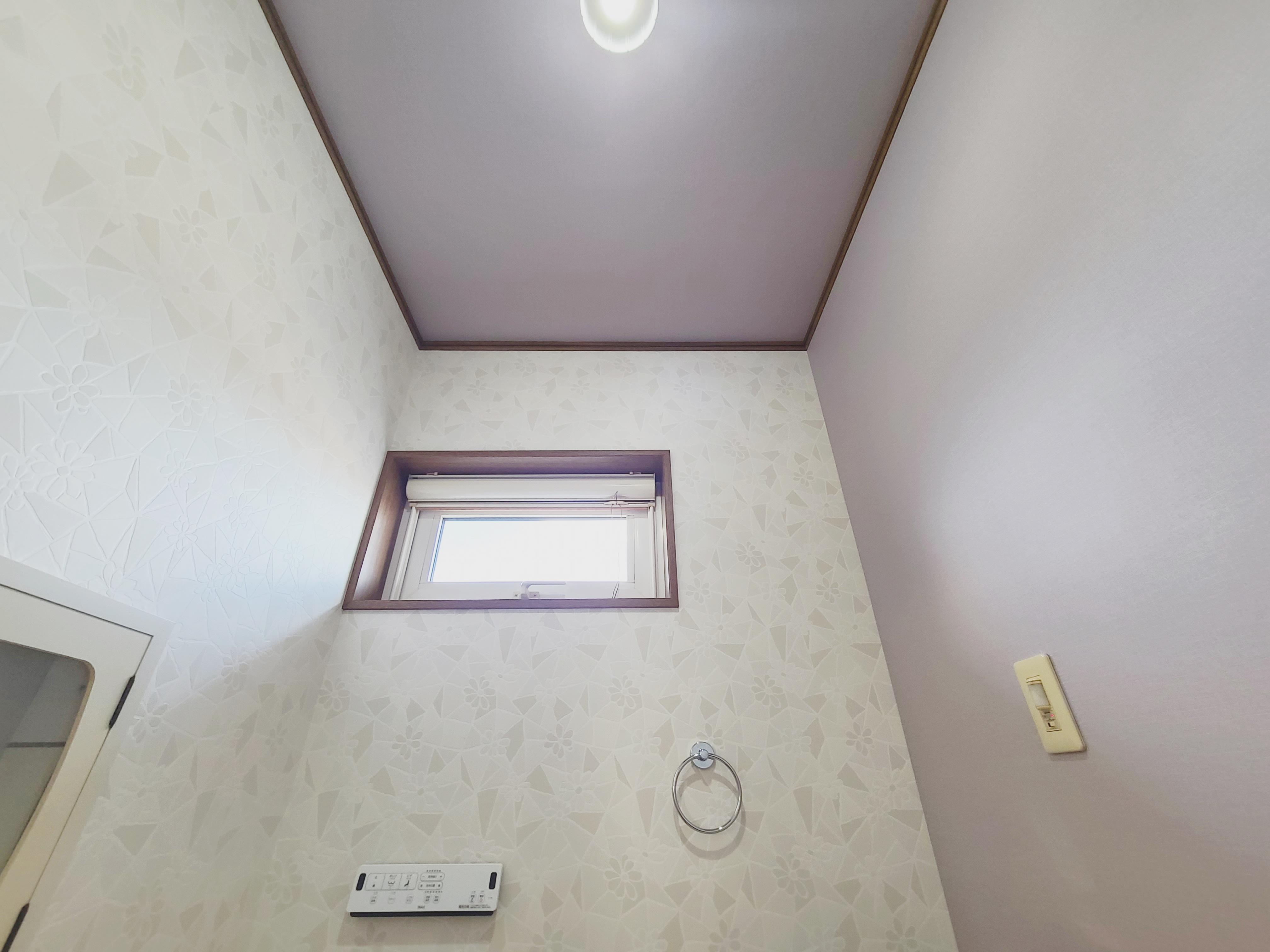 便器の漏水が発生してしまい、打ち合わせをしていくうちにトイレ全体のリフォームをさせていただく事になりました! 選んでいただいたパープルのアクセントクロスを壁一面と天井に使用して、全体のカラーコーディネートもセンスが光っています。
