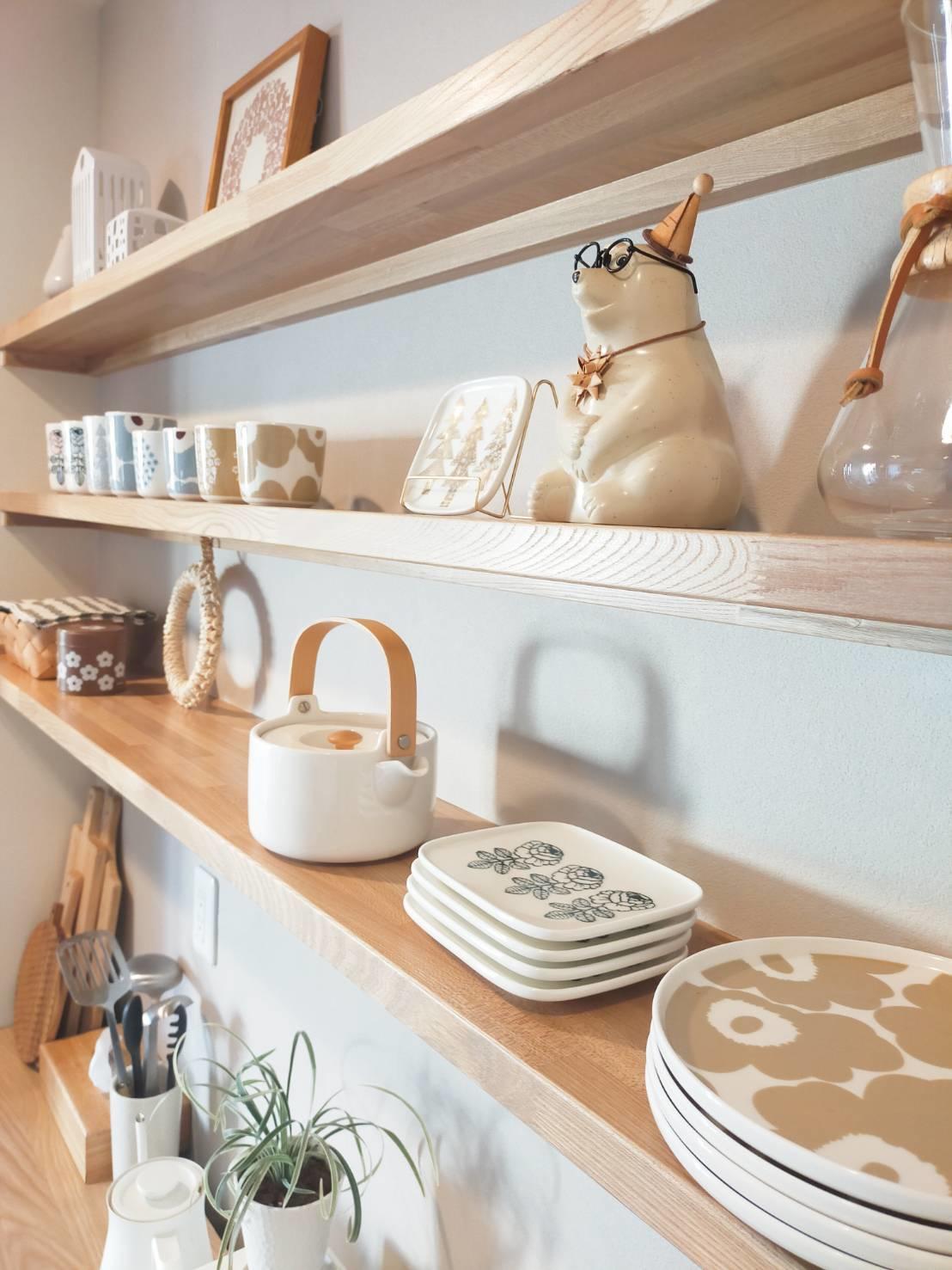 お気に入りの家具に合わせたタモ材棚板とアクセントクロスで