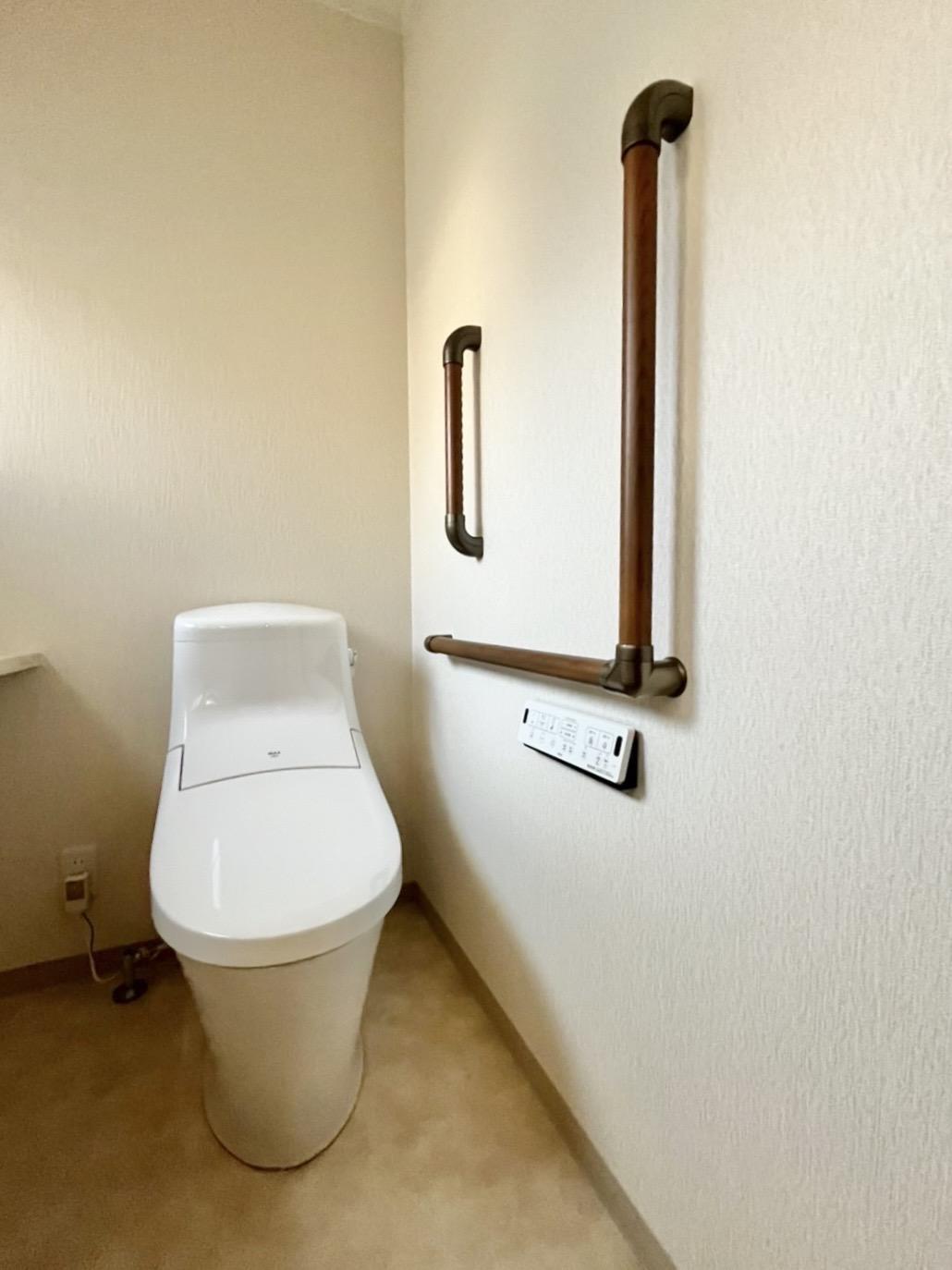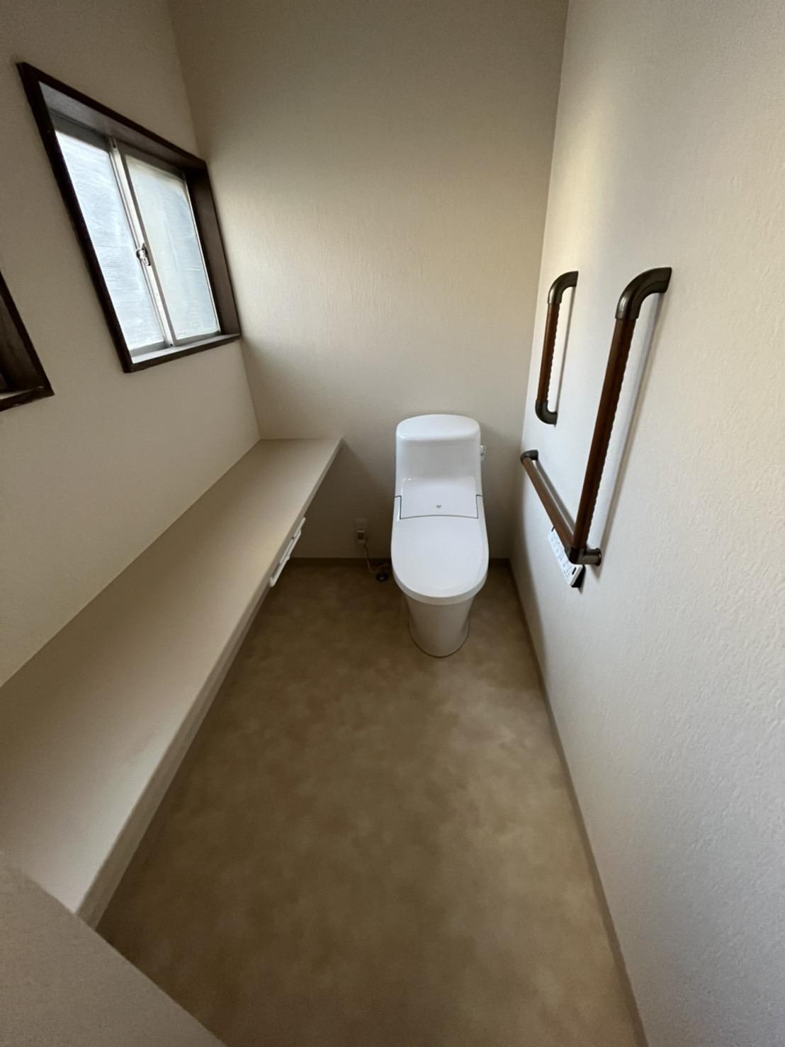 リフォーム前は小便器と和式トイレの2間がありました。それぞれ狭くて使いにくい状態でした。2つの部屋を1つの部屋に間取りを変更して、トイレを入れ替えました。手摺はご両親の身体に合わせて付けました。