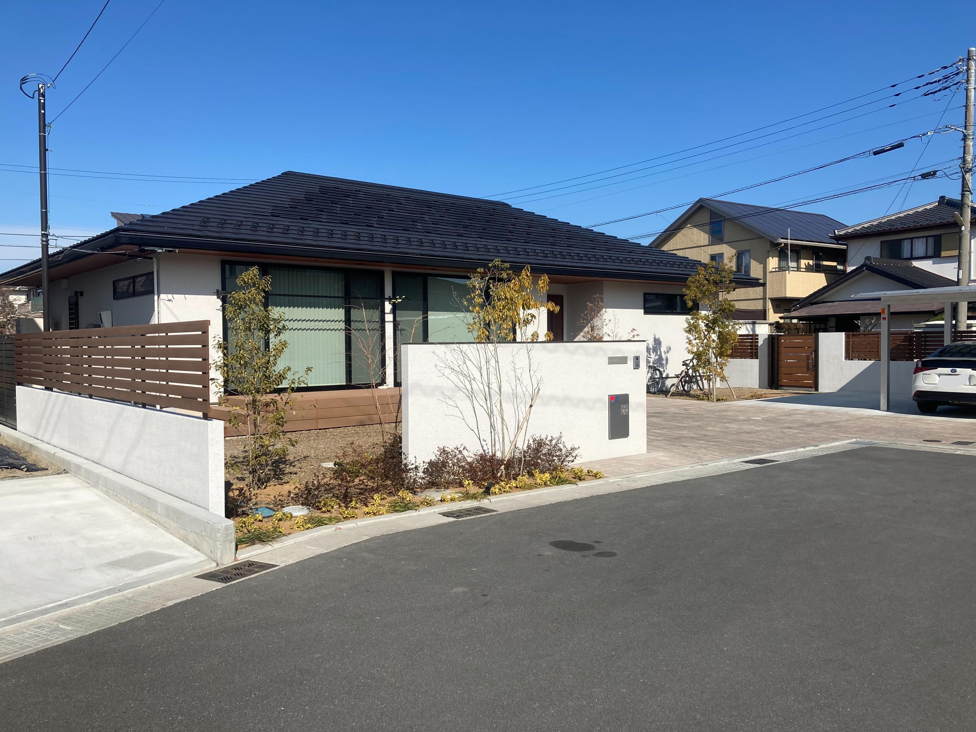 平屋建ての和モダンな建物の外構工事です。 外壁、軒天に色と素材を合わせ塀とフェンスを選びました。 広い敷地でしたので、存在感のある素敵な仕上がりになりました。 散歩道に隣接していたので、プライバシーの確保にもなりました。