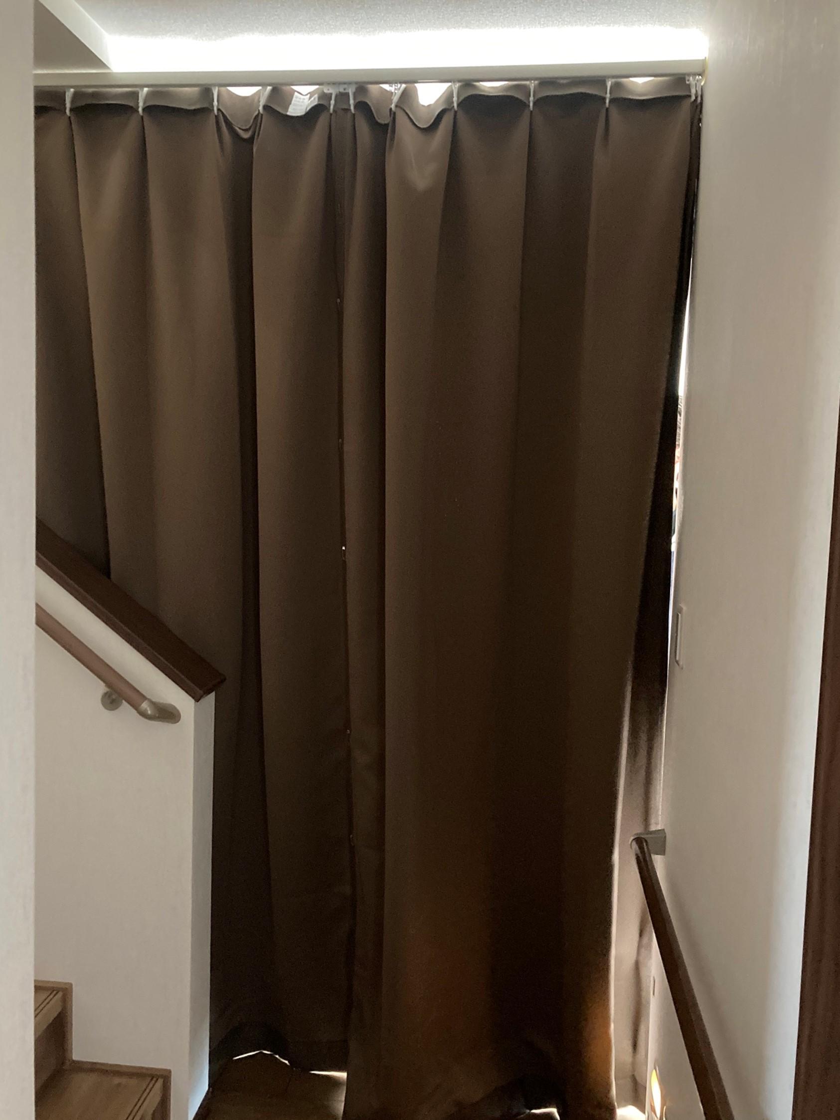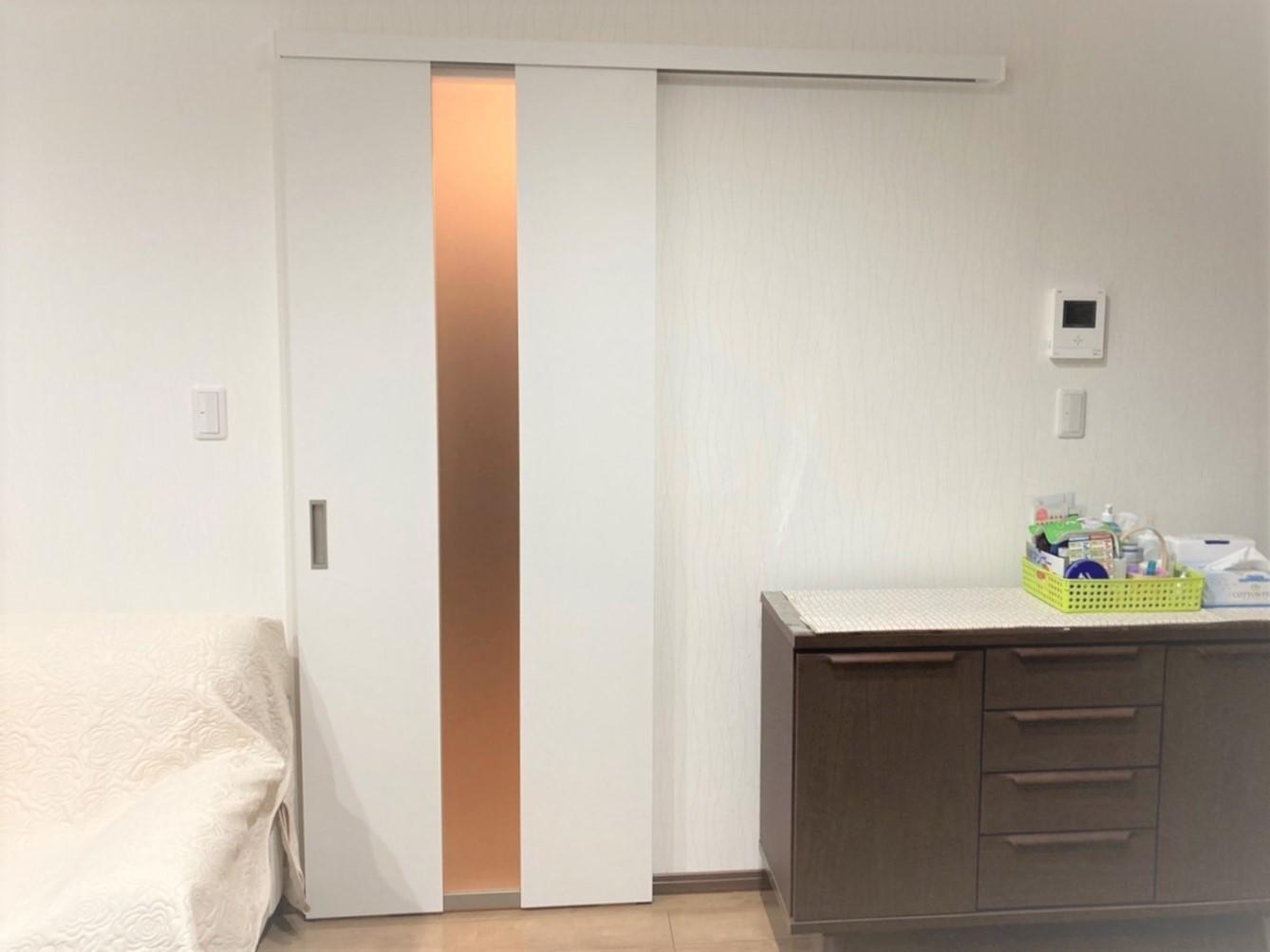 白い壁紙とダーク色の扉でコーディネートされた お家に寒さ対策の為 大きなカーテンが取付けてありました。 壁紙に合わせたホワイトの引戸がとても美しい仕上がりになりました。