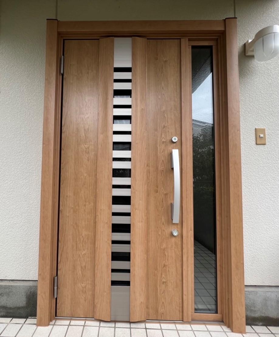 甲府市で玄関ドアの交換工事が完成いたしました。 工事も簡単に見た目も美しく最新の扉に交換できました! 断熱仕様の扉に縦長小窓の付いているタイプで風通しも良くなりました。