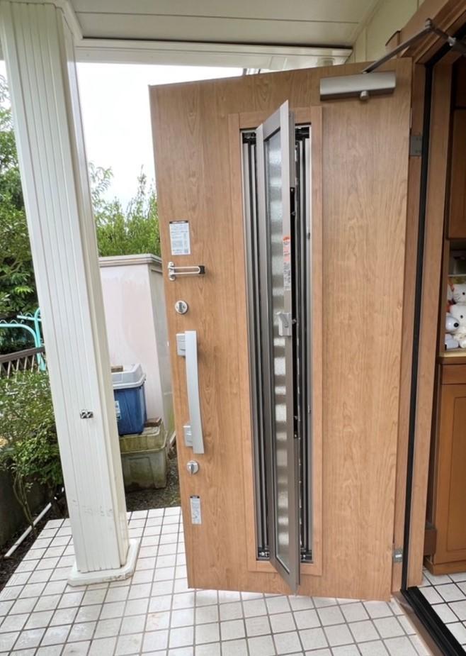 夏の暑い日、玄関で過ごすワンちゃんのために、玄関扉を交換したいとご相談をお受けしました。 採風タイプの扉を選ばれ、夜も外出時も風通しよく心地の良い玄関になりました。
