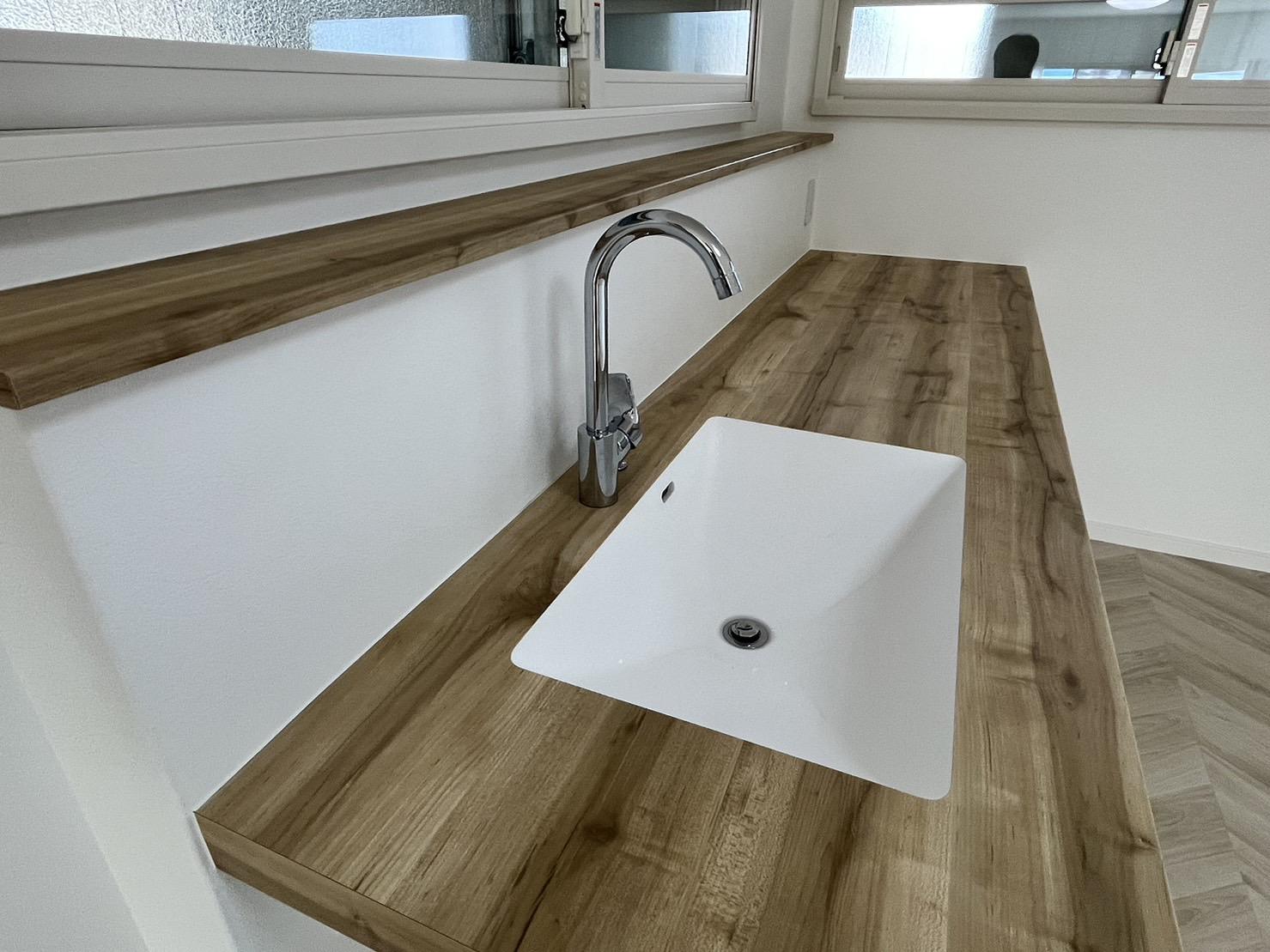 洗面台はボウル一体型でお手入れがしやすいです。作業スペースも広いのでケトルなどを置いても余裕があります。壁付けの給排水にしたのでお掃除もとても楽になります。