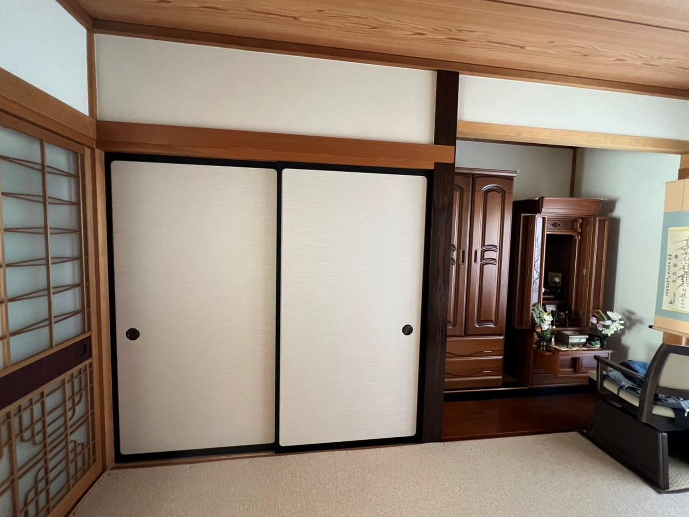 甲斐市で和室のガラス交換クロス貼替、カー門扉の交換工事が完成いたしました。 サッシ枠はそのまま、ガラスのみ 特殊膜が中間層に施して ある防災安全合わせ複層ガラスに交換。割れにくく、飛散しにくいサッシになりました。 和室は、クロス、襖を貼り替え明るい印象になりました。