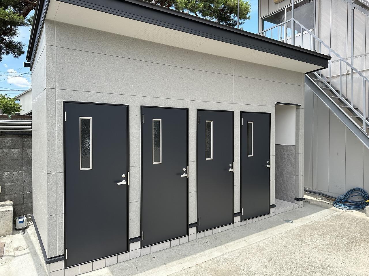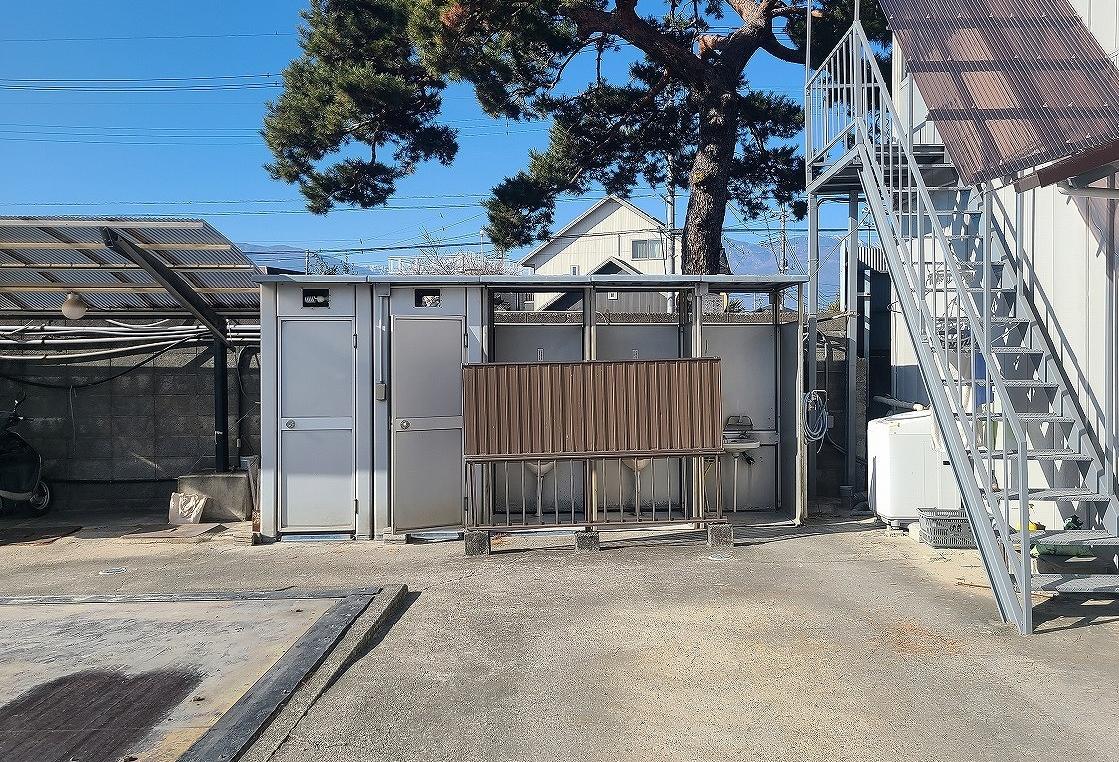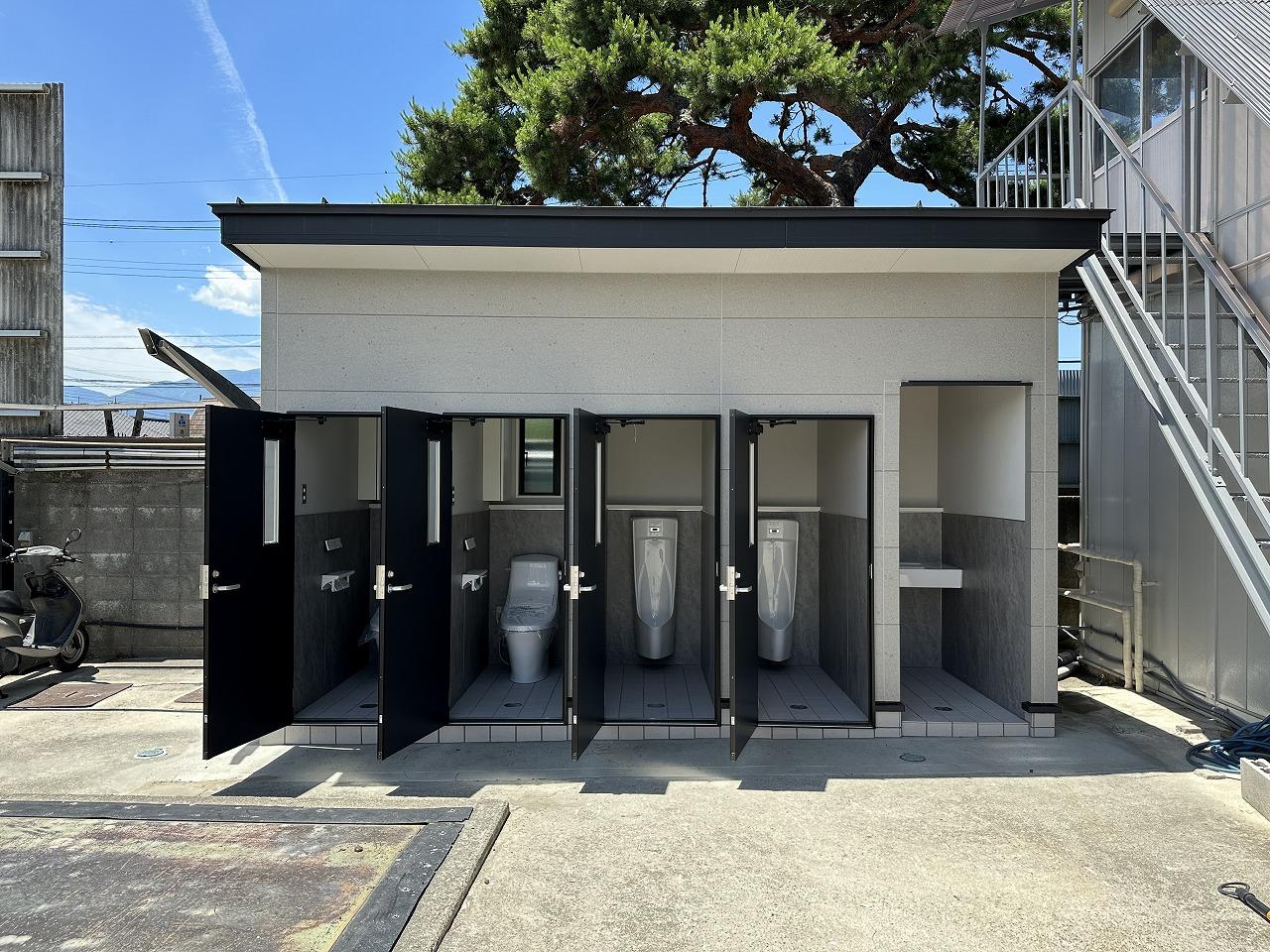 甲府建材商会様社屋の従業員さんや生コン車の運転手さん達が使用するトイレを建替えました。 プレハブの簡易的なトイレを取り壊して基礎から新築し、快適で清潔なトイレに生れ変わりました。