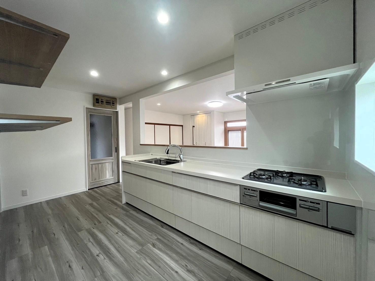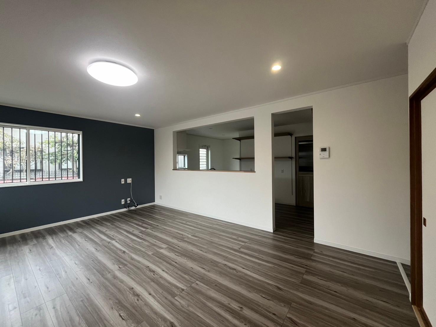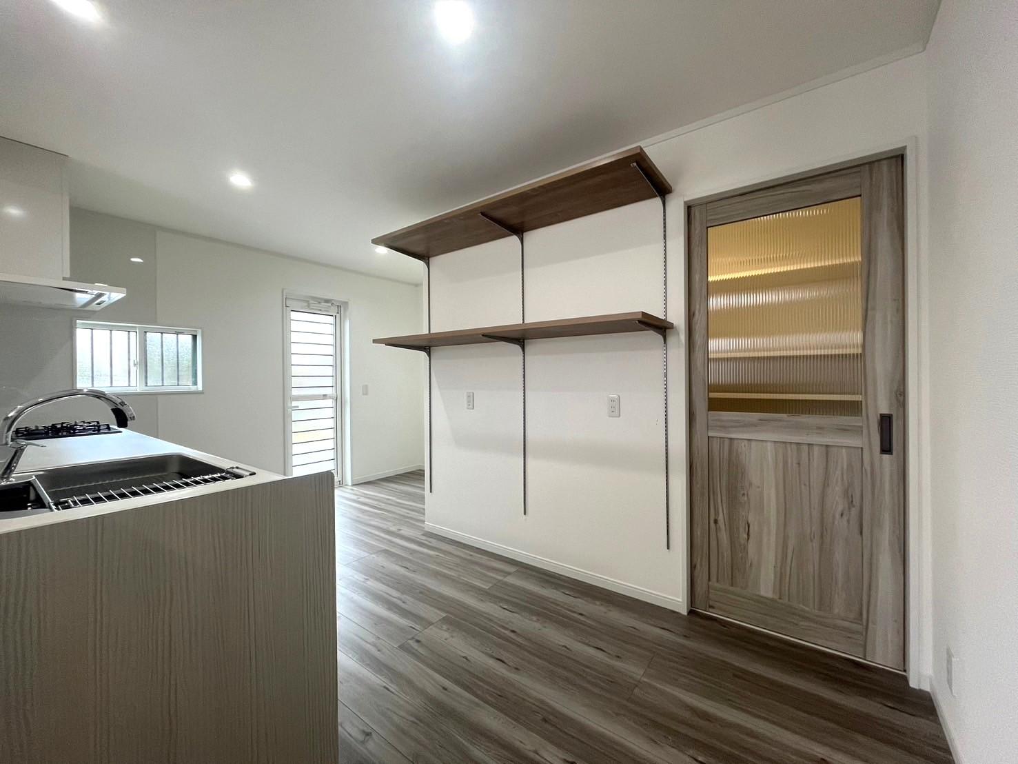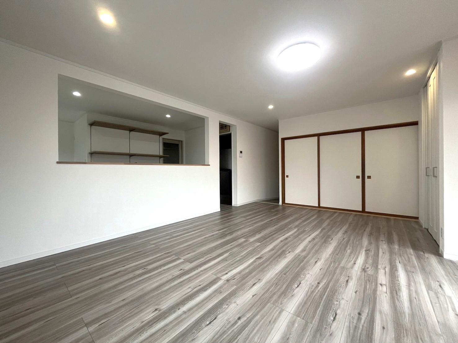 長年地域の皆様に愛されてきた食事処を終え、ゆったり過ごせるLDKにリフォームしました。落ち着いた色味で統一感のある内装に仕上がりました。キッチンはLIXIL「ノクト」を採用。お手入れが簡単なレンジフードや使いやすい水栓や収納を採り入れました。