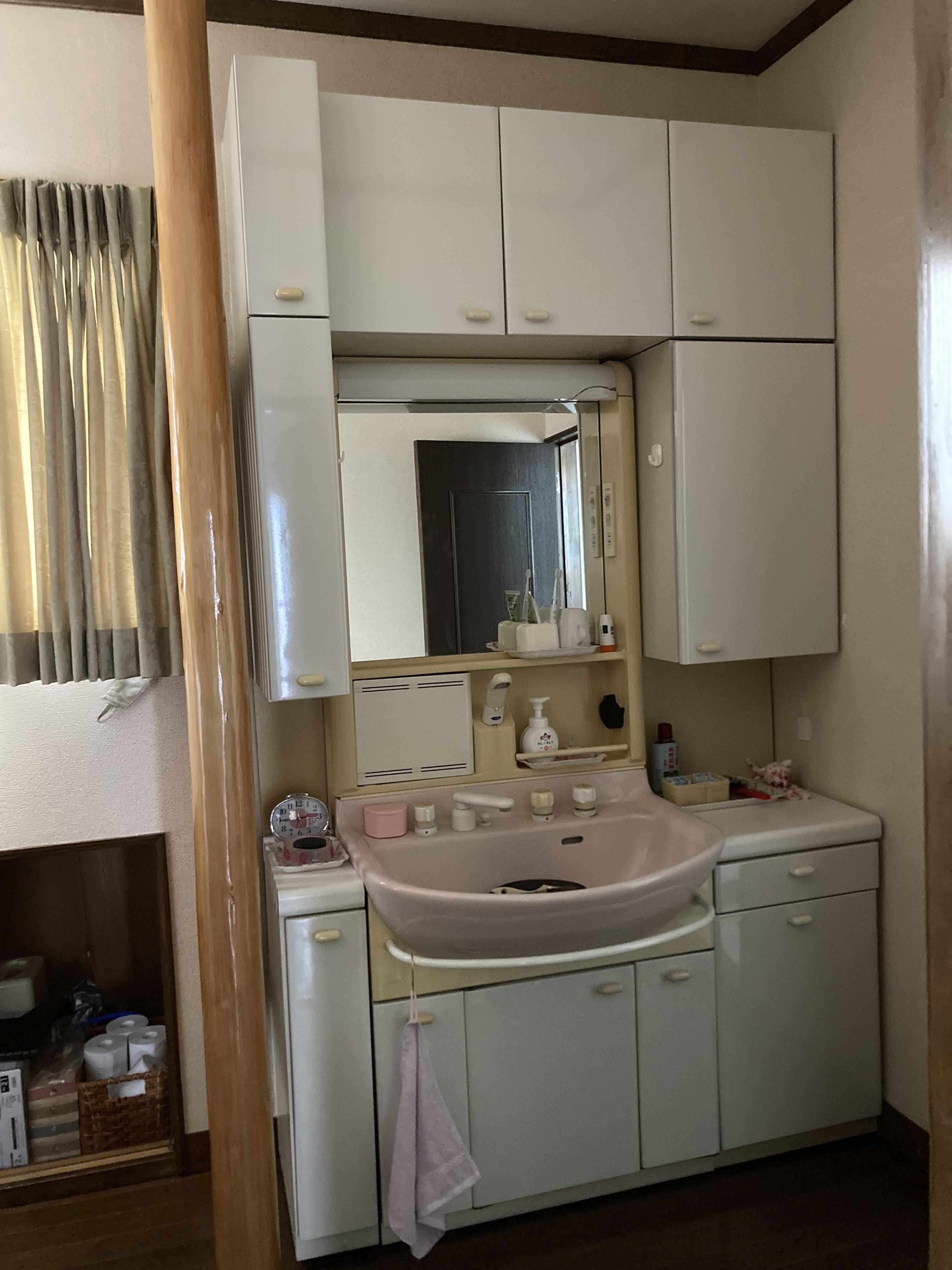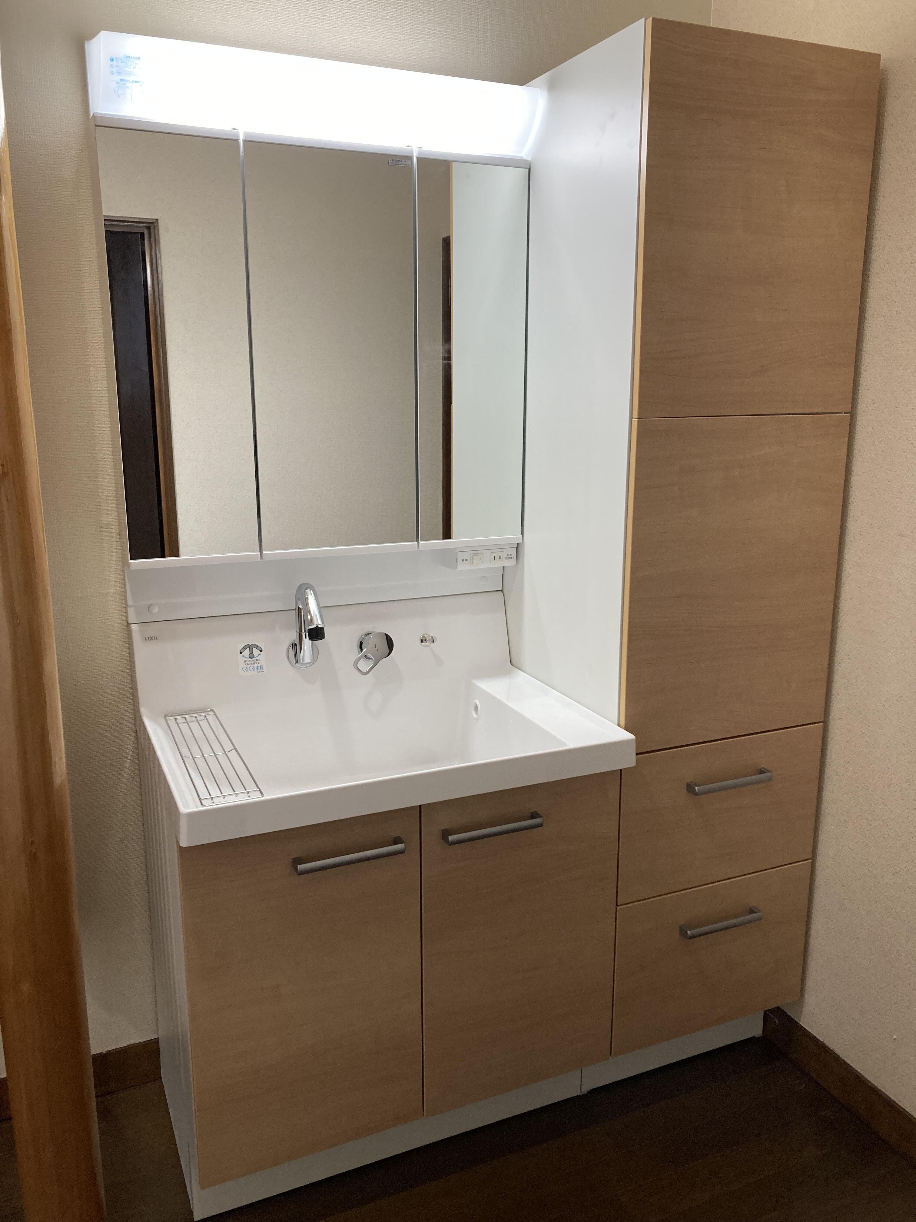 相談会のチラシをご覧になって、洗面台の取替工事をご依頼いただきました。2階の洗面台を新しくされたいとご相談いただきました。以前ほど物入れは必要なかったのですが、洗面台だけにすると給排水の移設工事が必要になってしまう為、右側だけトールタイプのキャビネットを一緒にご提案しました。