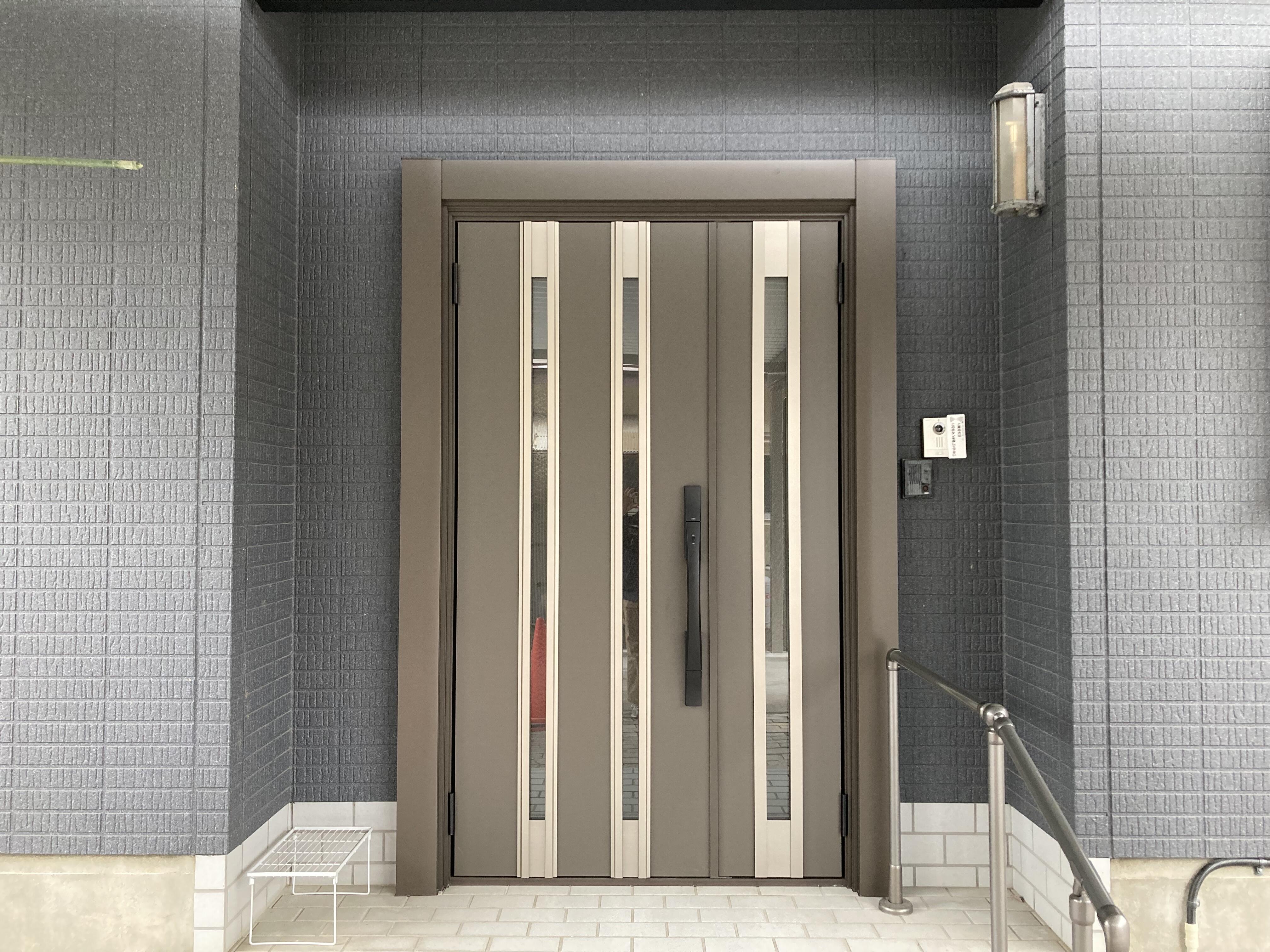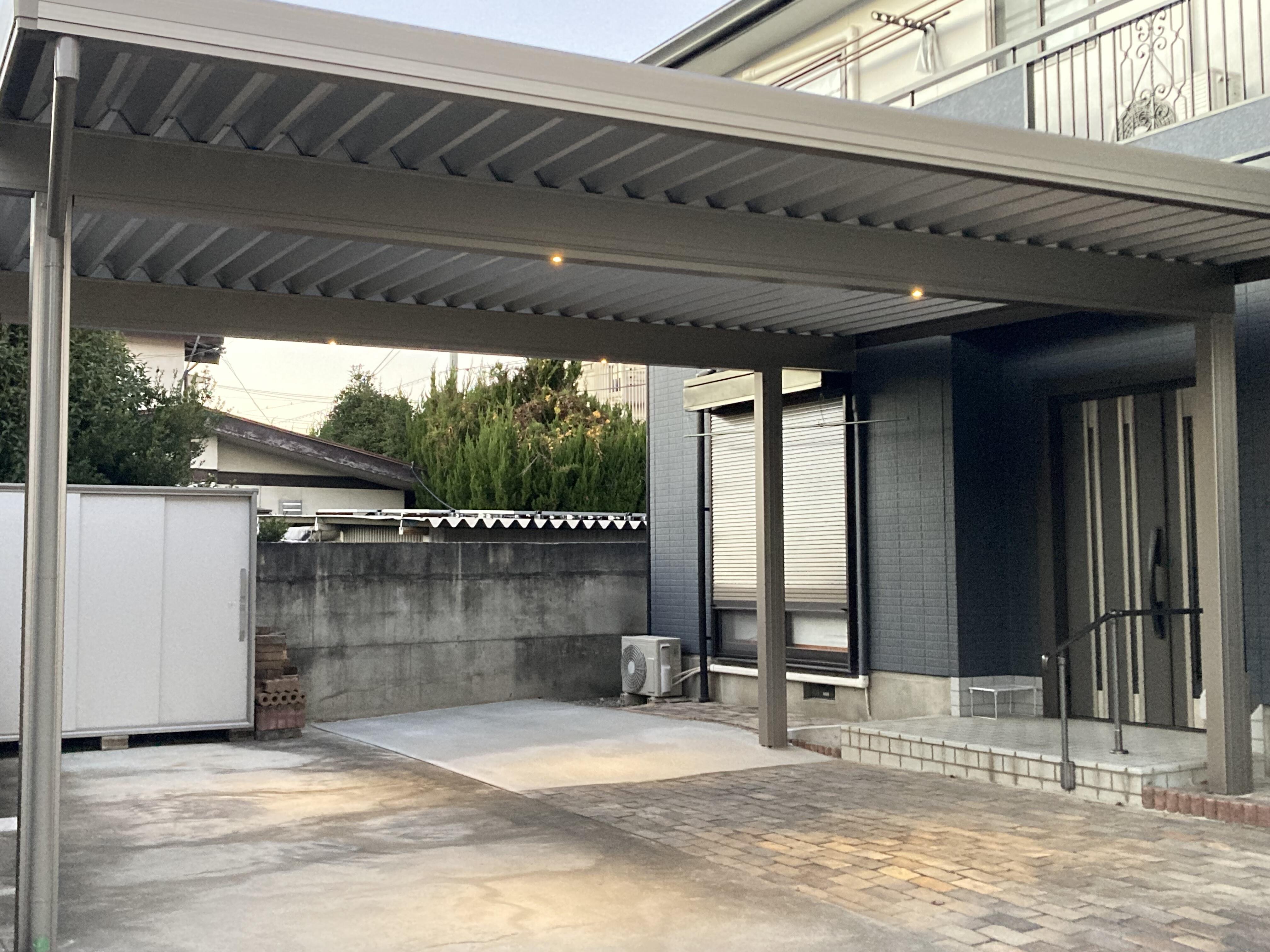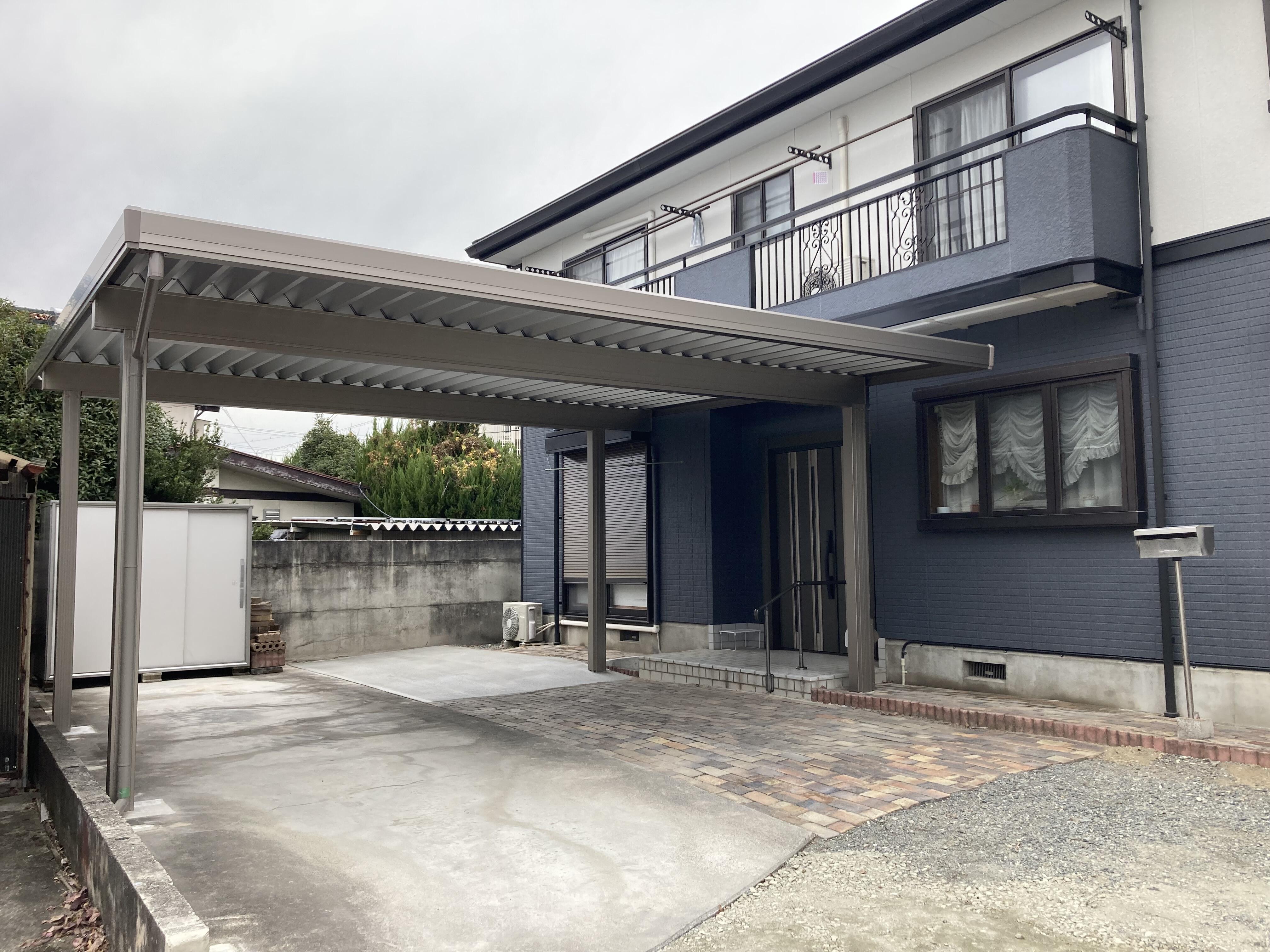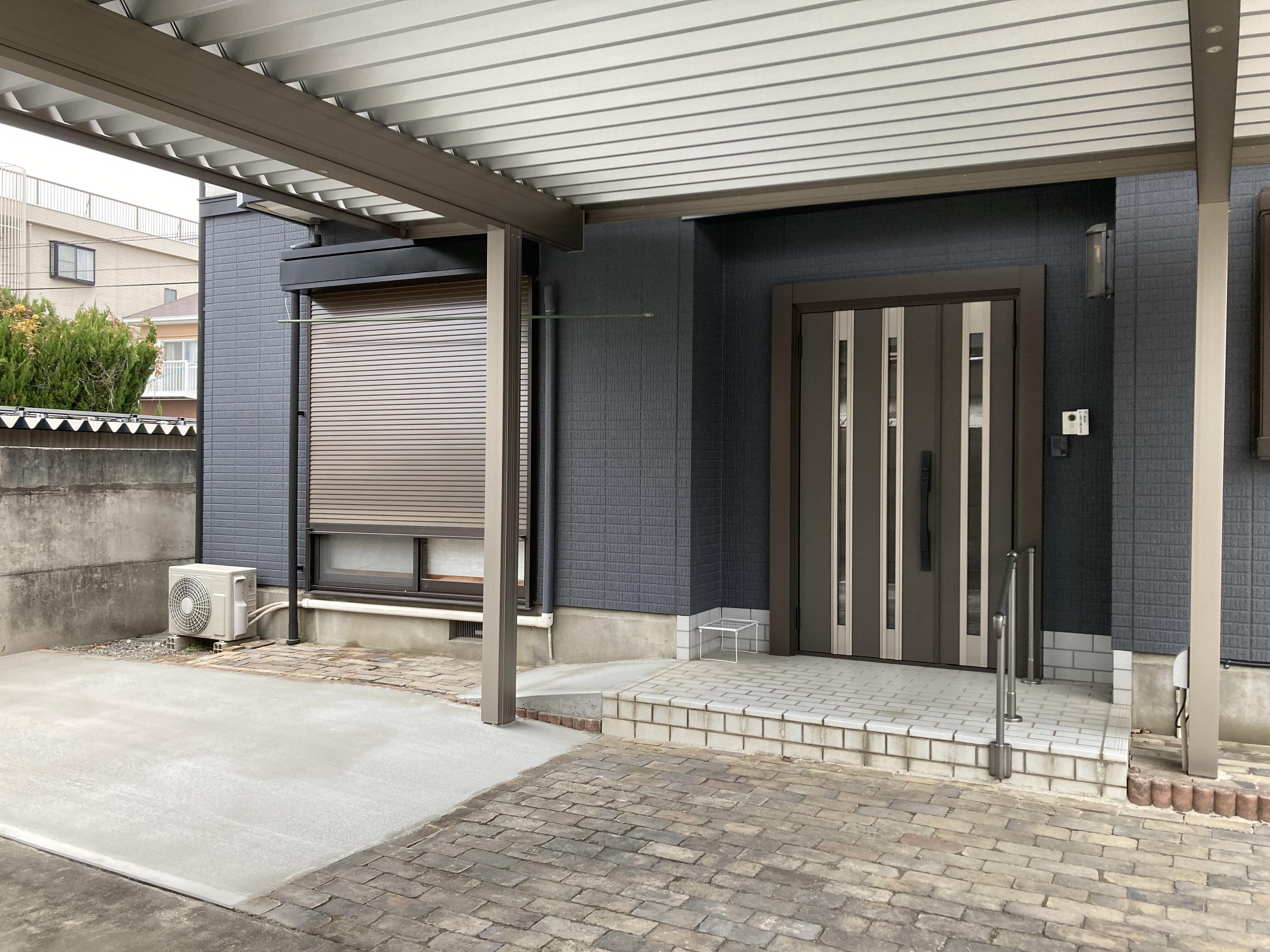 カーポートは、LIXILカーポートSWの1500タイプに人感センサーを取付しました。玄関ドアには、リシェントドアM24型のオータムブラウン色をお選びいただきました。どちらも、既存の建物とマッチしてすっきりとカッコ良く仕上がりました。
