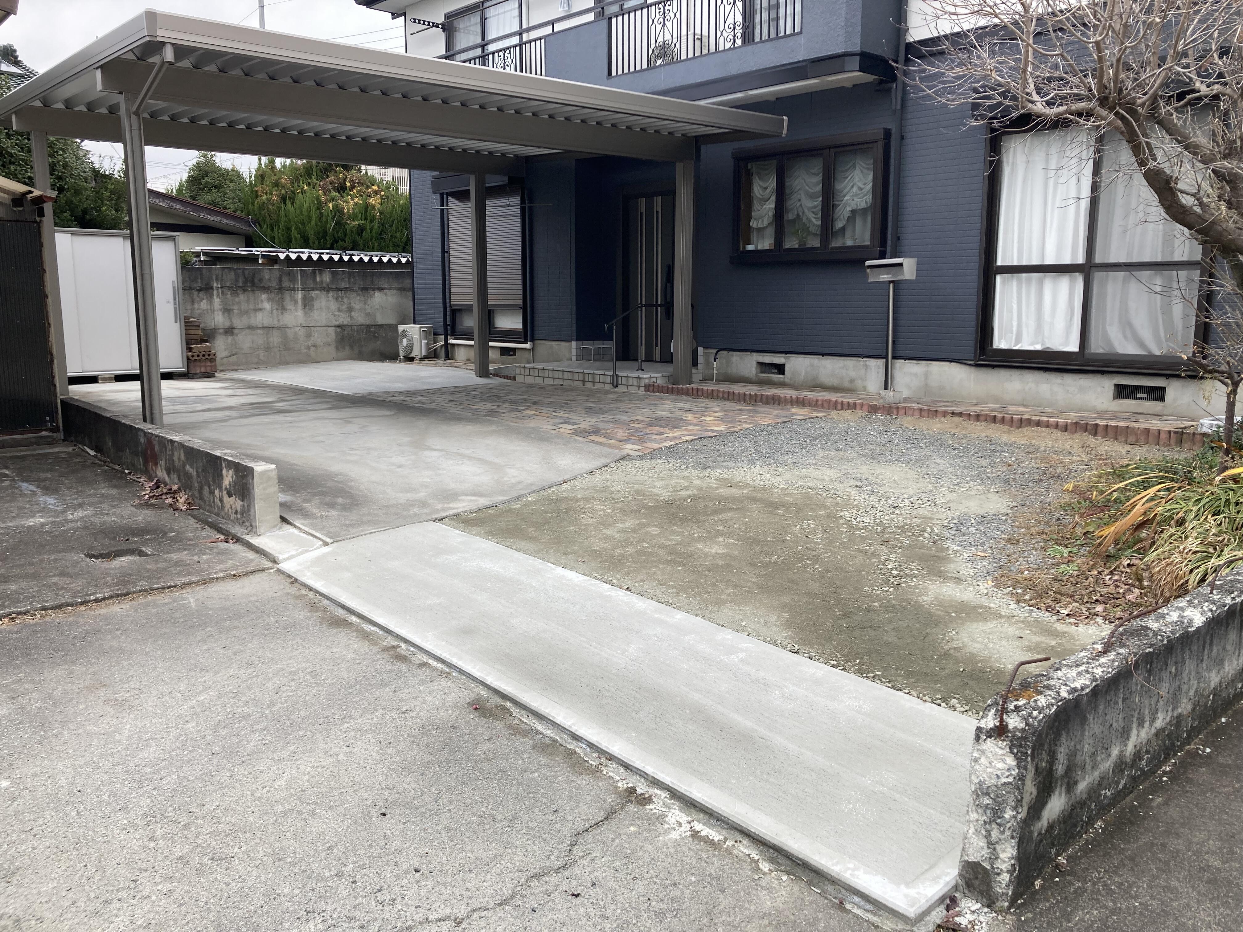 既存のカーポートが老朽化した事もあり、屋根の向きを変えて玄関への出入に雨に当らなように、将来的に玄関ポーチにスロープを設置と、駐車場に土間コンクリートを部分的に増設して、さらに玄関ドアも断熱仕様に取替する事にしました。