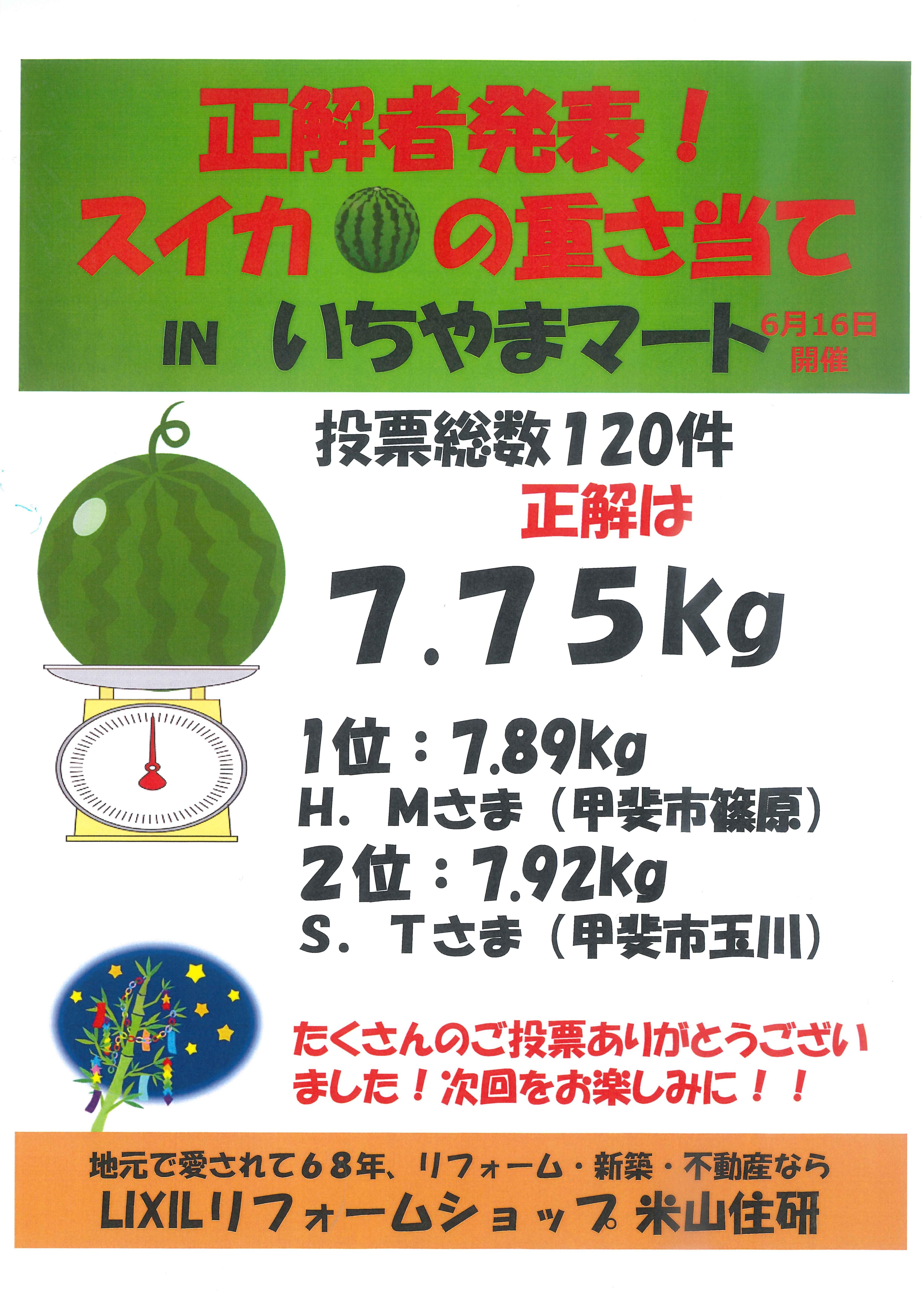 120名もの方にご参加いただいたスイカの重さ当てクイズですが、正解は7.75kgでした!