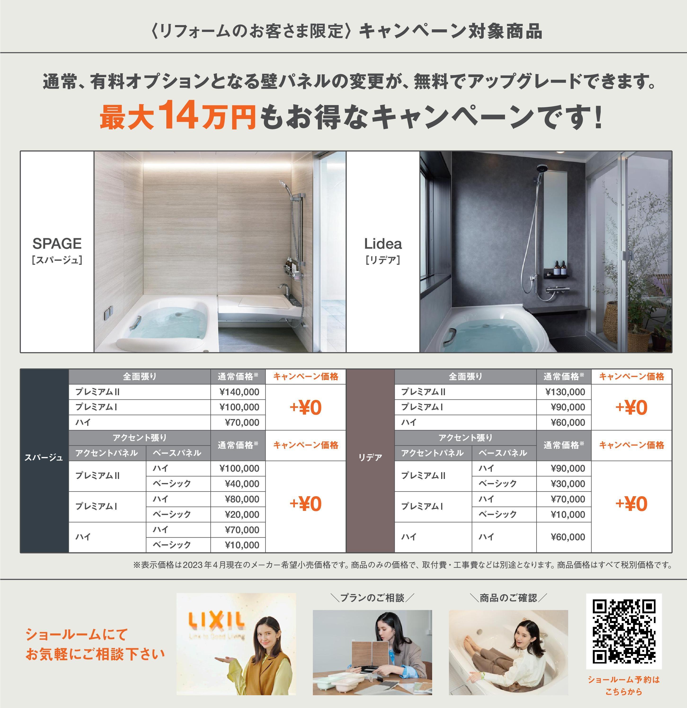 キャンペーン対象:システムバスルーム「スパージュ」、「リデア」のリフォームのお客さま