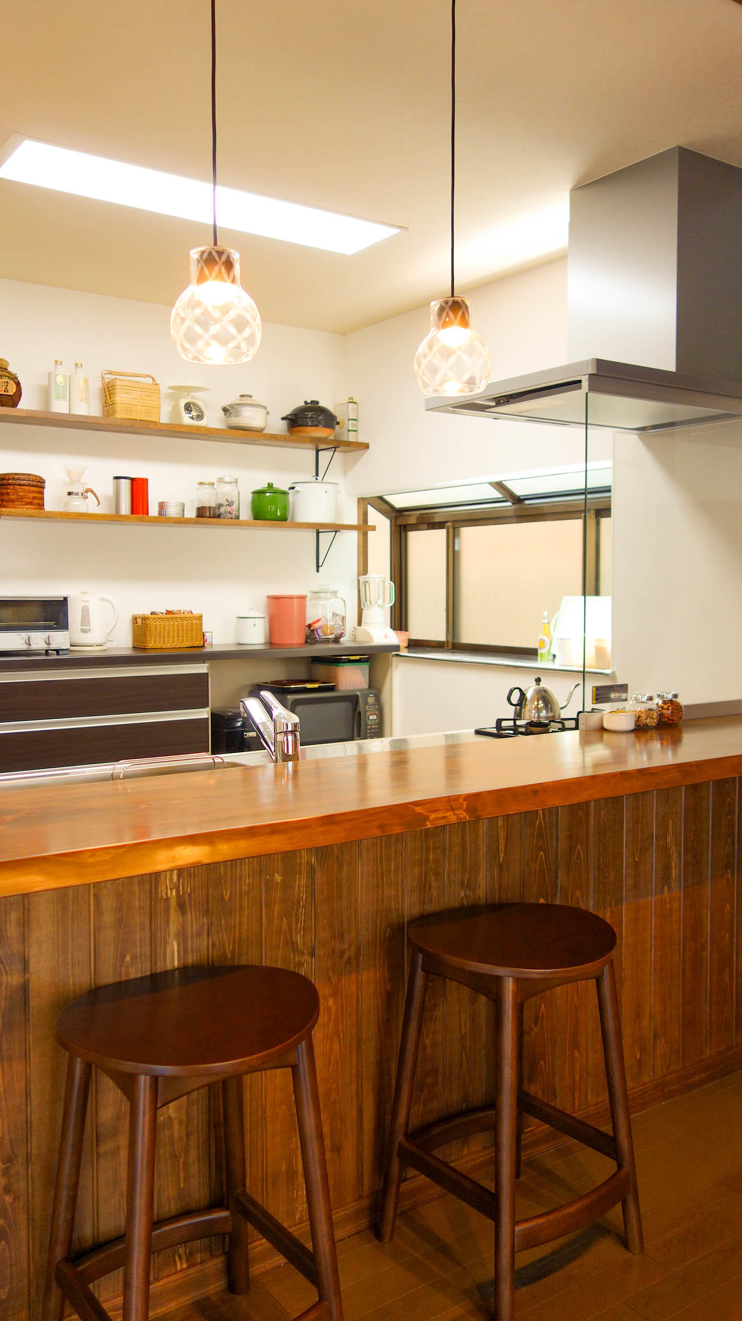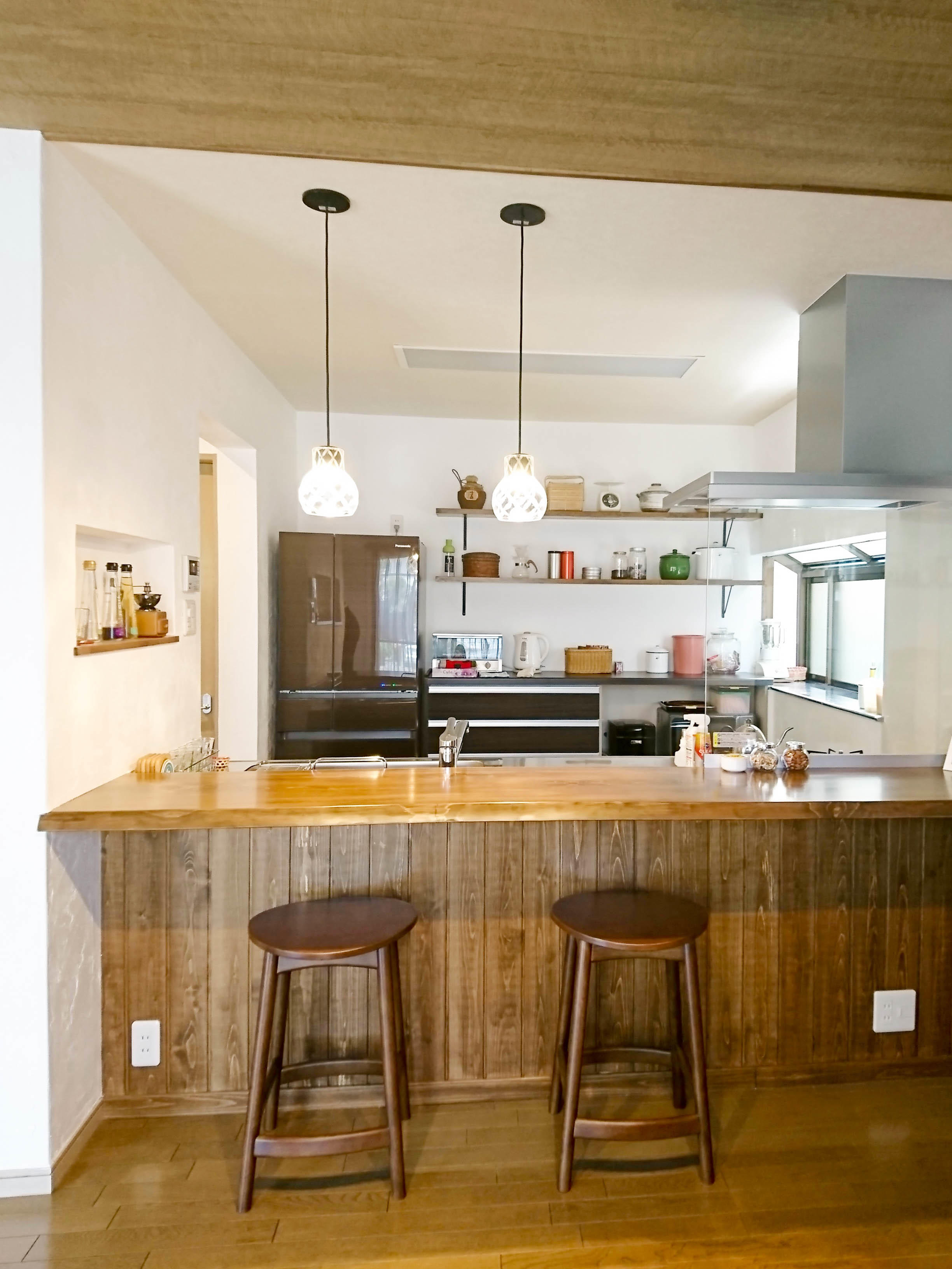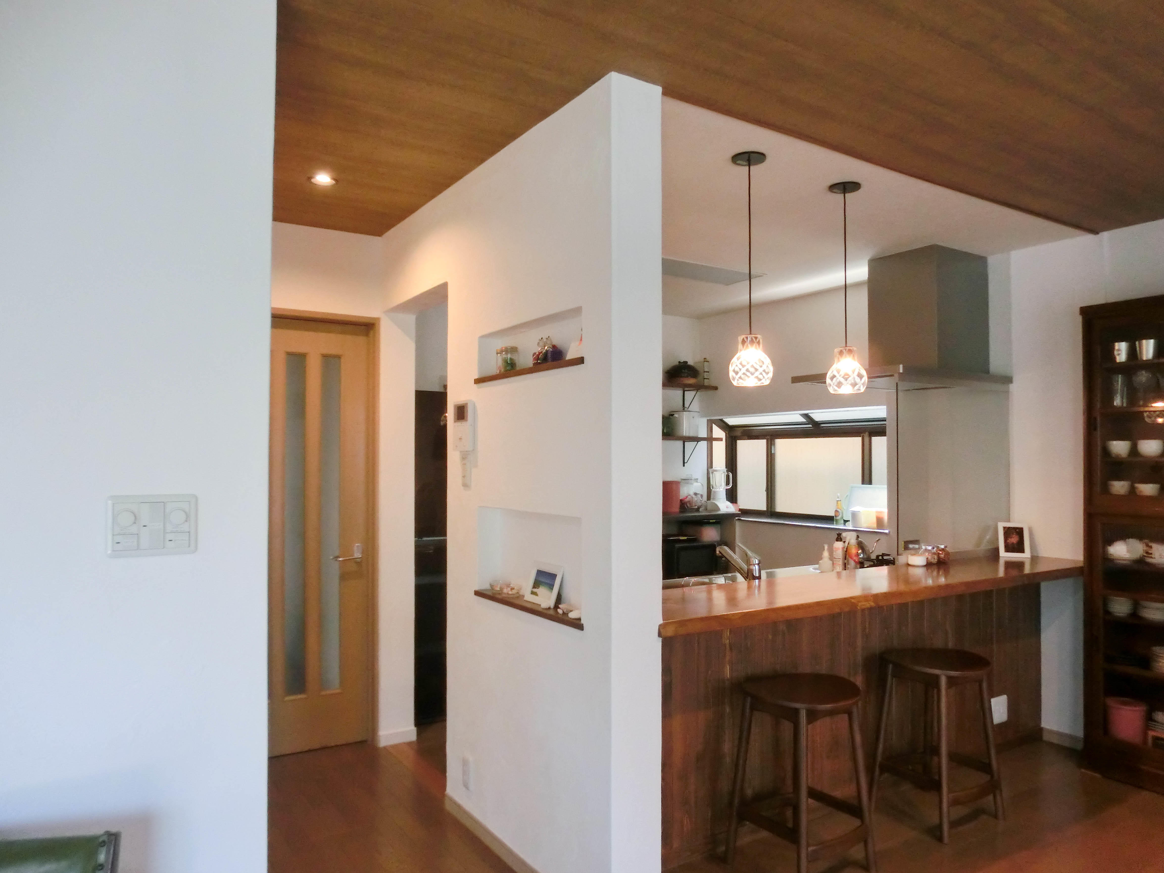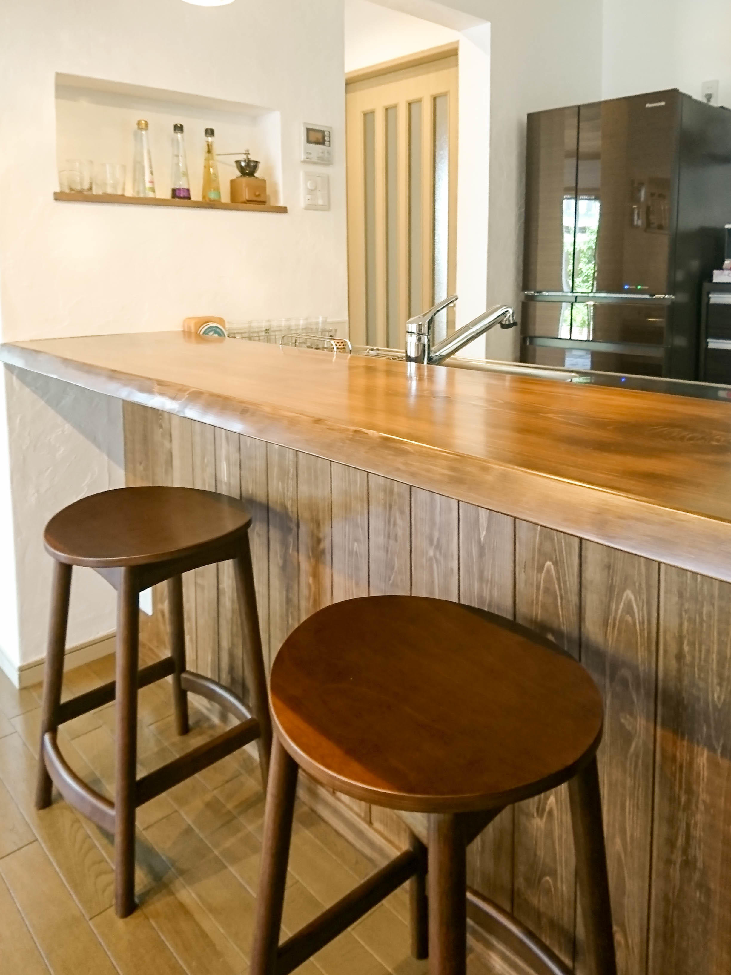 二人で一緒に過ごせるカウンターがLDKの落ち着く場所になりました。リフォーム前にカウンターチェアーを購入し、それに合わせたカウンターは抜群のバランスです。壁は漆喰にしました。手触りも見た目も思い通りです。