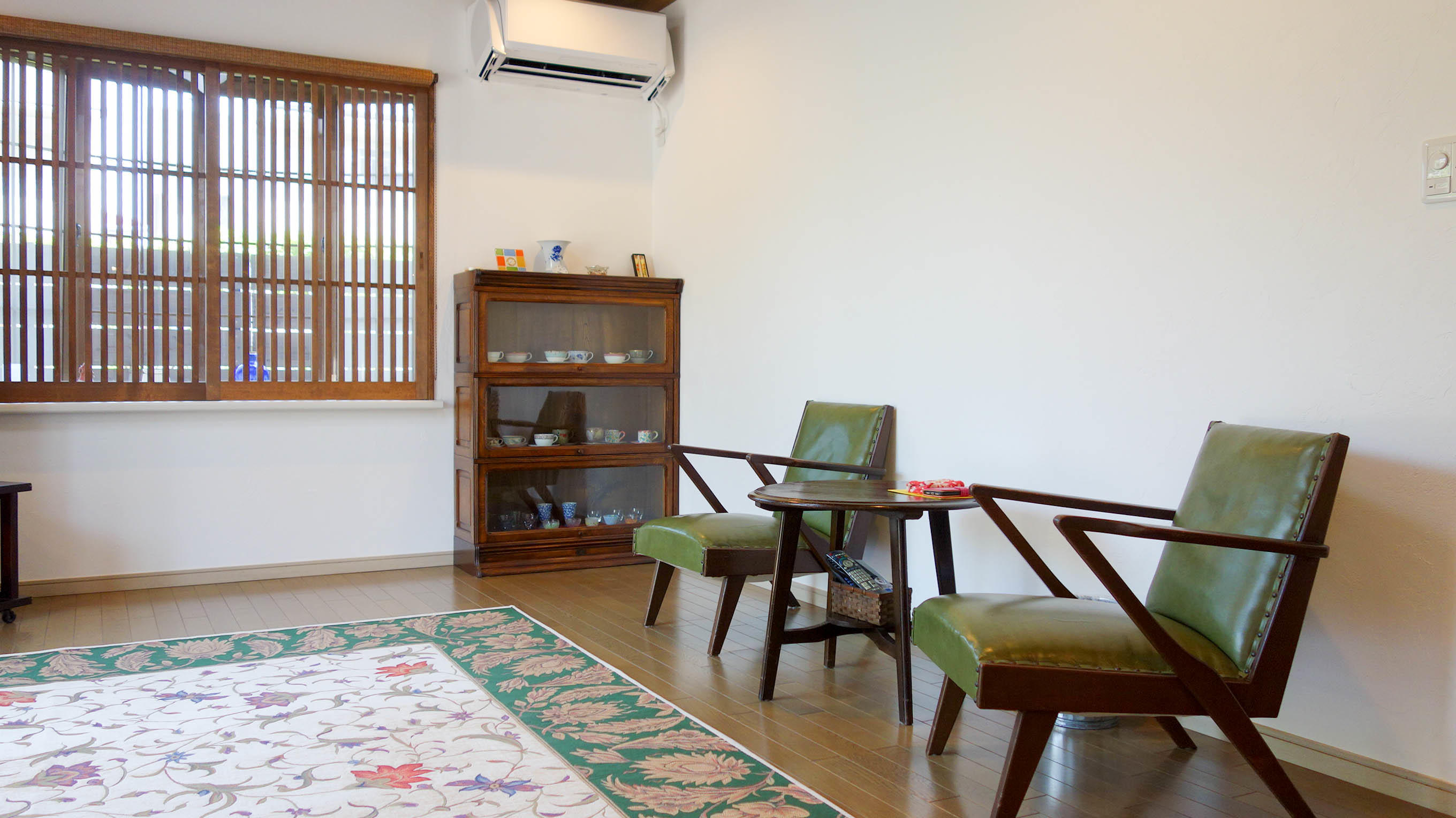 もともとお持ちのアンティークな椅子と棚に合せた雰囲気で格子を造作。雰囲気ぴったりの空間に♪