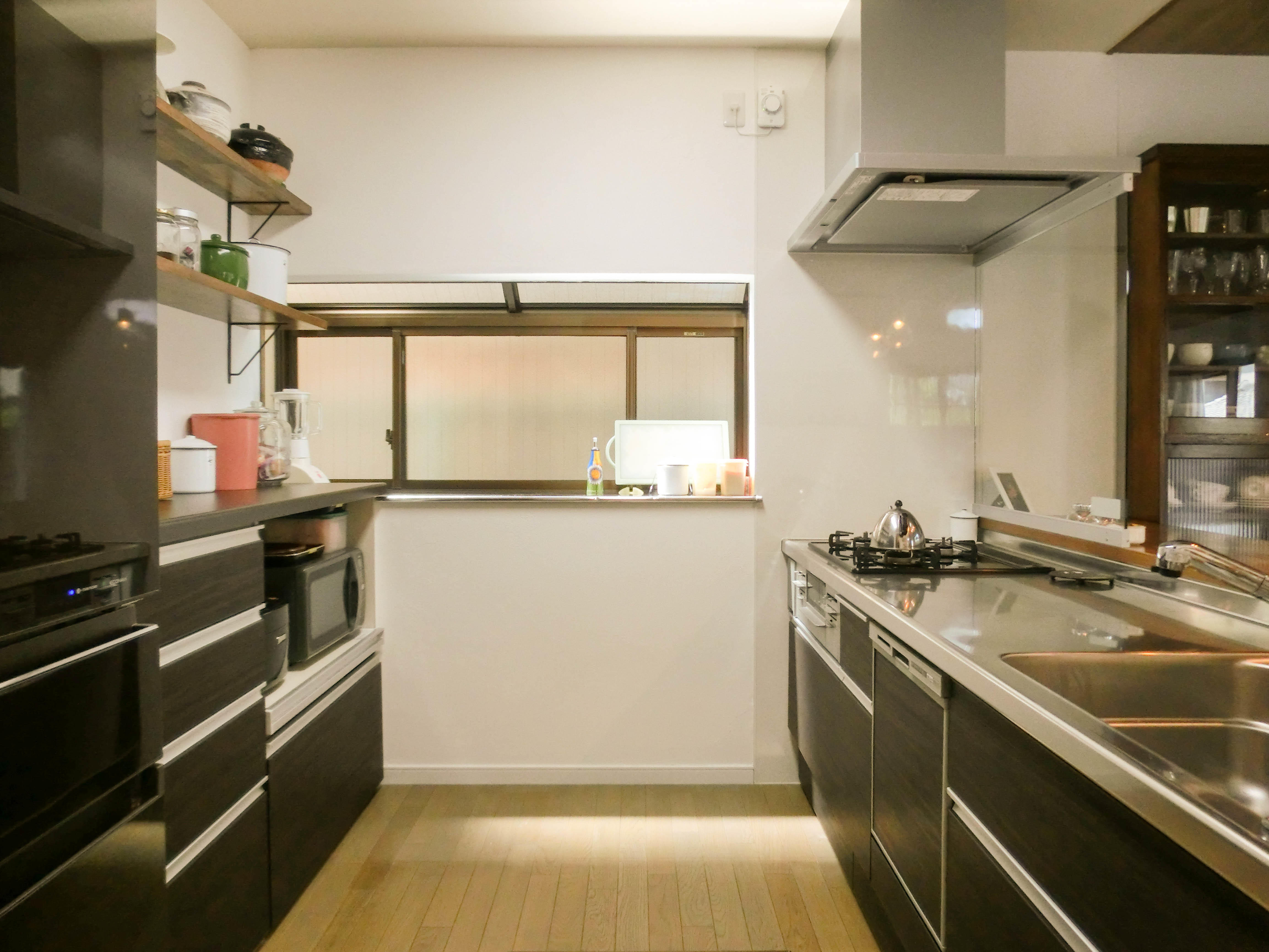 キッチンにある造作の棚には、普段使いの調理器具も見せる収納ですっきりとおしゃれ感アップ!!お施主様の1番のこだわりの「家事をしてても1人にならないキッチン」が完成です♪