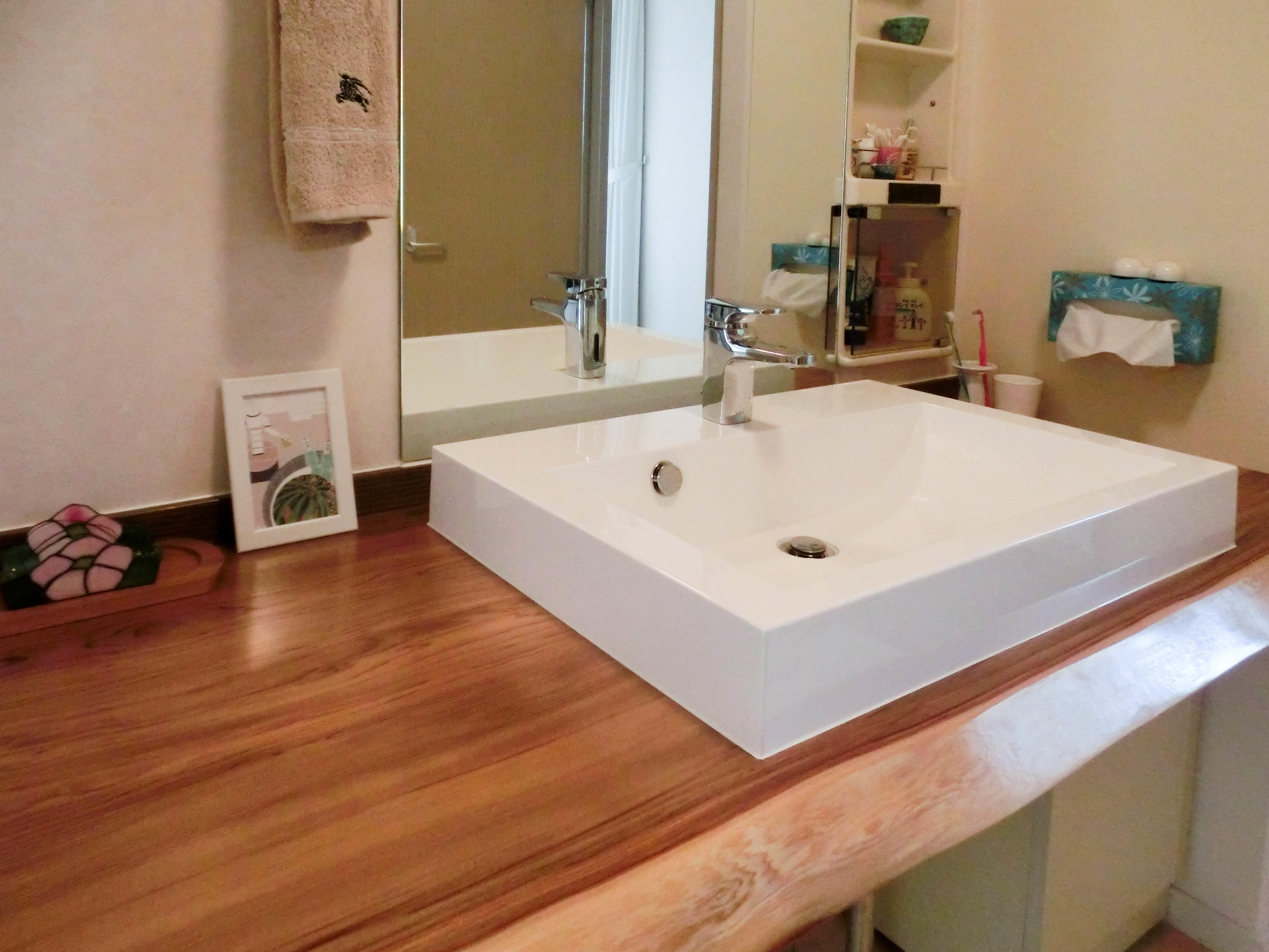 洗面は造作。こだわりのカウンターは、お施主様と木材屋さんにいき、実際に手で触れながら決めたものです。手触りのいい、趣のある洗面台が完成しました。