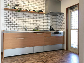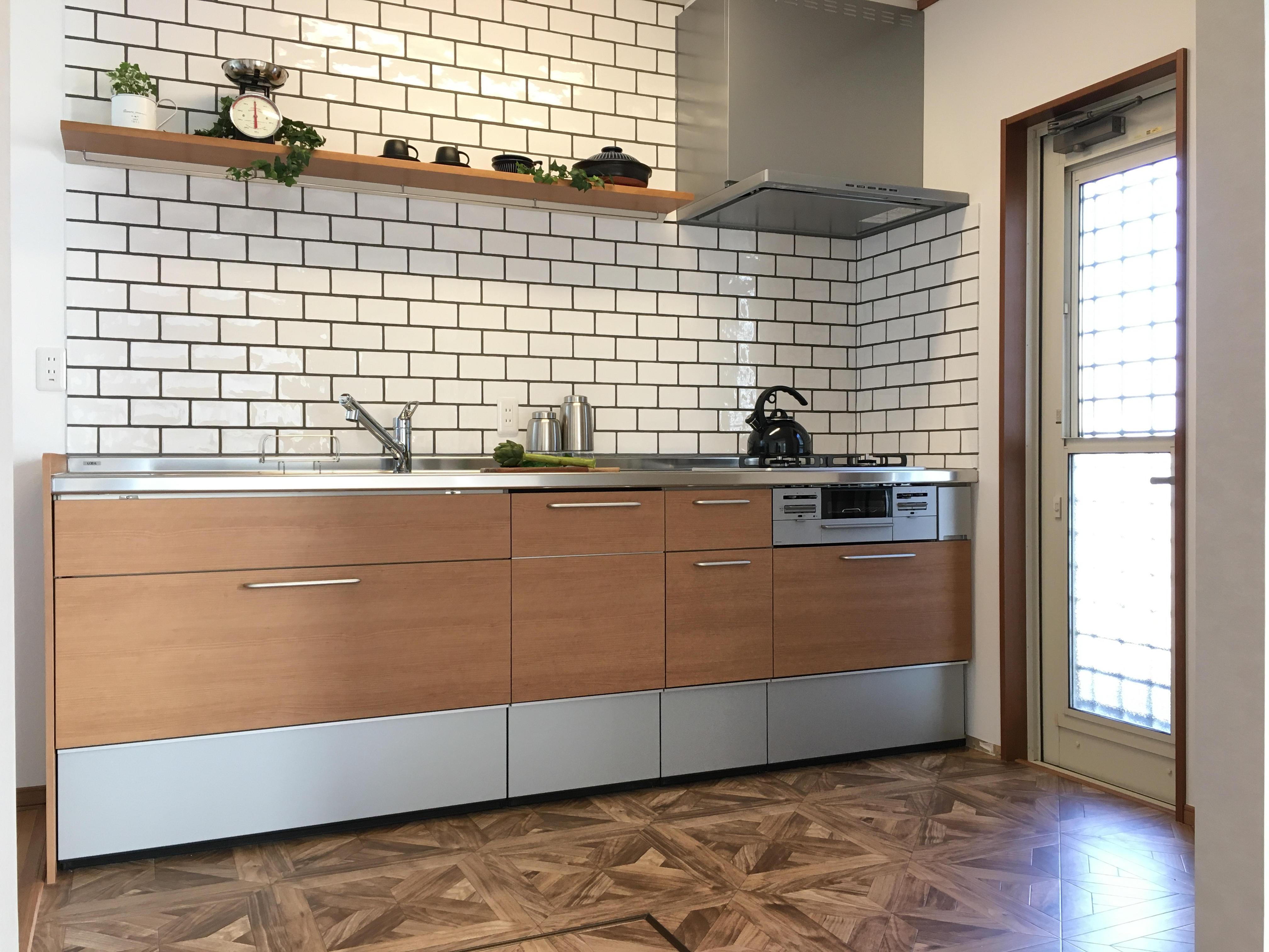 キッチン前のタイルはお施主様のこだわり。目地の色がグレーを選ばれているのもおしゃれなポイント!床は、パーケットフロアのダーク色をクッションフロアに選びタイルと合わせておしゃれな空間に。家事も楽しく取り組めそうです!