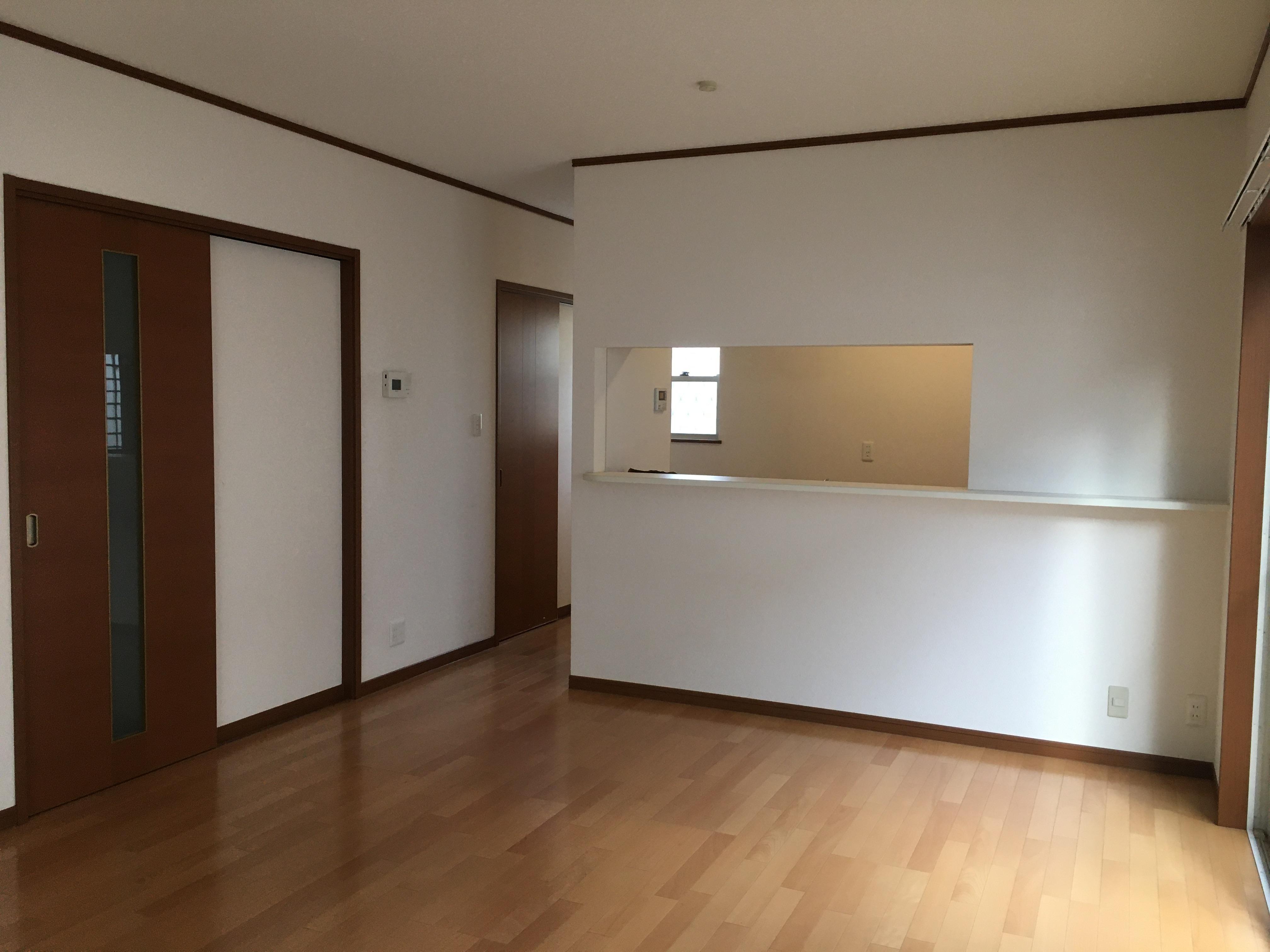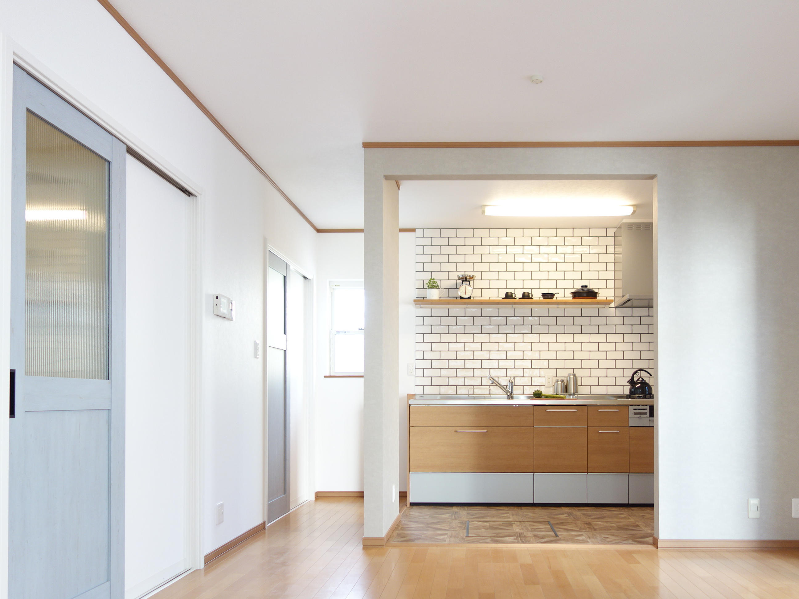 キッチンとダイニング間の壁は、構造上解体が出来ないため、残すことになった。空間の切り替えでクロスをグレージュを使用し、オシャレ感をアップ。建具の色合いとイメージが合います。建具は、LIXIL パレットのブルーペイントを採用。