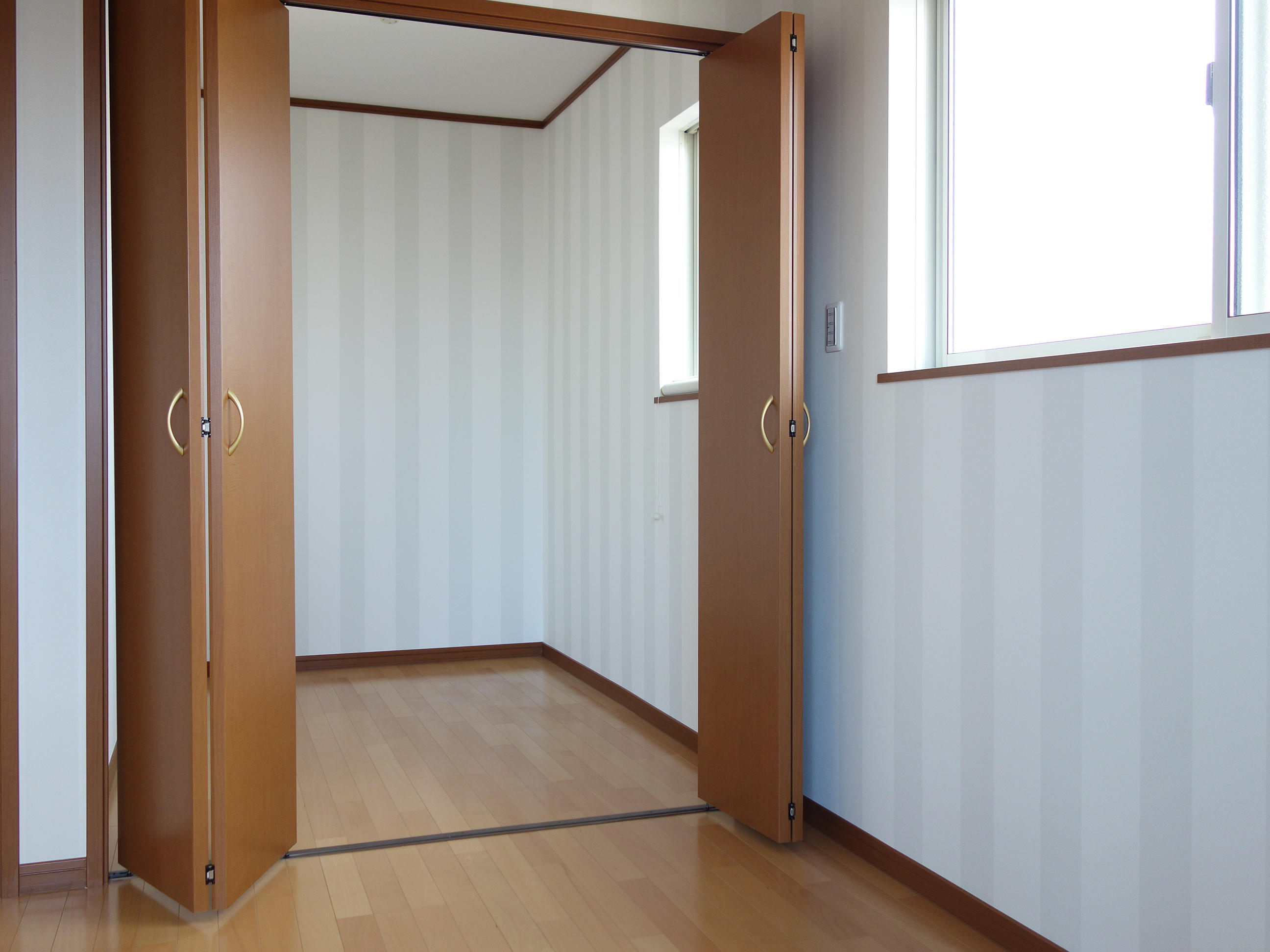 寝室とWICも大好きなストライプのクロス。寝室は7帖で天井は勾配天井で高く、WICは2.5帖とゆったりとした空間です。