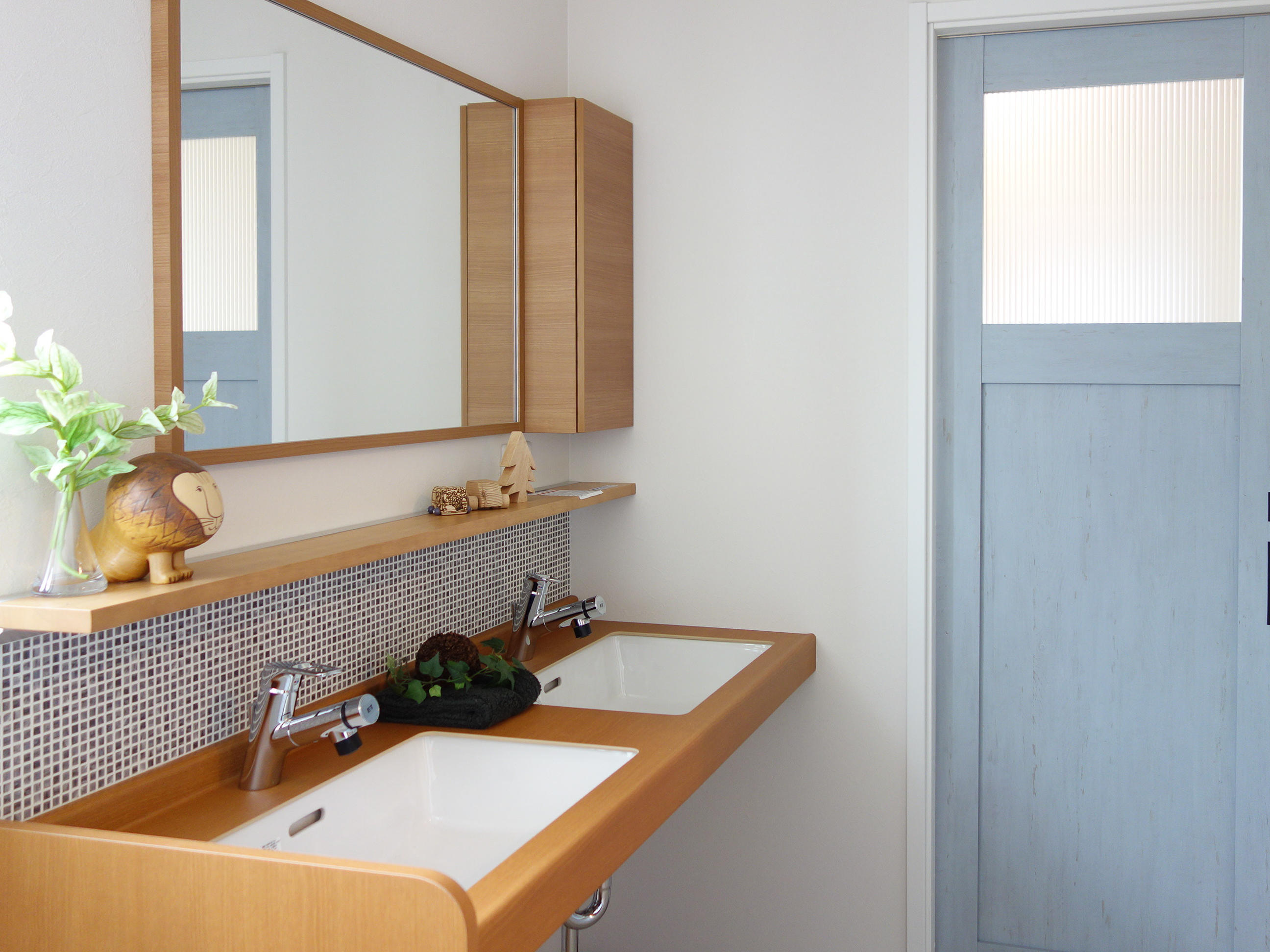 大家族のH様。朝の忙しい時期の洗面所混雑を回避するため、シンクを2台設置。大きな鏡も取付ました。洗面台前のモザイクタイル風のアクセントクロスで、ワンランク上のおしゃれな洗面所が完成しました。
