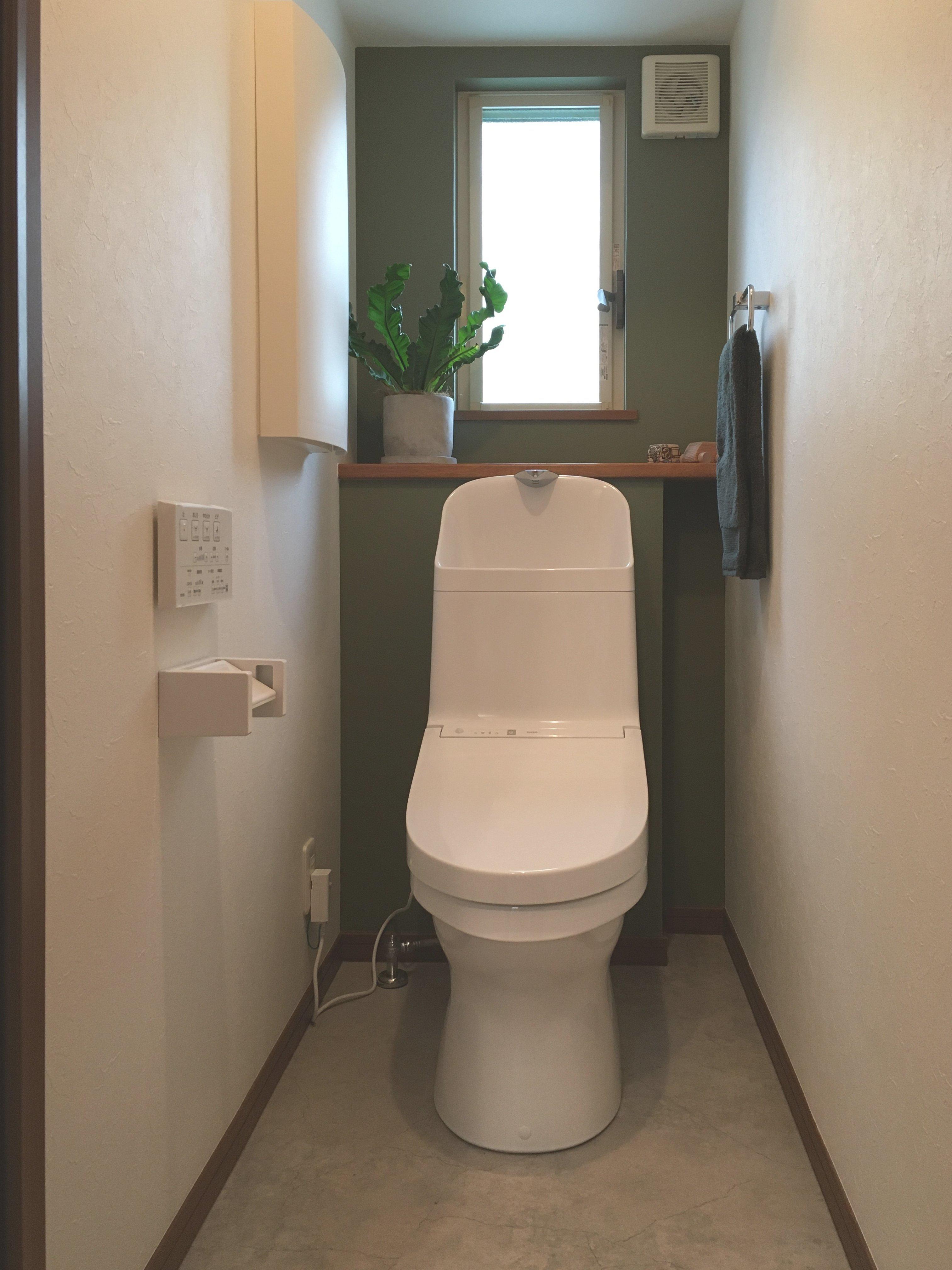 アクセントクロスにオリーブ色。床にはモルタル調のクッションフロアを採用。