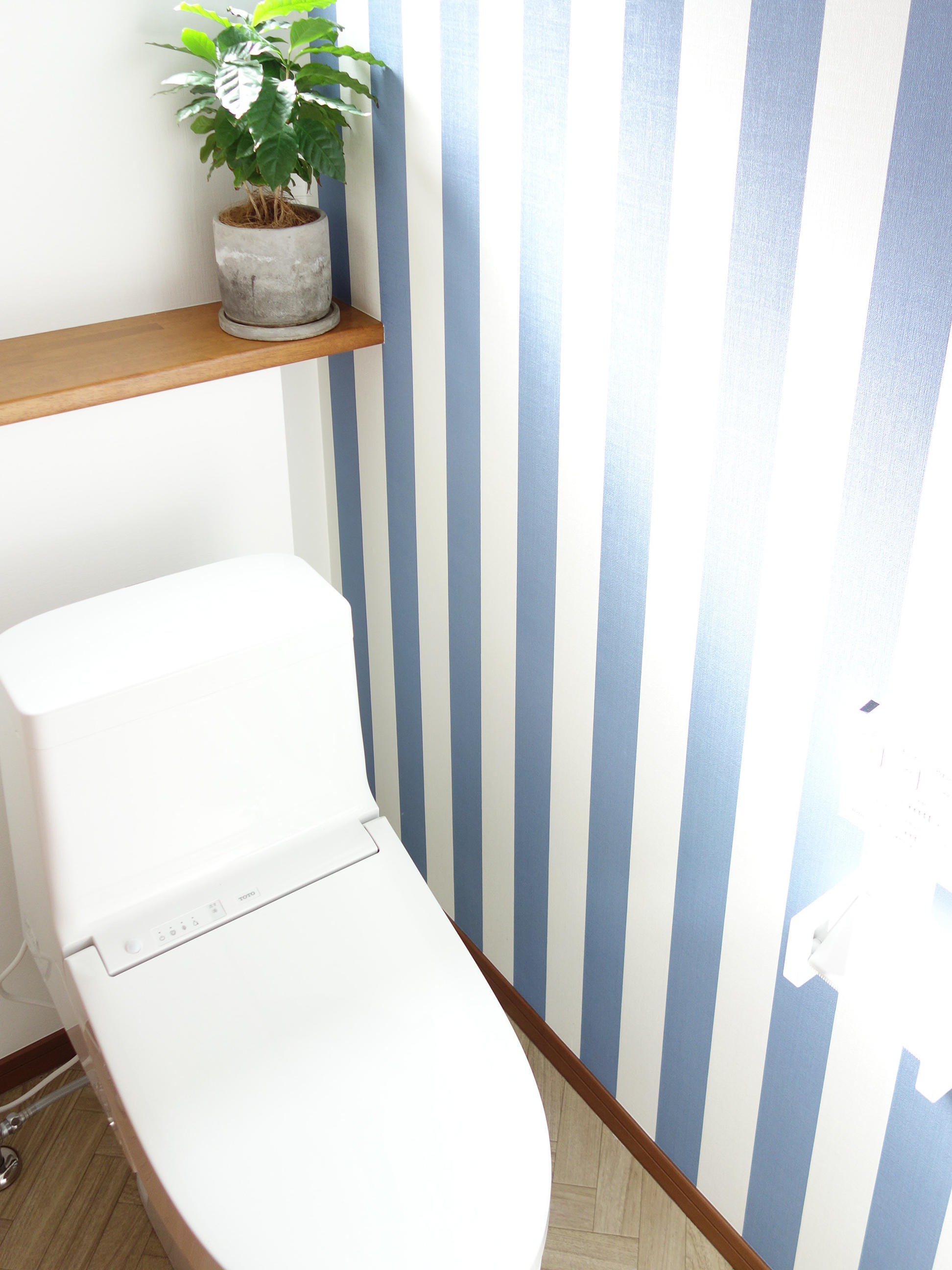 青ストライプのアクセントクロスがトイレを明るい空間にします。床にはヘリンボーンのクッションフロアを採用。