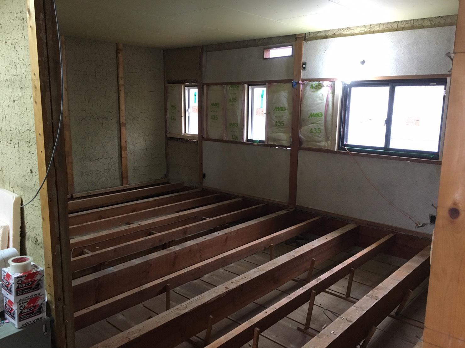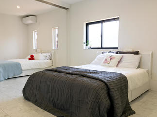 リビングからも見える主寝室はお子様の寝室と可動間仕切りで区分けしています。お子様が成長に応じて、大部屋にも2つの個室にもなるように作られています。現在は、お子様も小さい為、大空間の寝室として利用されています。勿論、窓サッシは断熱性の高いLIXILサーモスに交換しており断熱改善に配慮しています。