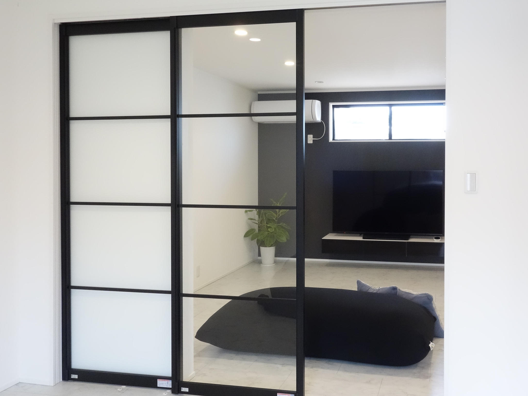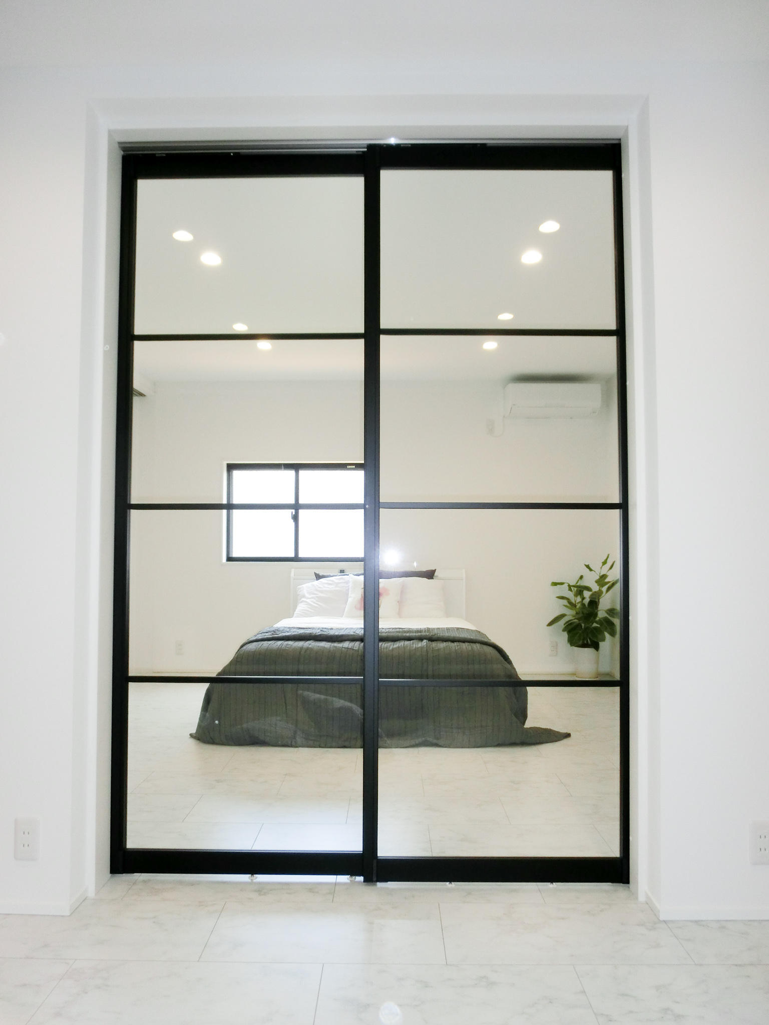 リビングと寝室を間仕切る扉にはLIXILのラシッサシリーズを採用。アイアンブラックのアルミフレームが際立つ透明ガラスの扉を選定しました。広い空間に見える様にあえて透明な間仕切りとしました。お互いの部屋が丸見えになるメリットとデメリットをよくお打合せさせて頂いた結果実現した空間です。「この眺めがリフォームした中で1番好きなんです」とお施主様。どこか異国のホテルを感じるような洗練された空間が仕上がりました。