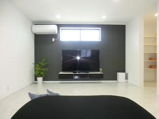 徹底してモノトーンの配色にこだわりアクセントクロスはブラック系を選びました。造作TVボードや家具も色合い統一させ、シンプルでかっこいい部屋に仕上がりました。フロートタイプのTVボードはルンバの為。お客様のこだわりです。北面に面している壁には高めの位置に窓を設け、安定した採光を通風を取り入れるものとしました。窓サッシには断熱性の高いLIXILのサーモスを採用しています。リビング横には大容量(4帖)のオープンなウォークインクローゼットがあり家族の衣類などは、すべてこちらに収納できます。