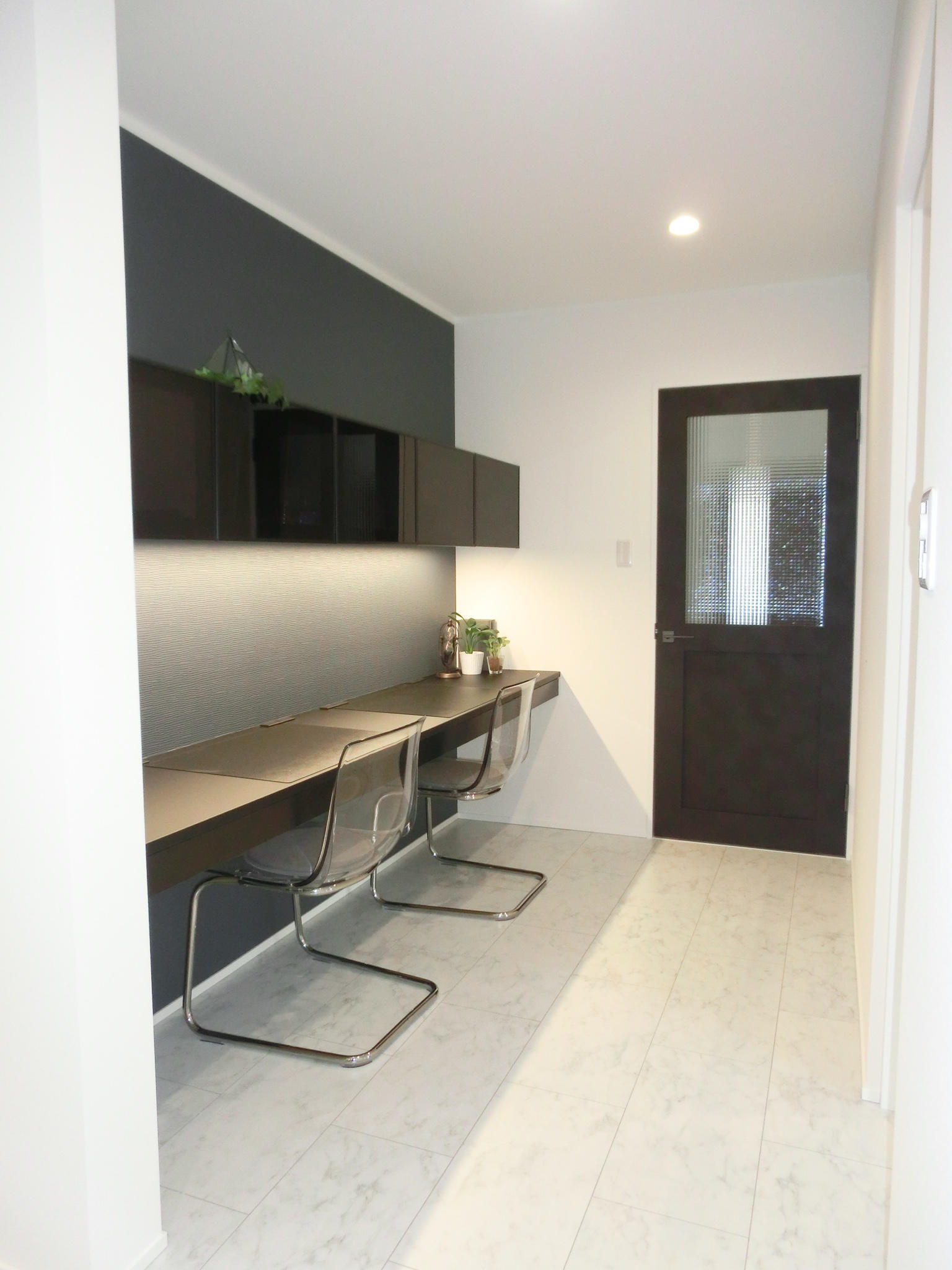 写真奥の扉は1階からの階段を上り2階の住居スペースへ入る入口です。入口扉はLIXILのラシッサDシリーズ、ヴィティアのチャコールブラックを採用。広めの廊下となるスペースには家族がフリーで使えるカウンターを併設。リモートワークやお子様の勉強机として最適です。勉強中は見たくてもTVが視界に入らない配置となっています。ここでもカウンター・収納・アクセントクロスはモノトーンにまとめ全体の白い空間を引き締めます。