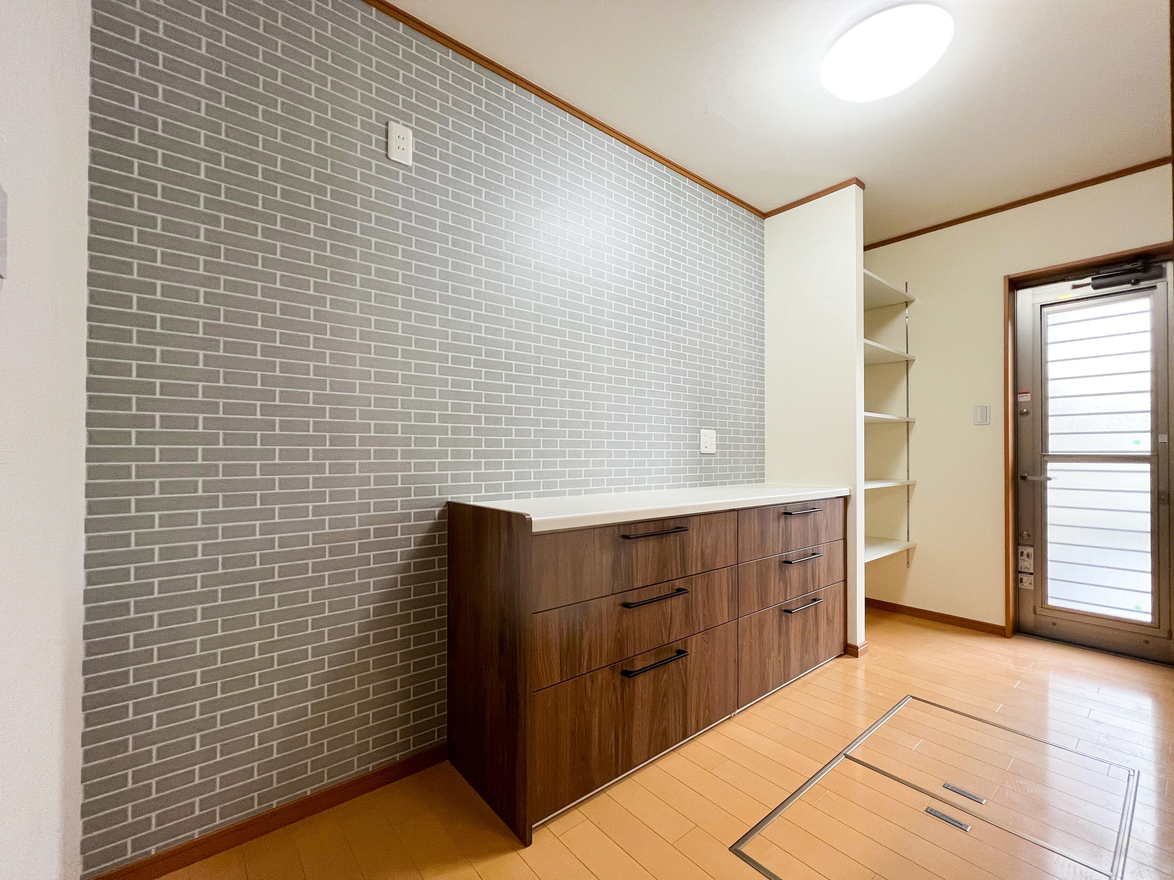 背面のクロスはリリカラ(LV3250)のグレーのレンガ調のクロスで、アクセントにしました。カップボード(LIXIL アレスタ)を締め色(ヴィンティアカラー)を選び空間を引き締めました。収納は、造作のパントリーで大容量のものが収納できるようになりました。キッチンの背面がおしゃれなカフェのような雰囲気に仕上がり、リビング全体の雰囲気も変わります。