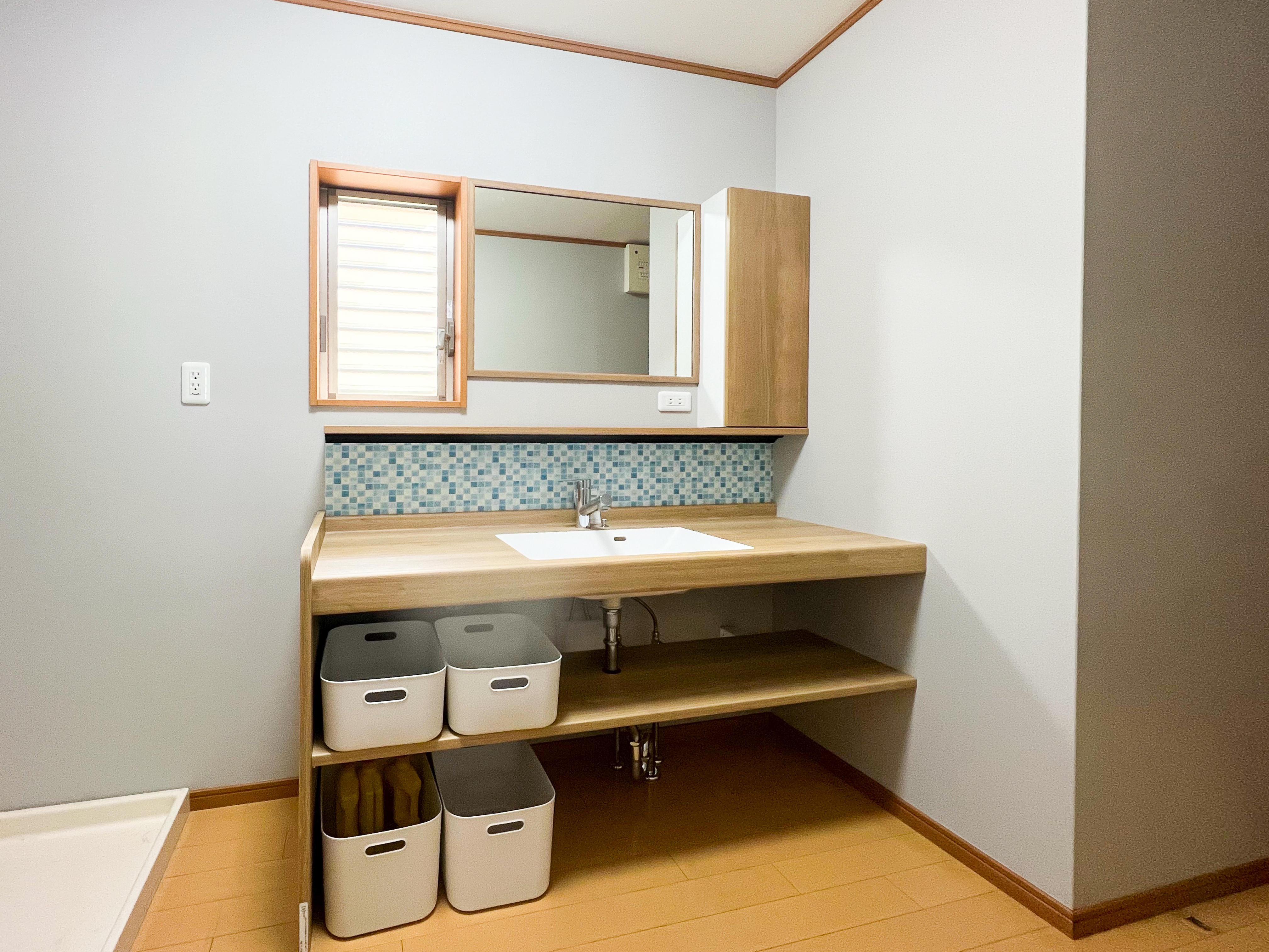 洗面所はオープンタイプ。ゆったりサイズで木目調のオープンタイプがご希望で、カウンターとボウルはアイカを採用しました。それに合わせ、リクシルの木枠付きミラーを採用し、開放的な洗面台が完成。木目の色合いに合わせ、グレーのクロスを選ばれ落ち着いた洗面スペースが完成しました。ミラーとカウンターの間の水色のモザイクタイル調のクロスがアクセントになり、素敵ですね♪