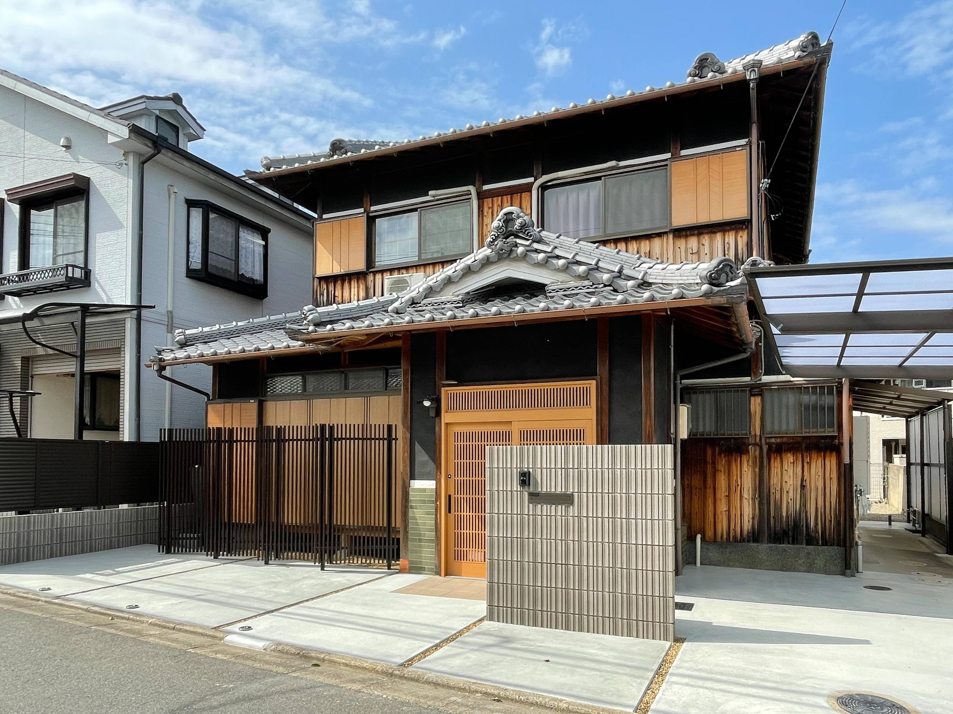 見とれてしまうような美しい外観です。以前はブロックと生垣で囲まれた閉鎖的な外構でしたが、おもいきってオープン外構にしました。道路に面している縁側を格子のフェンスを斜めに配置し、外からの目隠し効果をあげています。もともとの昔ながらの瓦の屋根と焼き板の外壁との調和を考え玄関扉やエクステリアを選んだっことで、すっきりしながらあたたかみのあるお家が完成しました。玄関灯はお施主様のこだわりの1つだとのこと。レトロな雰囲気がとてもよく合います。