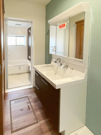 洗面所と浴室空間。水廻りは古くなっていたのですべて新しくしました。洗面化粧台はLIIXLピアラ。浴室はLIXILアライズを採用。洗面化粧台の扉面と浴室のアクセントパネルをクリエモカを選択し、空間に統一感を出しました。洗面所の一面をくすみブルーのアクセントクロスにし、空間をおしゃれにまとめています。