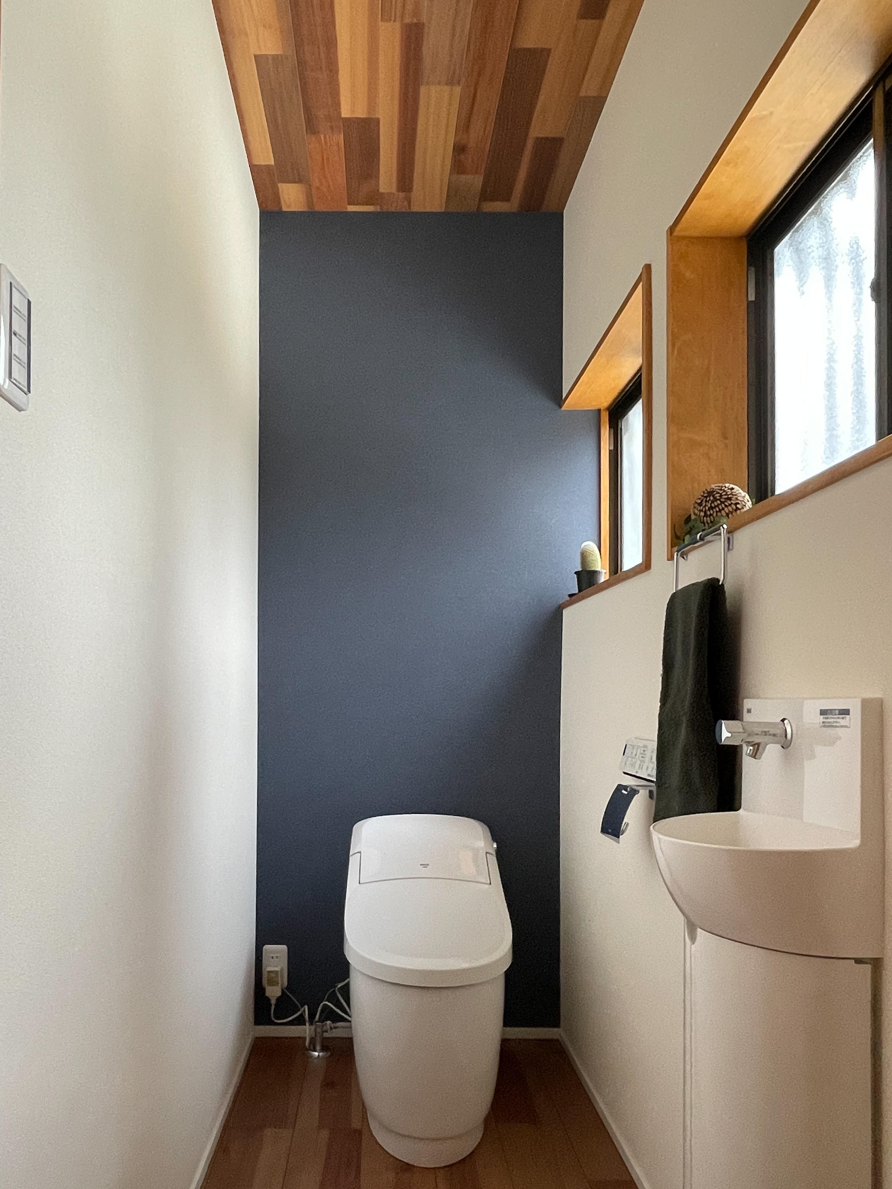 トイレ空間は、ヴィンテージ感のあるかっこいい空間にまとまりました。トイレはLIXILのプレアスSタイプを採用。アクセントクロスのネイビーと天井の木目調のクロスの相性は抜群です。もともとある2つの窓から光が入り、明るいトイレ空間が完成しました。