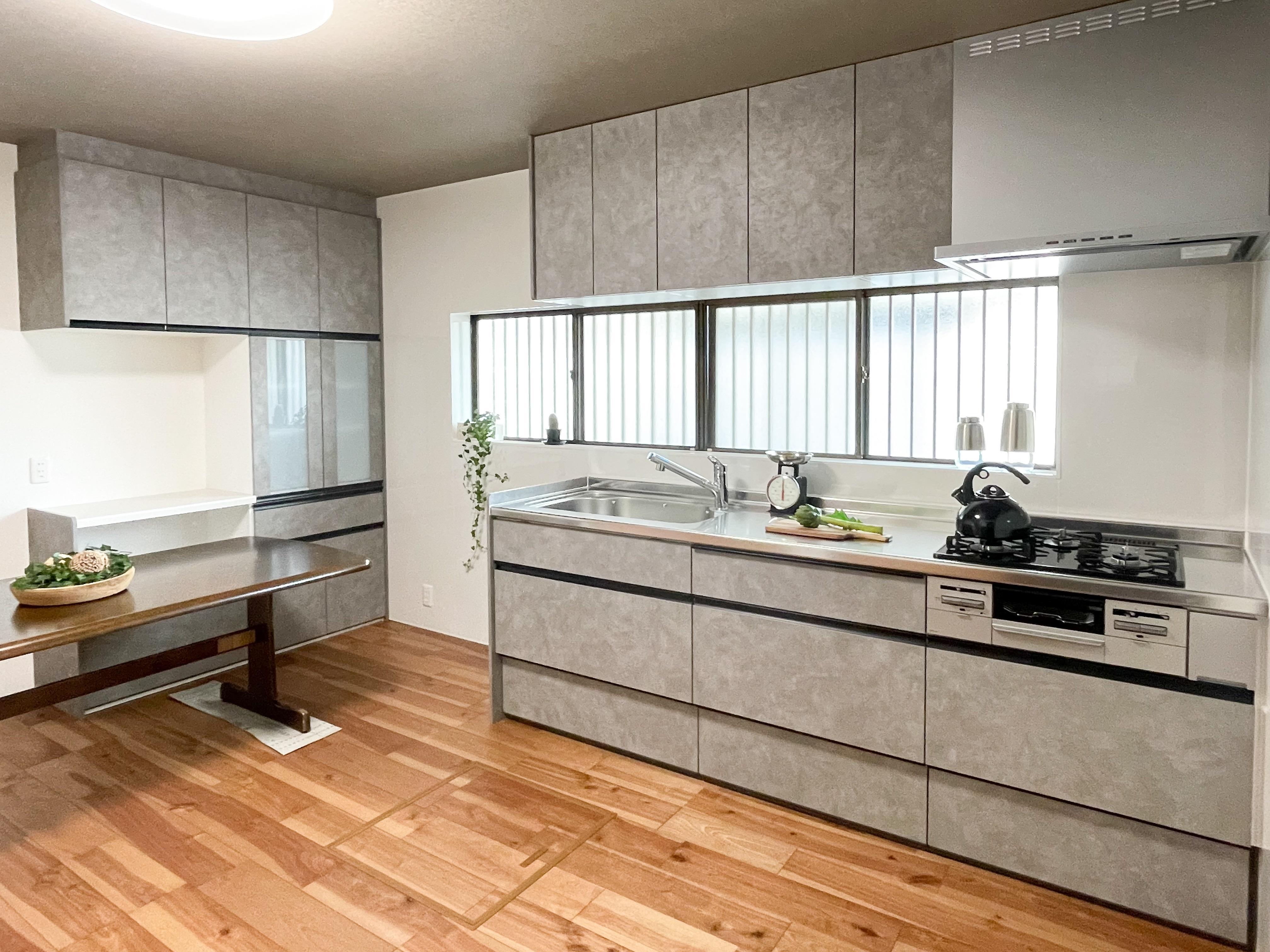 キッチンはLIXILアレスタを採用しました。カップボード共に、扉面をグレージュスタッコ色で統一し、それに合わせ天井色もグレー色のクロスはおしゃれ感がUPします。床には木目模様が美しいベリティス(Panasonic)のバーチラスティック色を選びました。