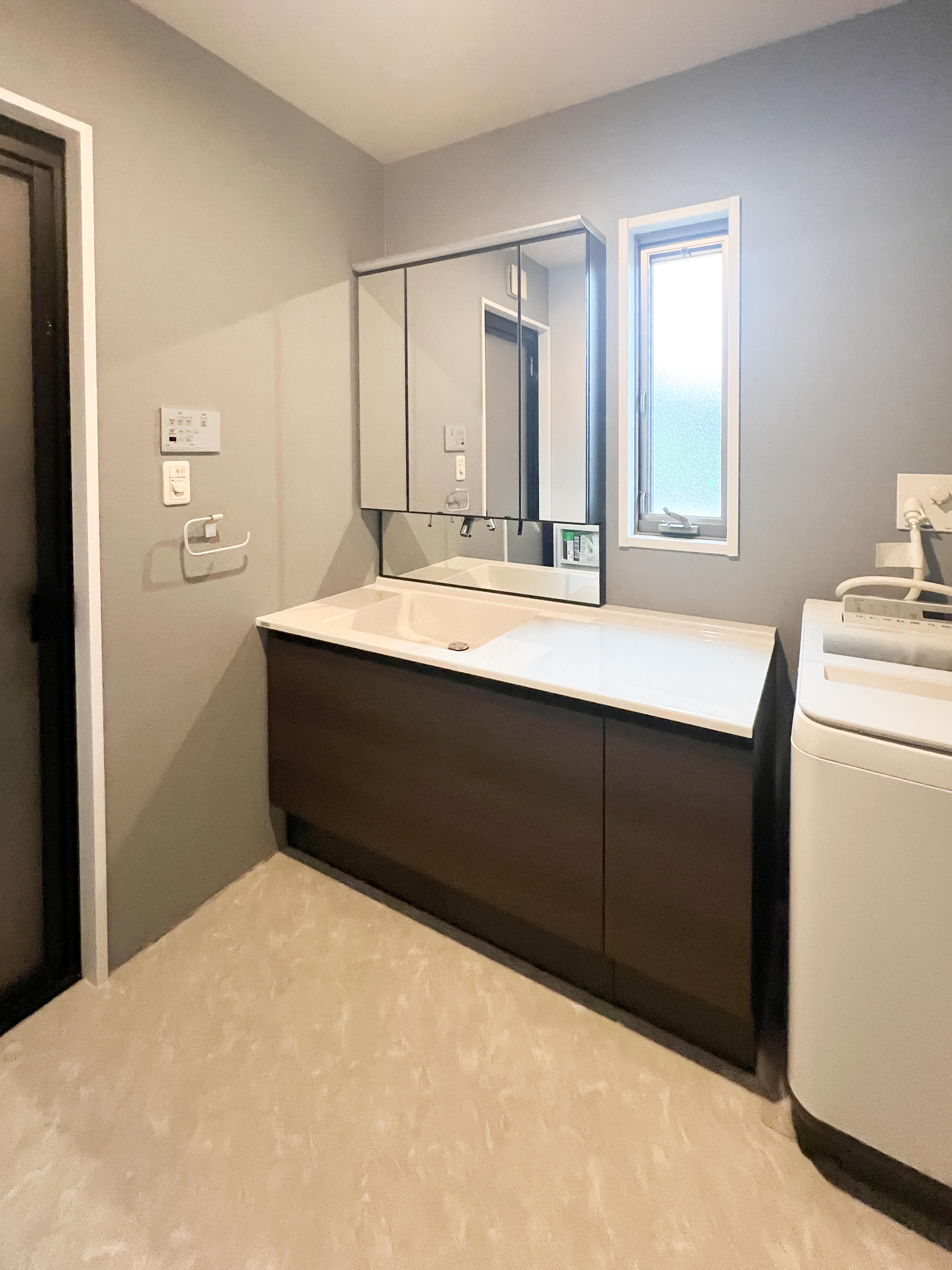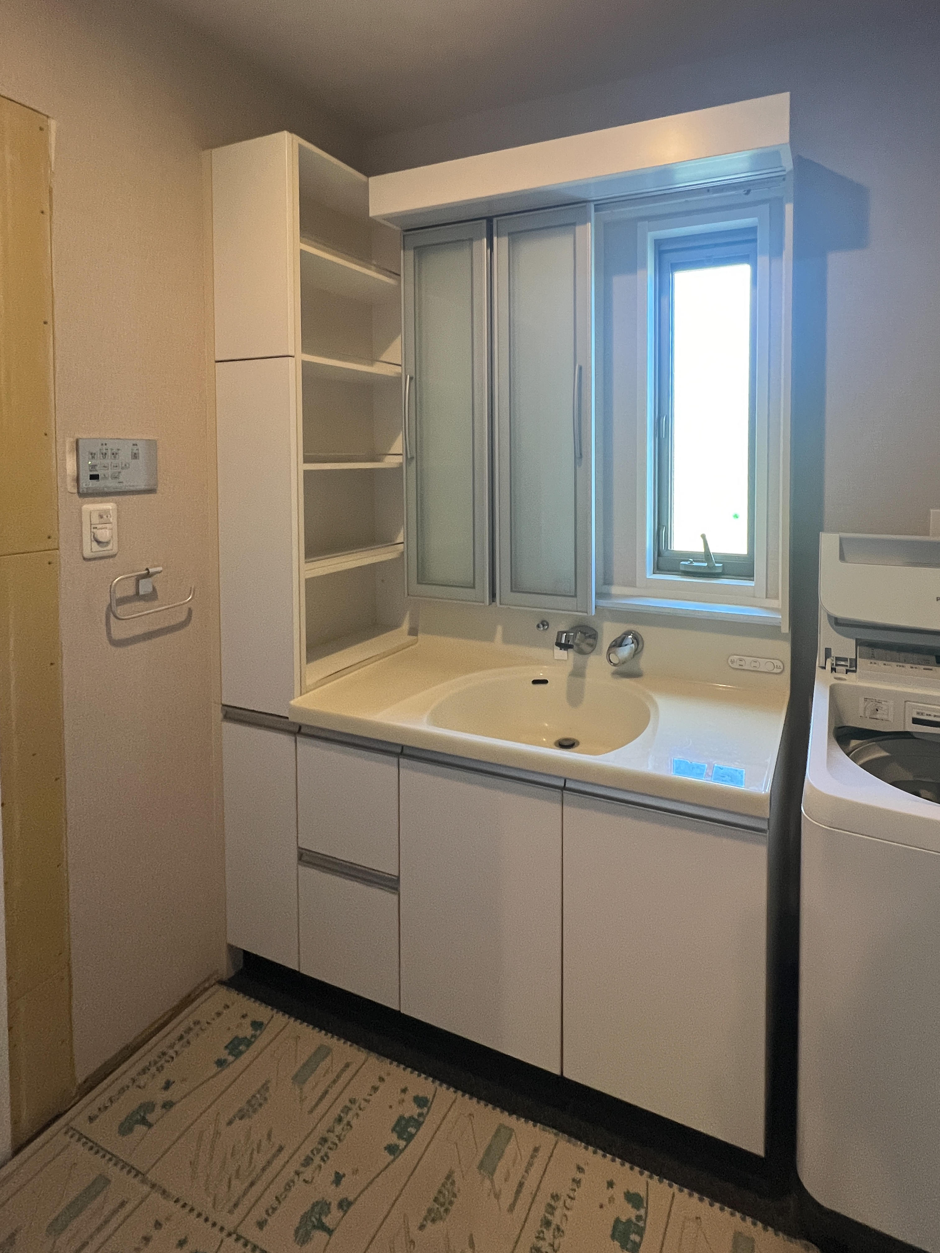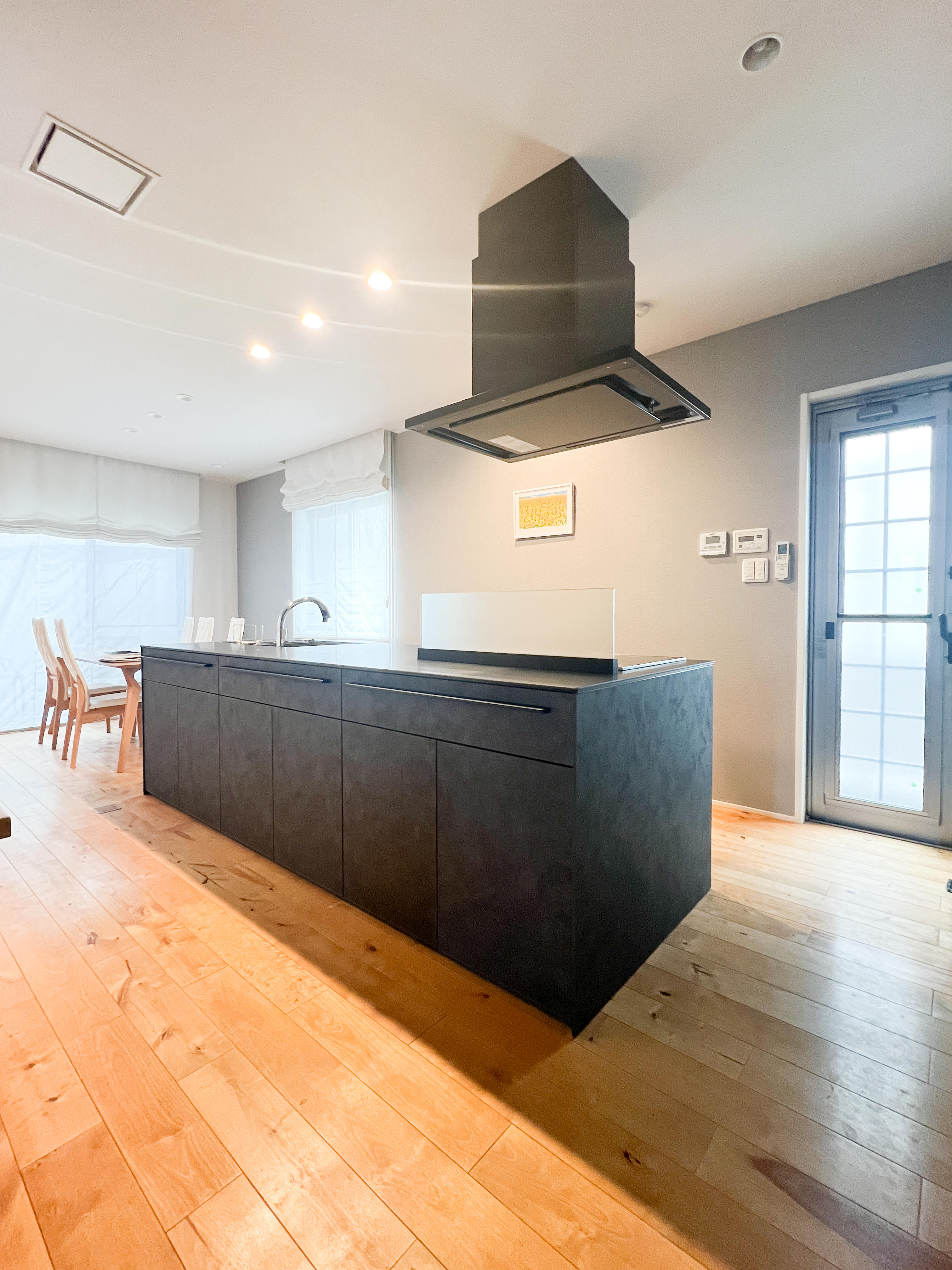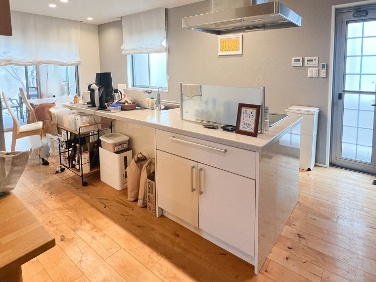 設備機器はまだまだご使用いただける状態でしたが、中古物件での購入という事もあり新しくしたいとのご希望でした。 以前使用していたキッチンの機能で残したい機能は新しいキッチンでも採用をし、より多くの物を入れられるように収納スペースを増やしました。 もともとキッチン近くの床下コンセントから延長コードをつないでミキサーやコーヒーメーカーを使用されていたので、造作でキッチン横にコンセントを取り付ける提案をいたしました。それによって、足元をスッキリさせられるだけでなく安全性も確保できました。